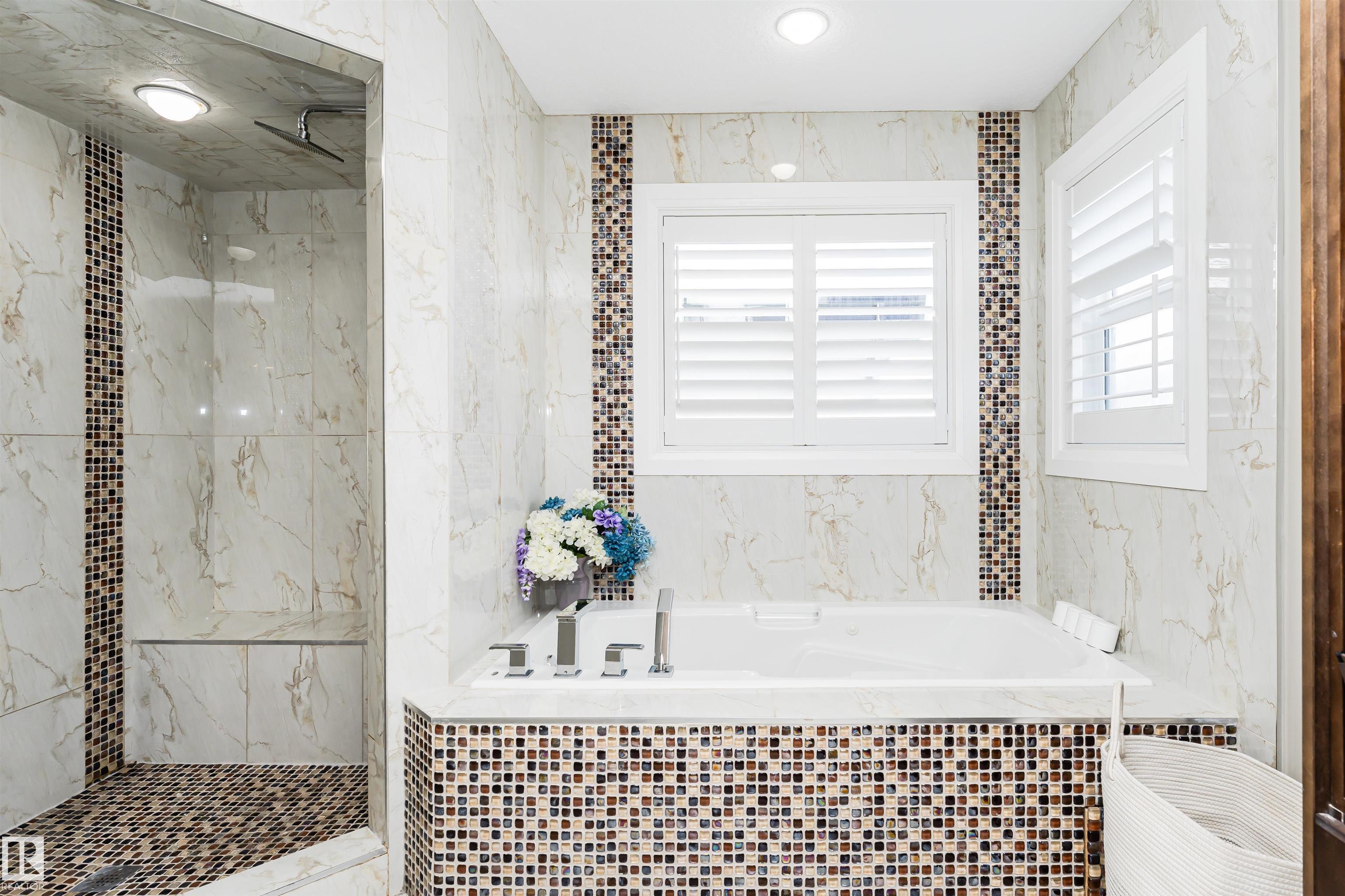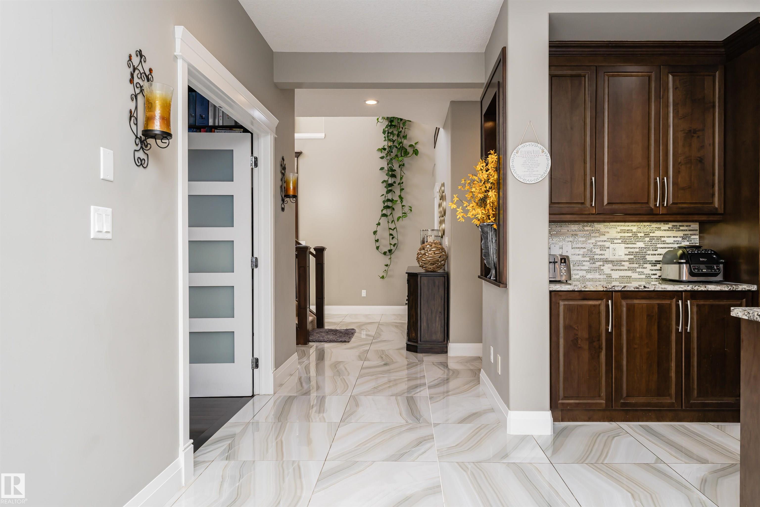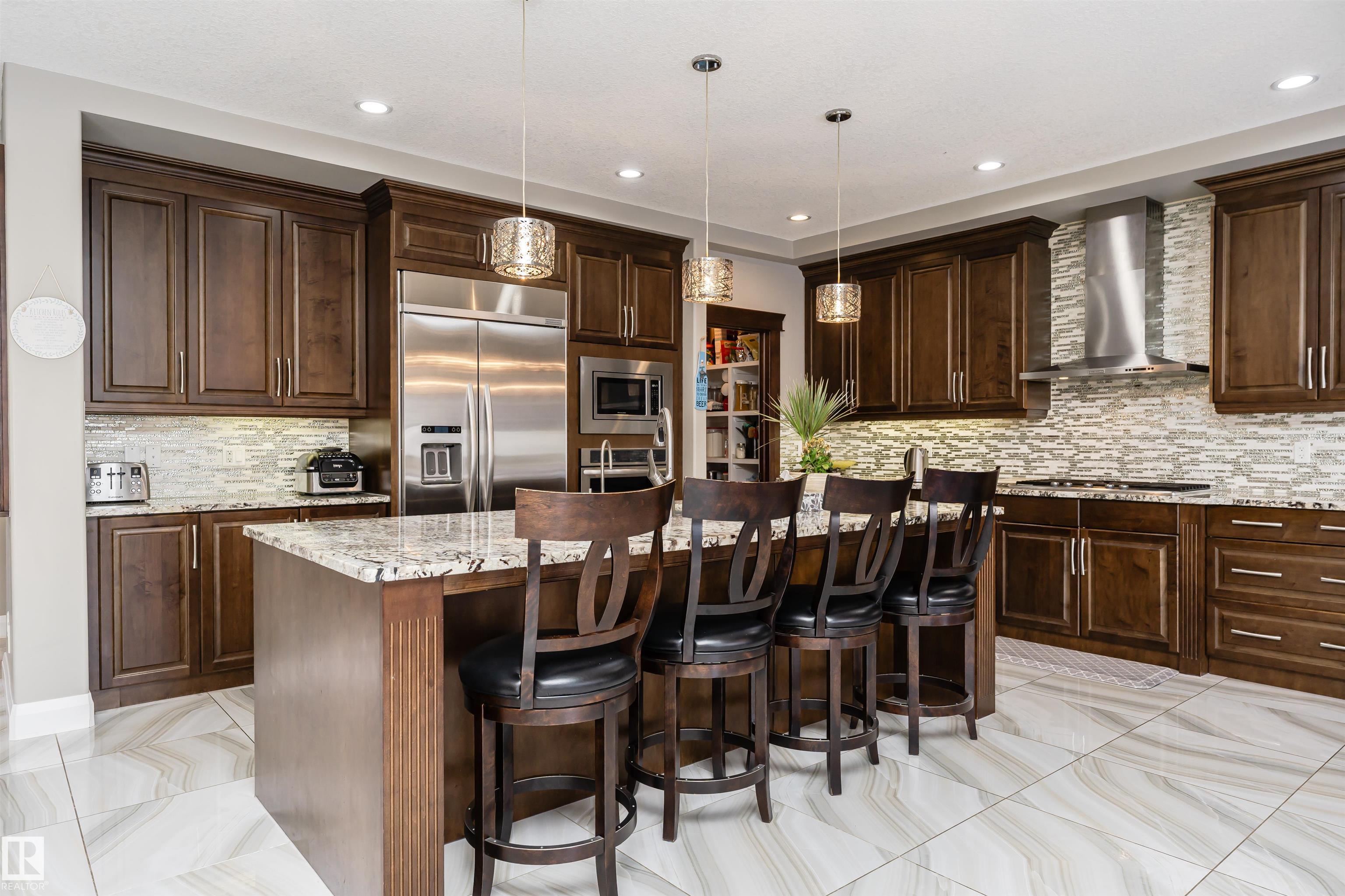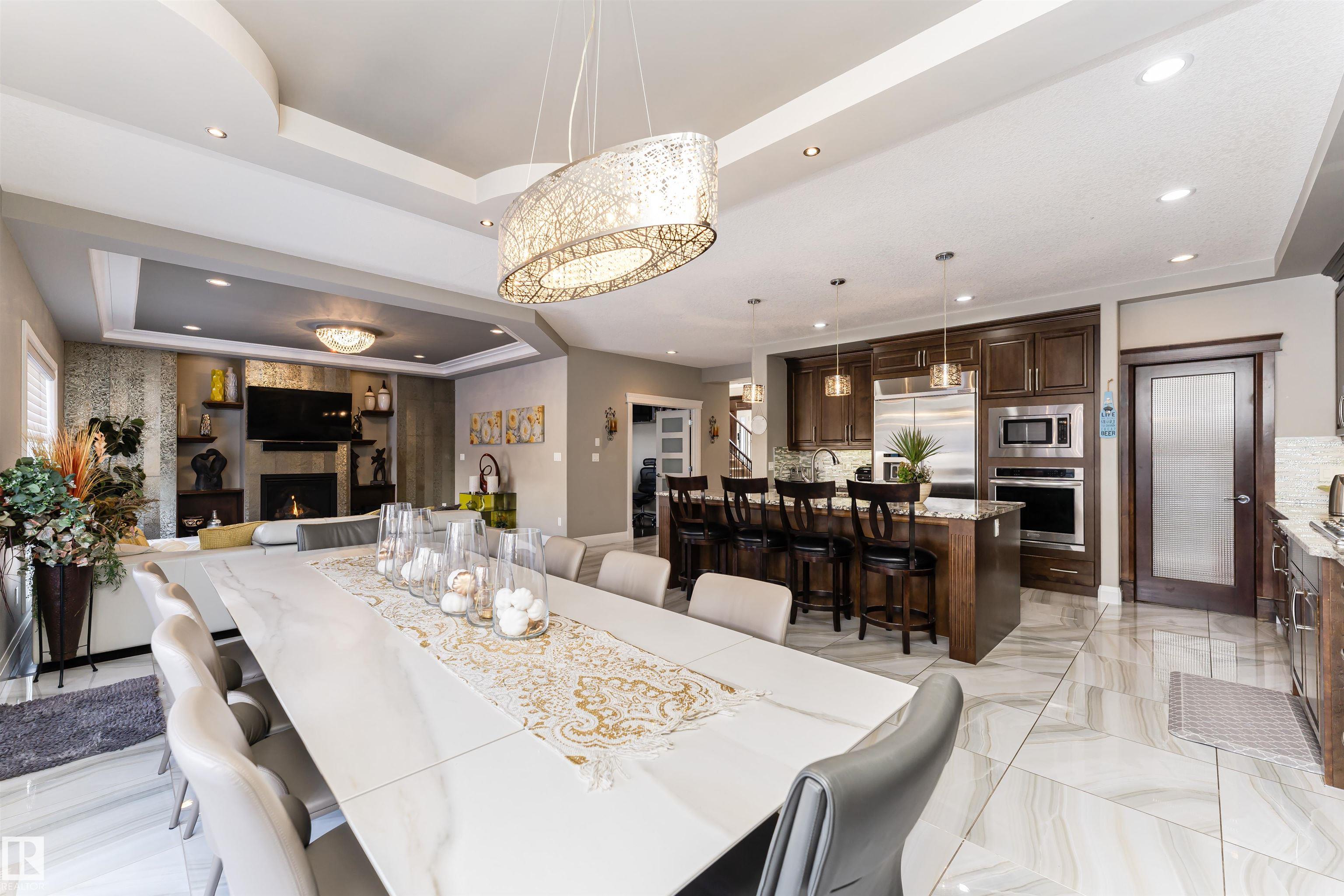 Stunning, 2-story mansion offers a total of 4460 sqft of living space! With incredible attention to detail, this custom home features marble-accented tiles, exotic granite, LED steps/under-counter lighting, crown mouldings & spectacular ceiling designs throughout. The main level features a magnificent living rm, a spacious den, a 4pc bath & a laundry w/sink. The living rm has a dramatic tile feature wall with a gas fireplace. Chef's dream kitchen w/ample charcoal maple cabinetry, large island, wet bar, large pantry & dining area. Upgraded wood/metal staircase leads to the lavish primary suite, which boasts a gas fireplace, a spa-like ensuite w/H&Hs sinks, a Jetted Jacuzzi, a custom mosaic steam shower, and H&Hs closets. To follow, 2 more beds w/J&J bath, another 2pc bath, and a bonus rm with cathedral ceilings. Basement secondary suite with a separate entrance, 2 oversized beds, Kitchen, living rm, full bath & laundry. ÿTriple garage, excellent curb appeal, fully landscaped backyard, deck, and a shed.
