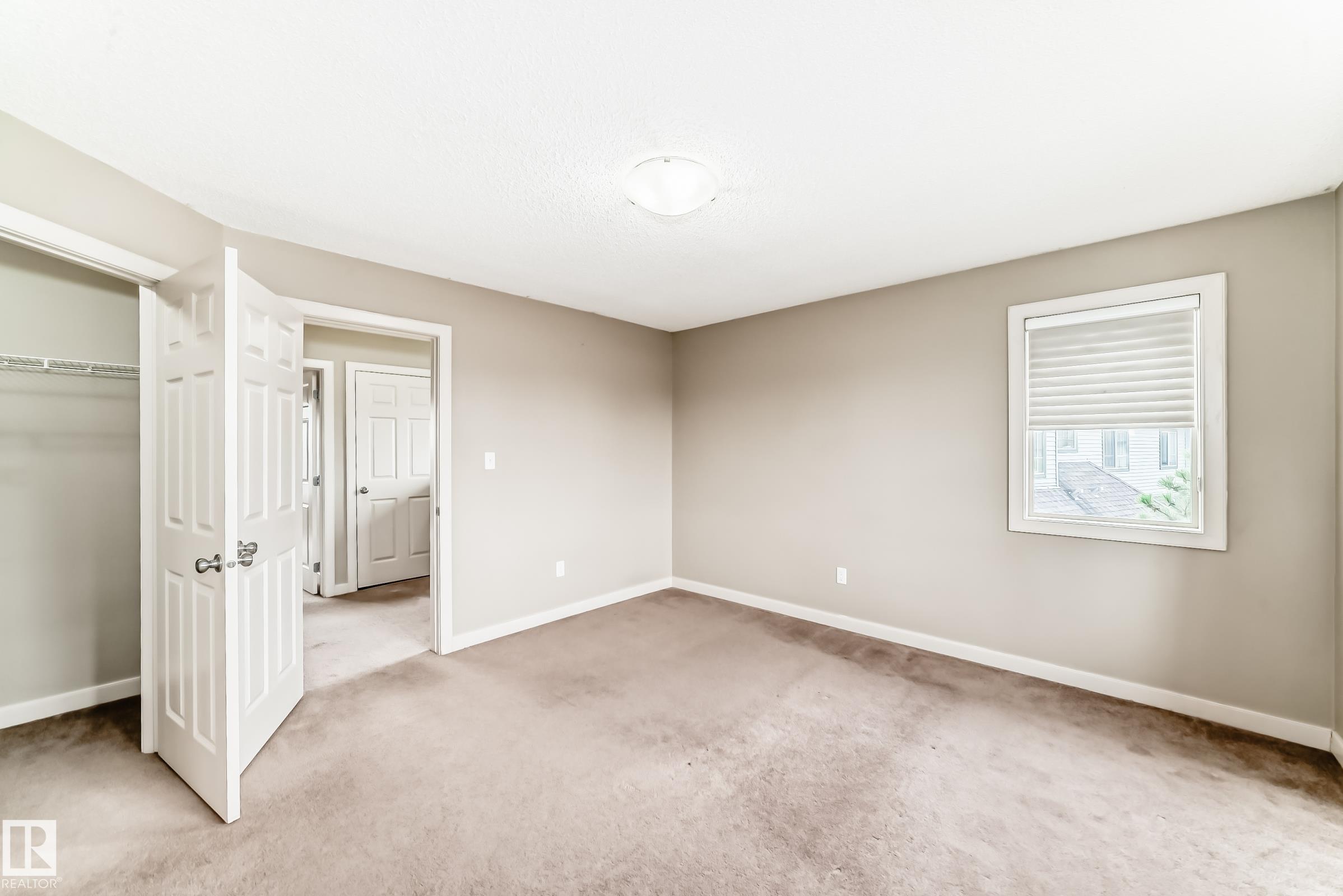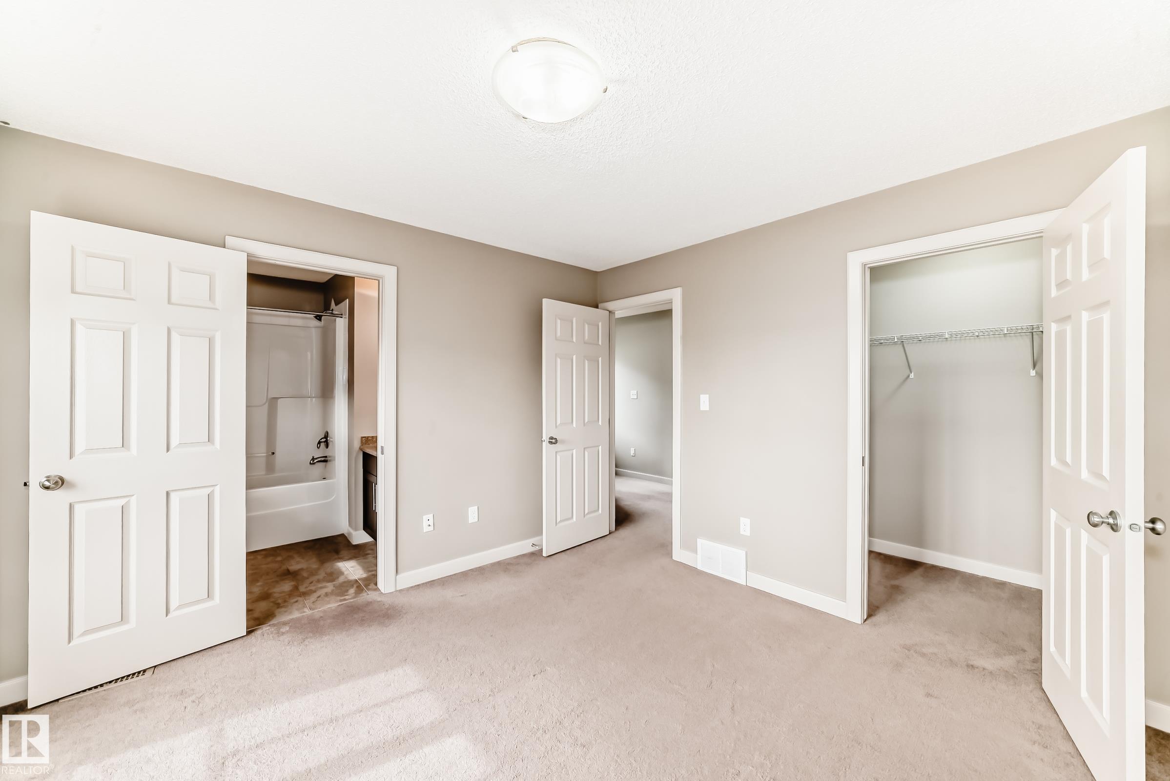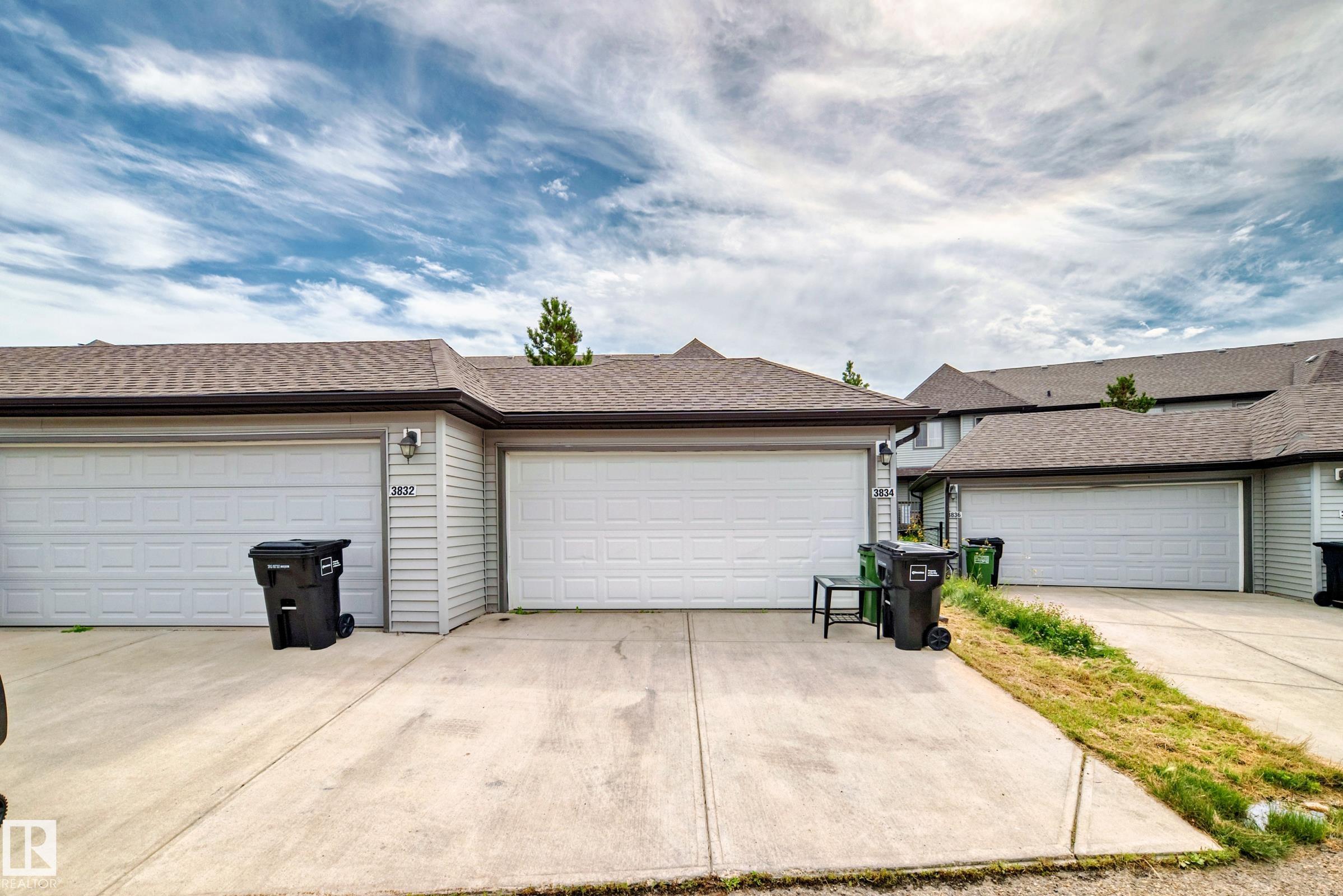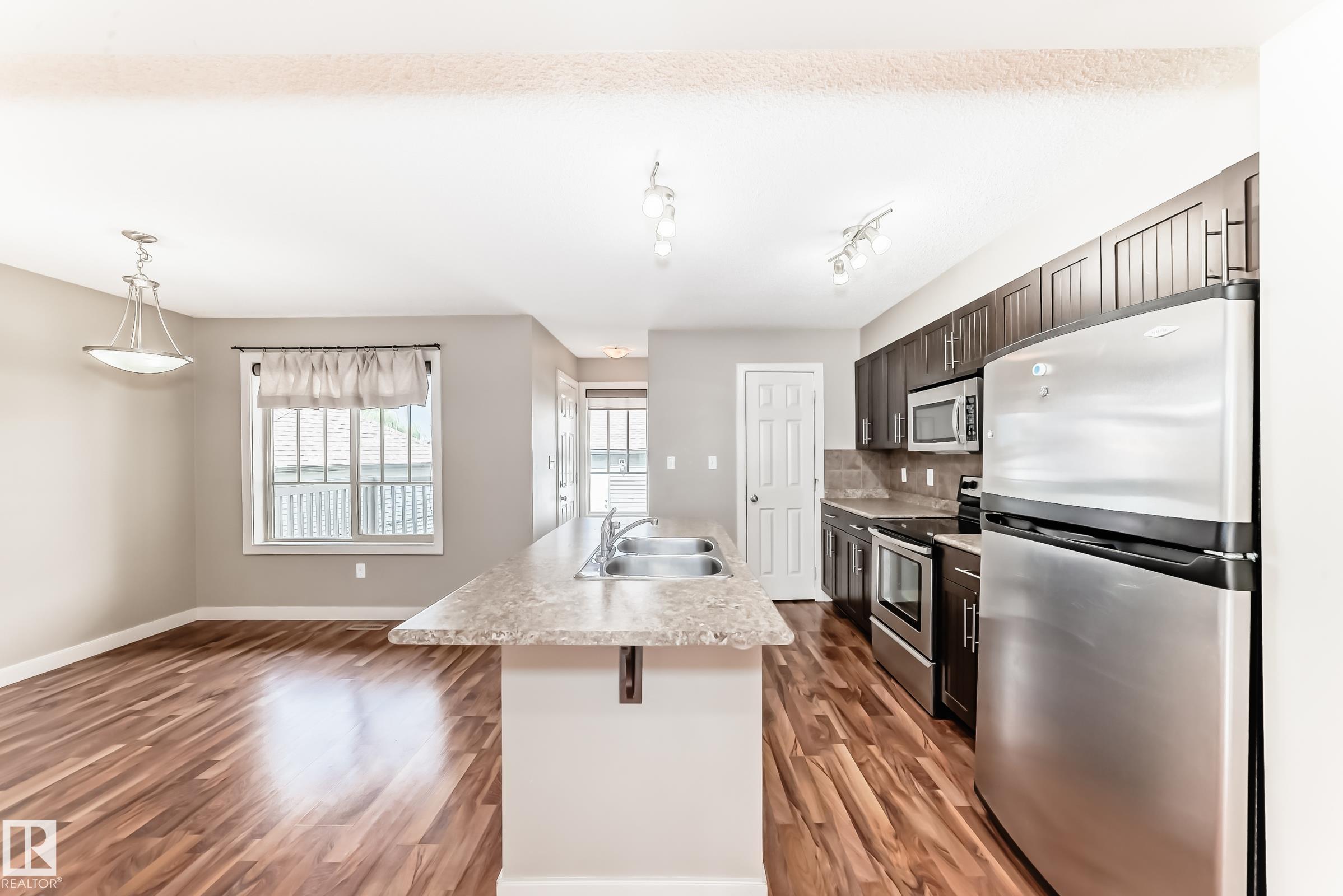 End Unit - NO Condo Fees! This well-maintained 2-bedroom, 2.5-bath home is ideally located in the sought-after Ambleside community. The main floor boasts an open-concept design with a modern kitchen featuring sleek countertops and ample cabinetry. Upstairs, you'll find two spacious bedrooms--each with its own 4-piece ensuite and walk-in closet--plus the convenience of second-floor laundry. Enjoy your private backyard with a deck, perfect for relaxing or entertaining, along with the added bonus of a double detached garage. Situated directly across from Dr. Margaret-Ann Armour School, this home is just minutes from Windermere Currents shopping, dining, and entertainment, with quick access to Anthony Henday Drive and all nearby amenities. Welcome Home!