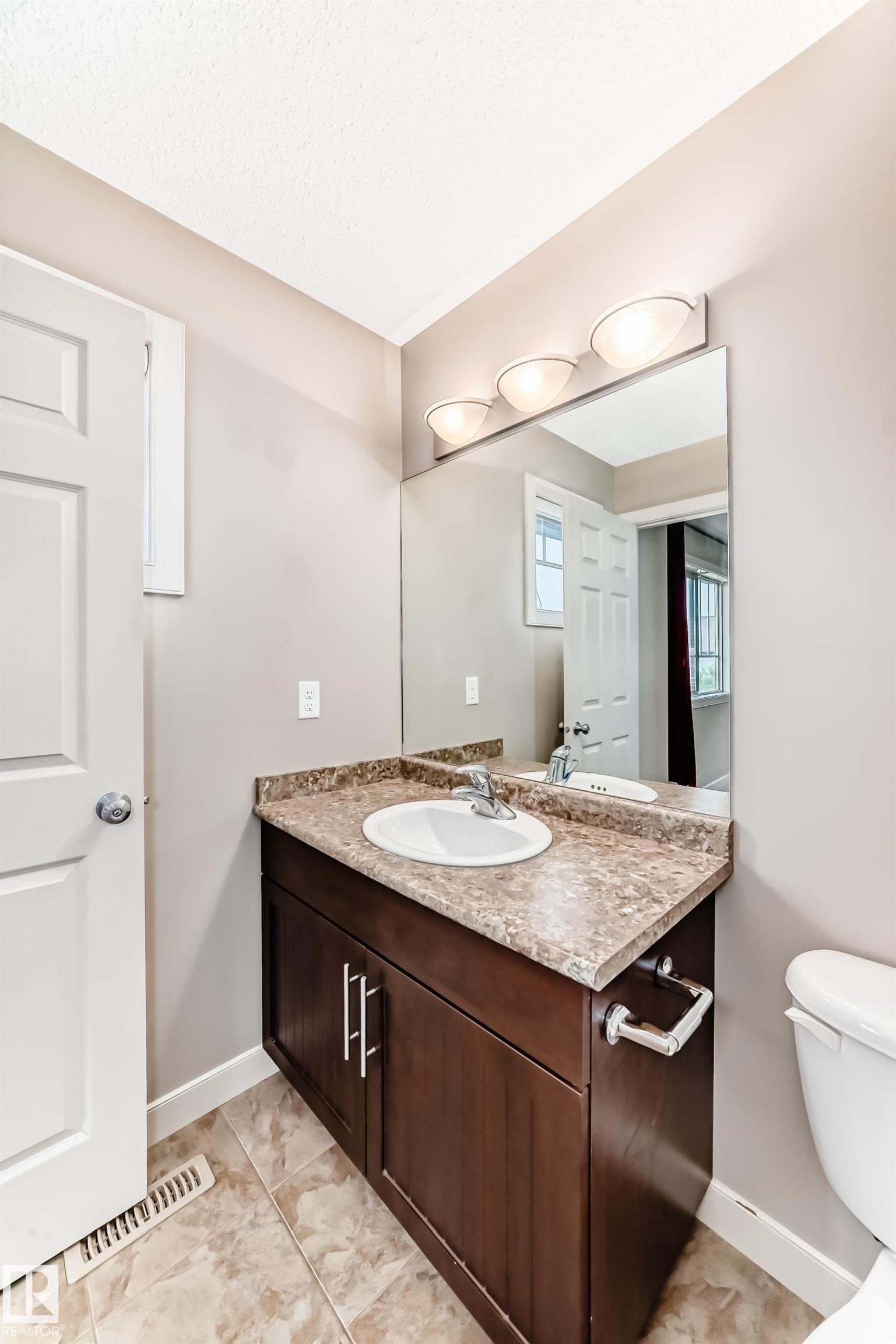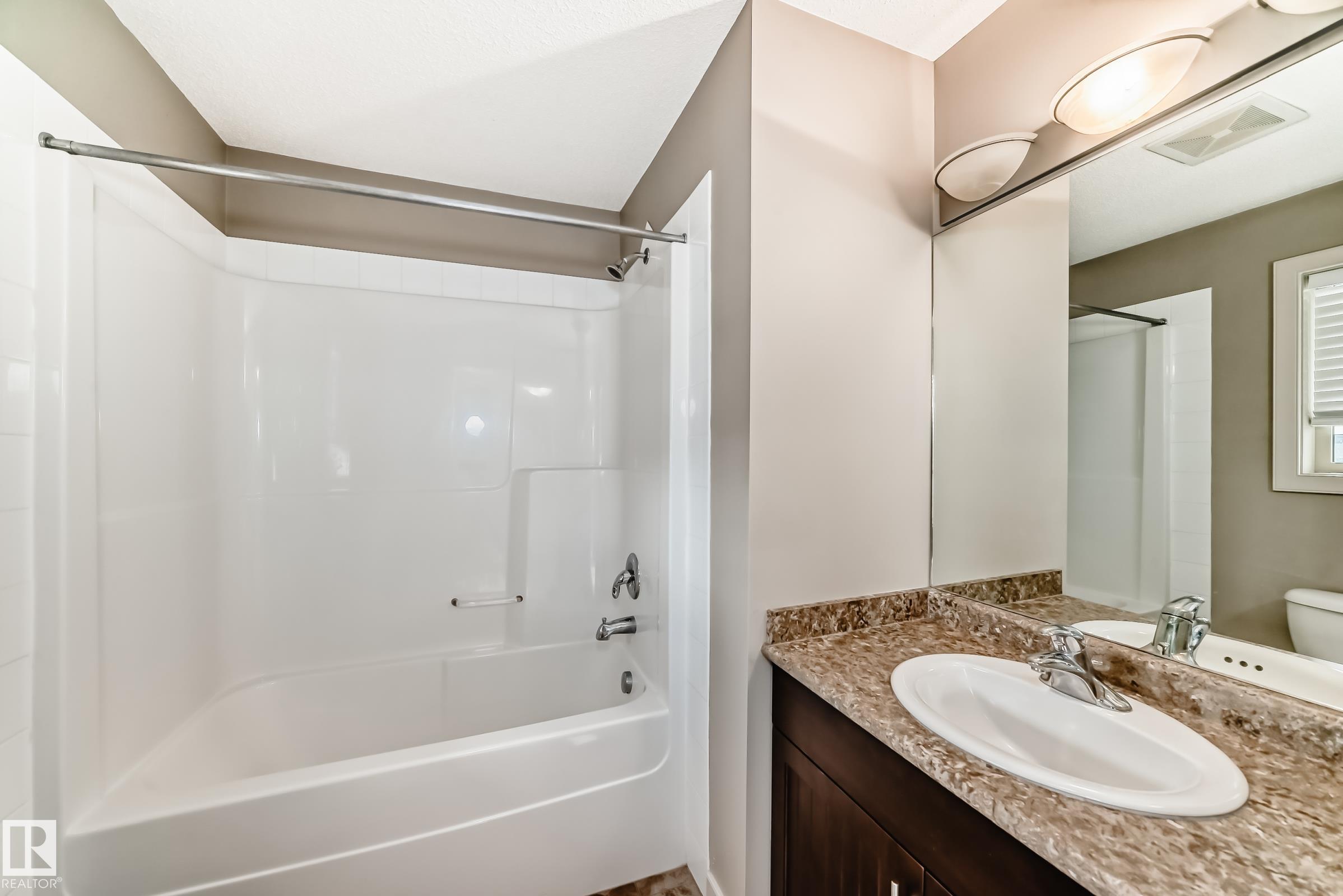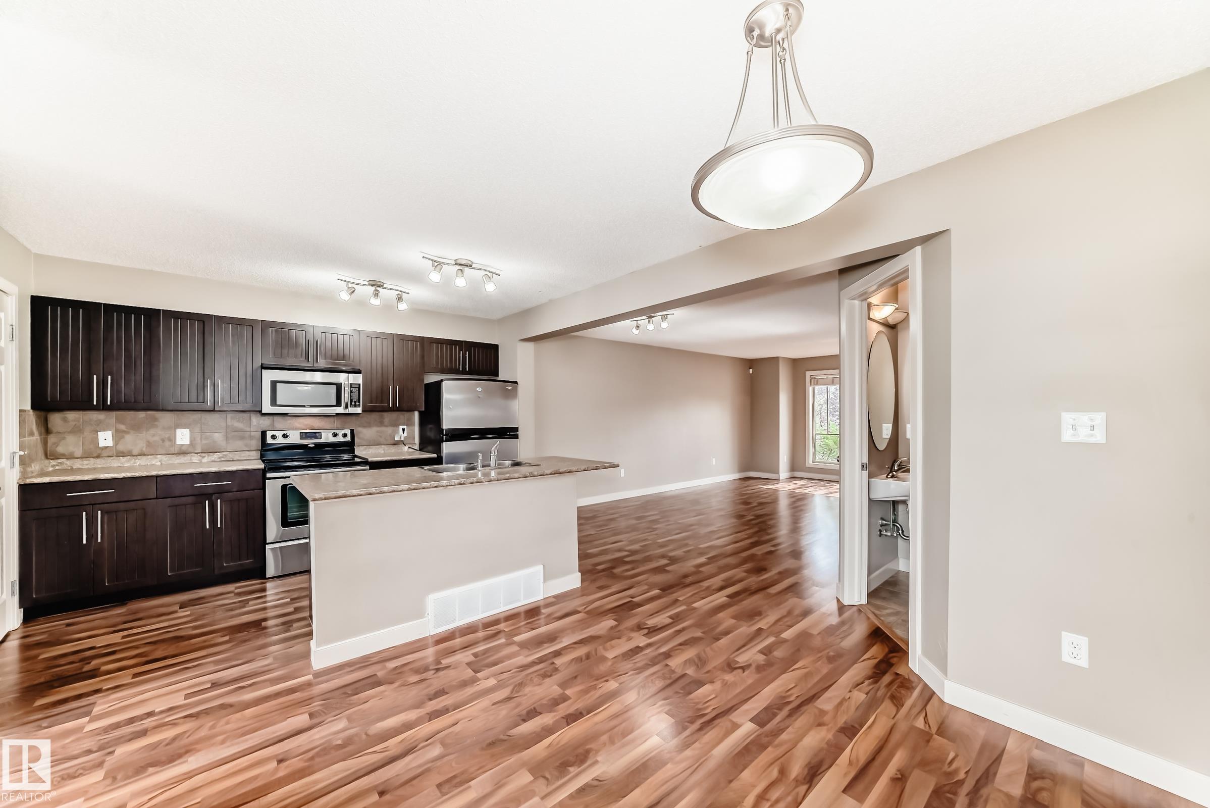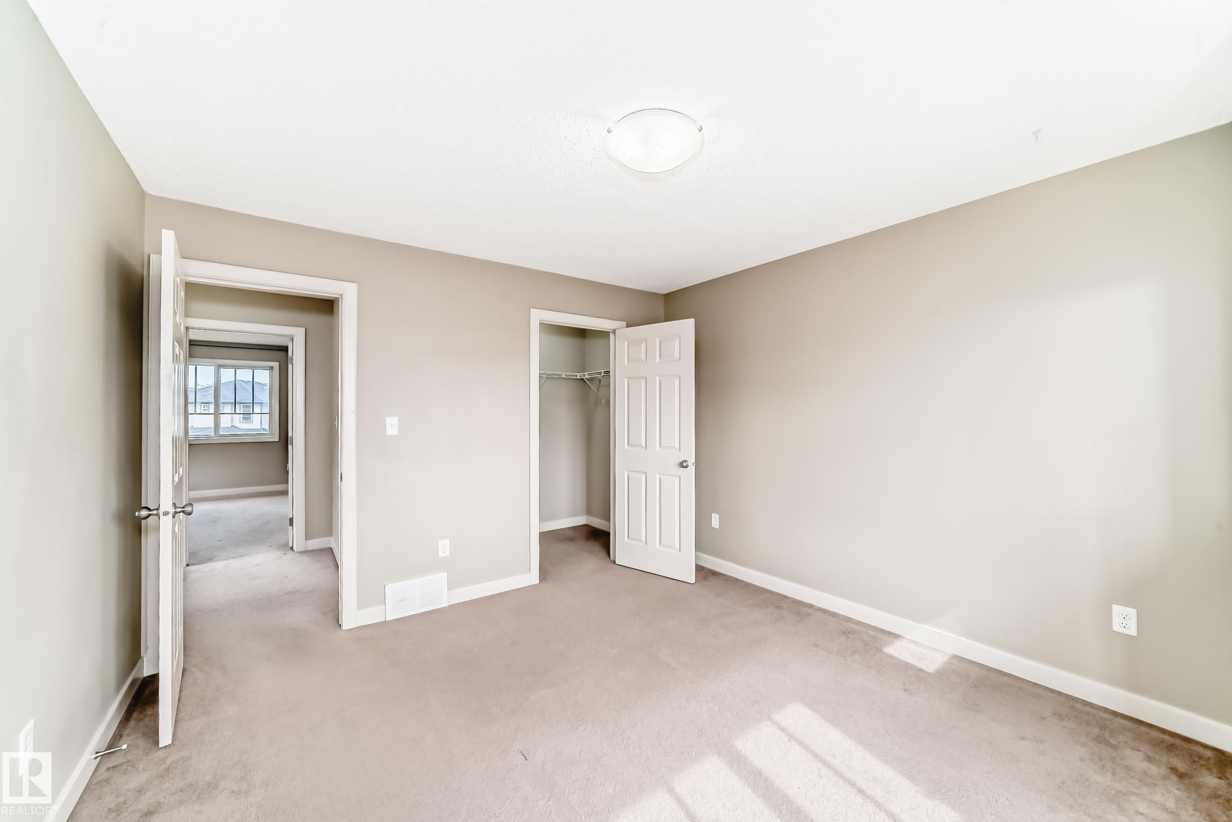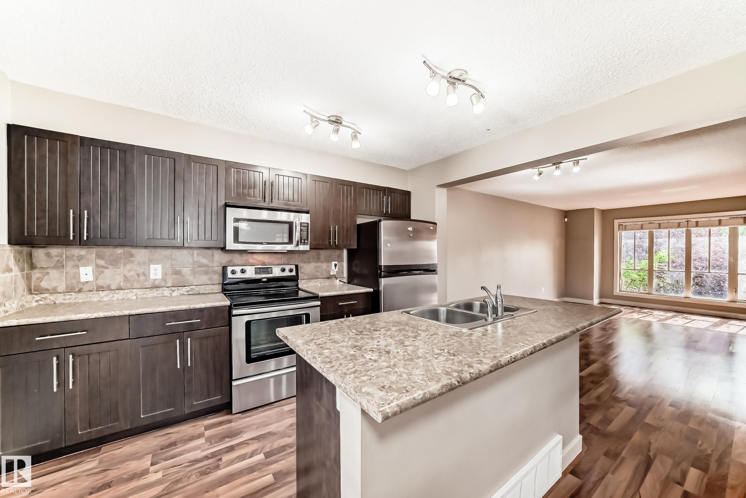 End Unit - NO Condo Fees! This well-maintained 2-bedroom, 2.5-bath home is ideally located in the sought-after Ambleside community. The main floor boasts an open-concept design with a modern kitchen featuring sleek countertops and ample cabinetry. Upstairs, you'll find two spacious bedrooms--each with its own 4-piece ensuite and walk-in closet--plus the convenience of second-floor laundry. Enjoy your private backyard with a deck, perfect for relaxing or entertaining, along with the added bonus of a double detached garage. Situated directly across from Dr. Margaret-Ann Armour School, this home is just minutes from Windermere Currents shopping, dining, and entertainment, with quick access to Anthony Henday Drive and all nearby amenities. Welcome Home!