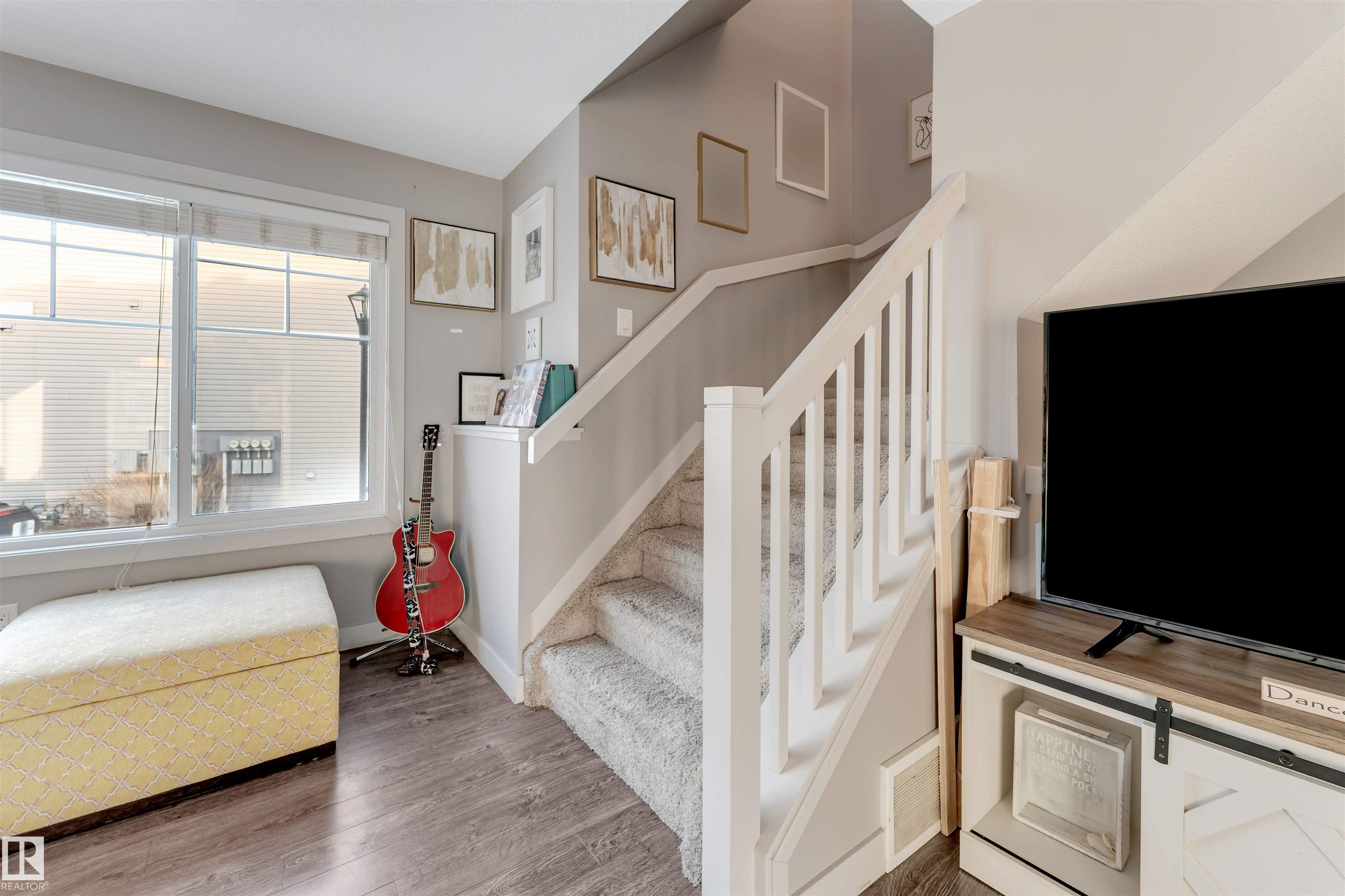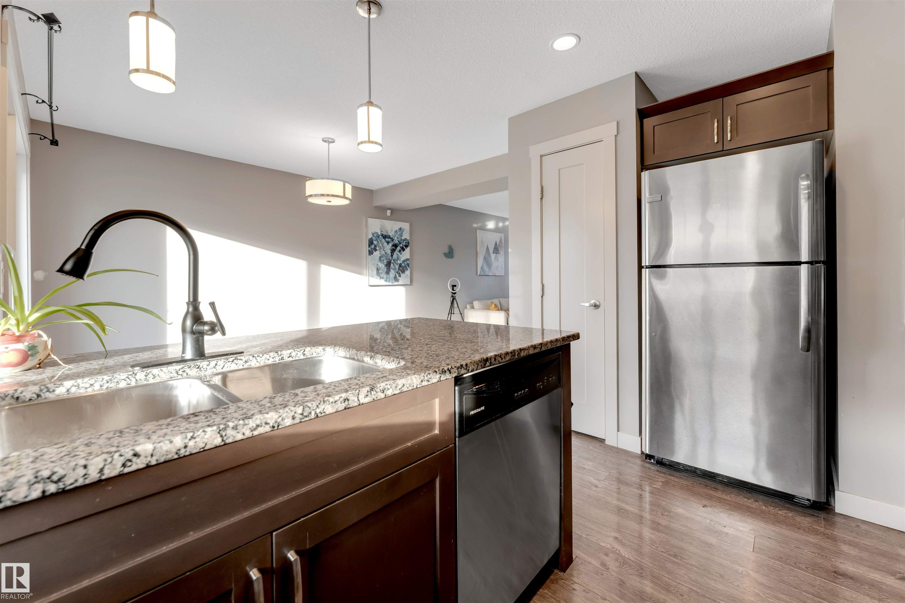 A great home for first time buyers, Move up or Move Down buyers or Smart Investors. This 2 primary bedroom suite layout is sure to impress. One bedroom has a walk in closet and full 4 pc Ensuite with granite counters and the second bedroom has attached bathroom with granite counters and two larger regular closets. Both rooms are spacious and have larger windows. Main floor features corner L-Kitchen with granite counter tops and stainless steel appliances. Basement features the laundry and the double attached garages. The beauty of this particular layout is that both stairs are split and its not steep climb like most townhouses. Close to parks, Manning shopping centers, Transit, Schools and Henday is also within reach. Rich laminate flooring really compliments the paint and brigh interior. Lots of large windows in the front and back and home is very inviting and very well taken care off. Great location for families and young couples looking for their first home. OWN it today.