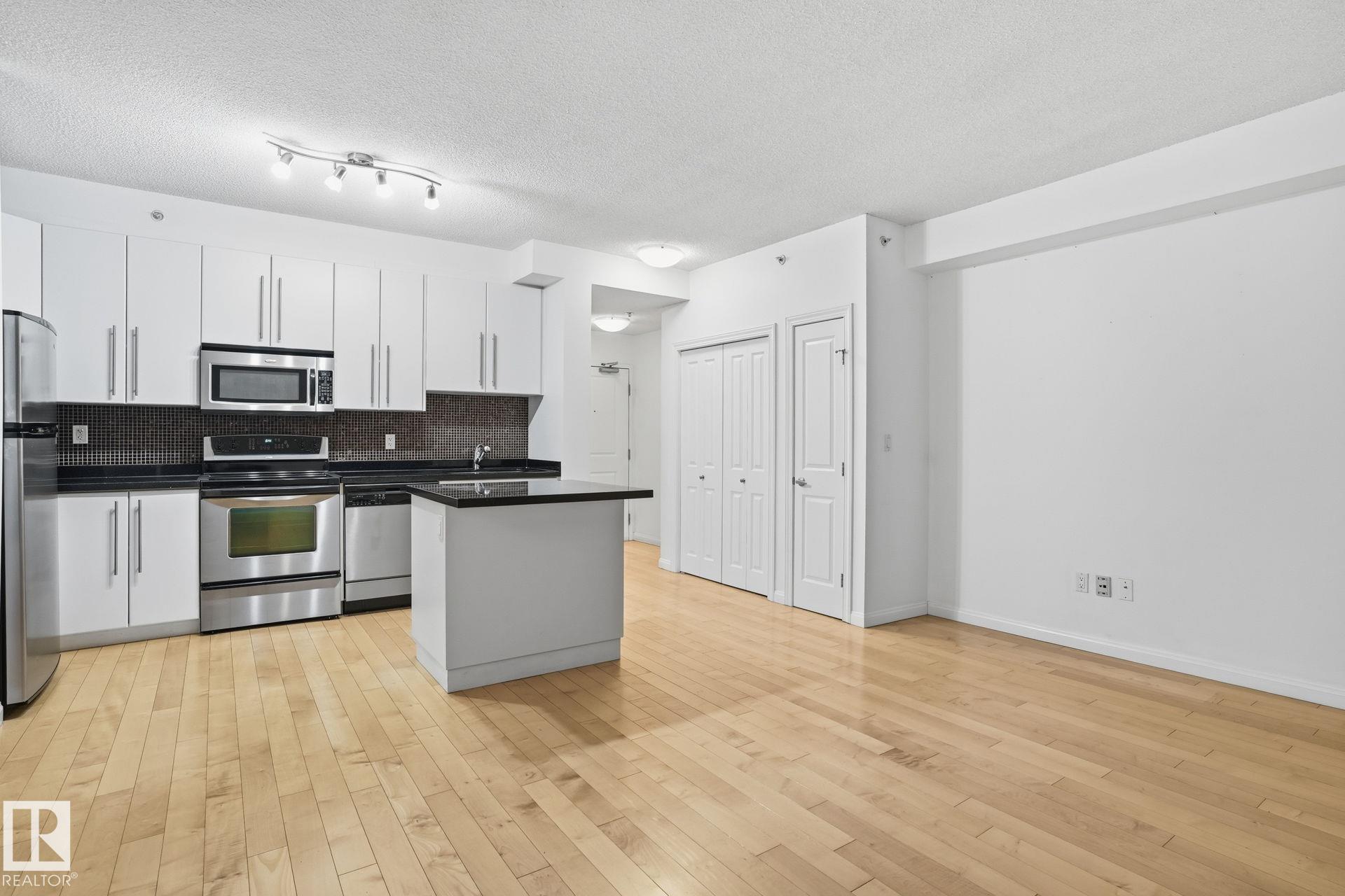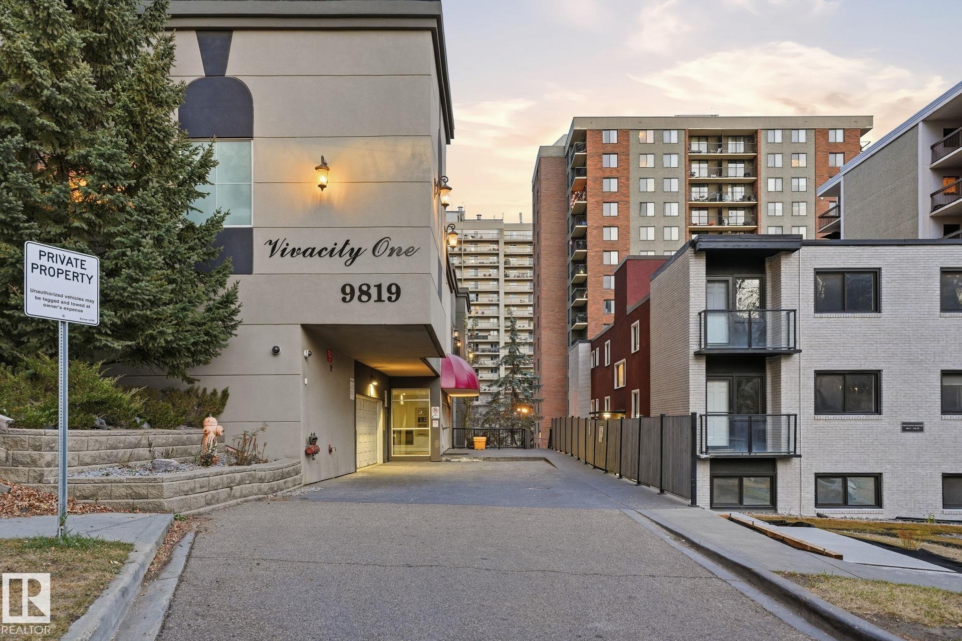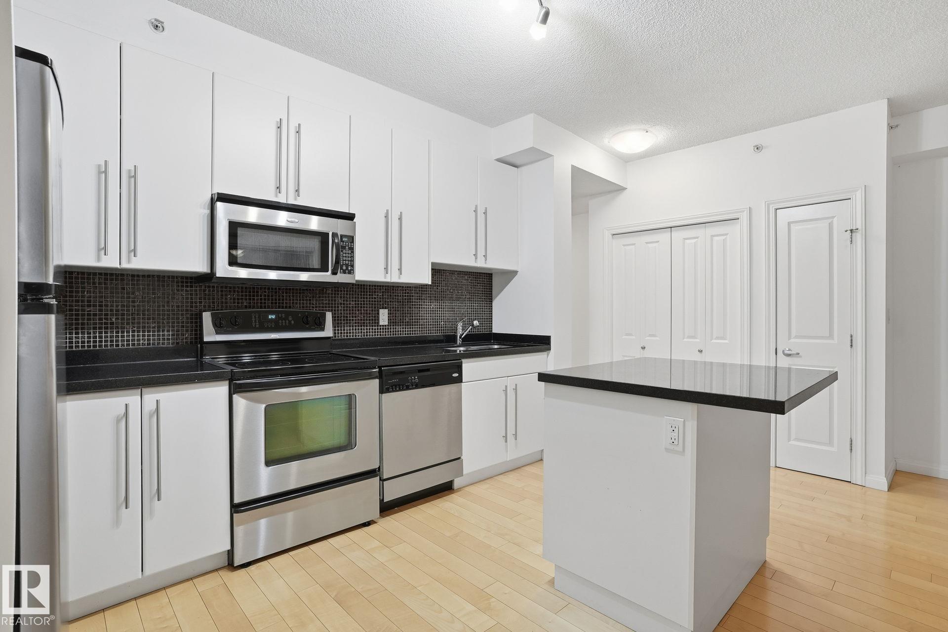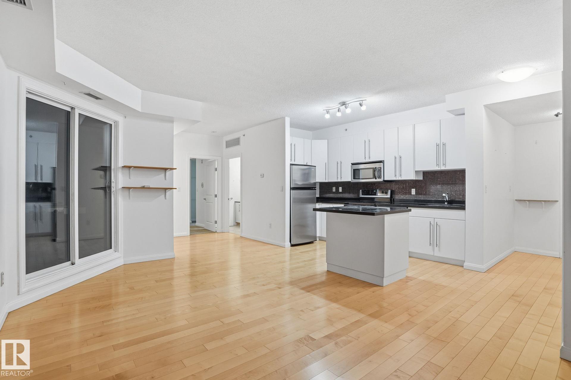 Enjoy downtown views from this move in ready condo in Vivacity, perfectly located near downtown, public transit, the river valley trails, shopping, restaurants, and the U of A. This modern open-concept suite features 9 ft ceilings, granite countertops, white cabinetry, stainless steel appliances, a kitchen island, and maple engineered hardwood flooring. The bright living area offers north and east exposures plus a gas BBQ hookup on the balcony. Recent upgrades include new carpet in the bedroom and a new furnace for added comfort. Included are the fridge, ceramic top stove, built-in microwave, dishwasher, in-suite washer & dryer, window coverings, and A/C. Comes with titled underground parking stall #96 on P1. Condo fees include heat, water, power, and access to building amenities: a rooftop patio with panoramic views, fitness room, and event room. A must-see condo offering modern living and unbeatable downtown convenience!