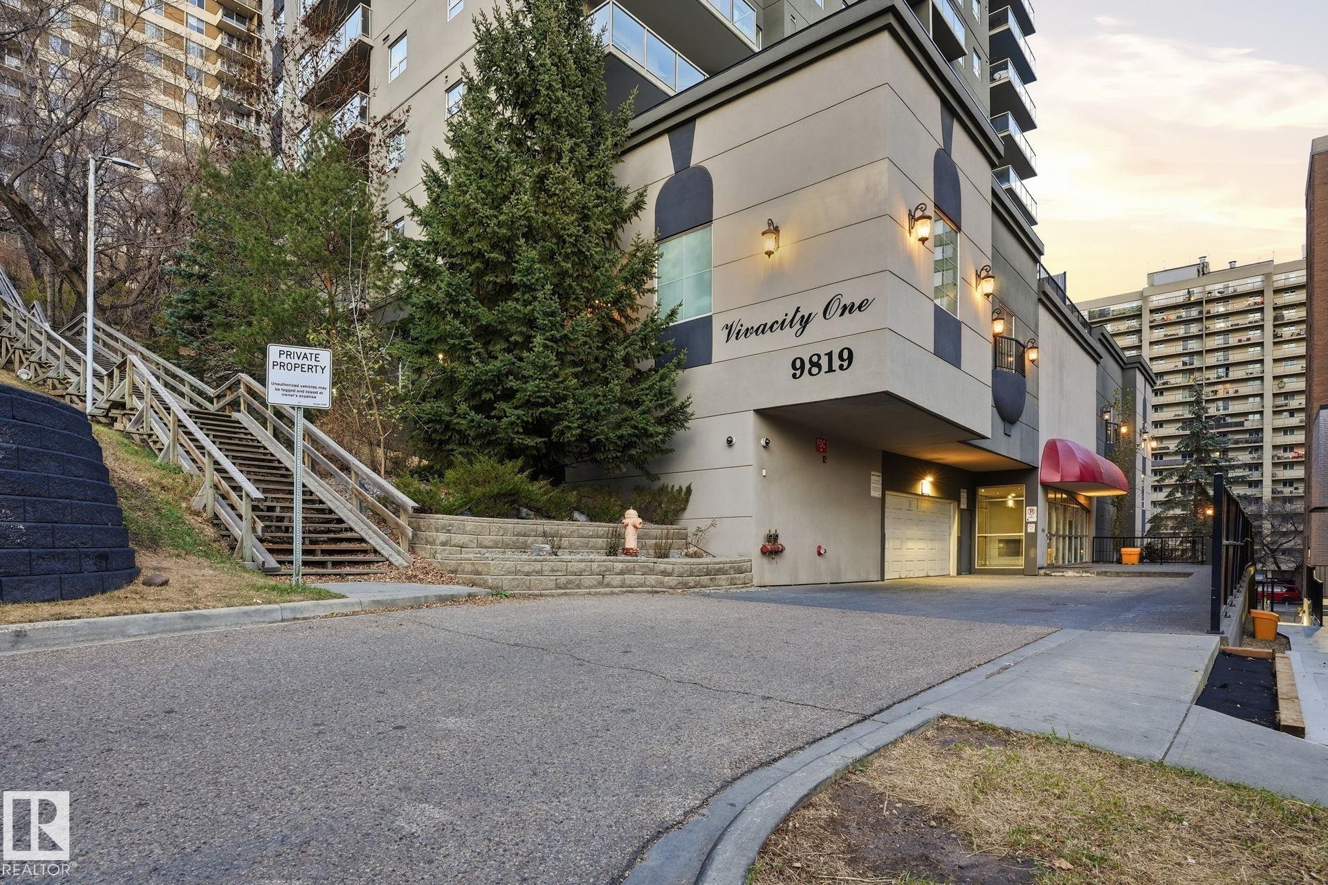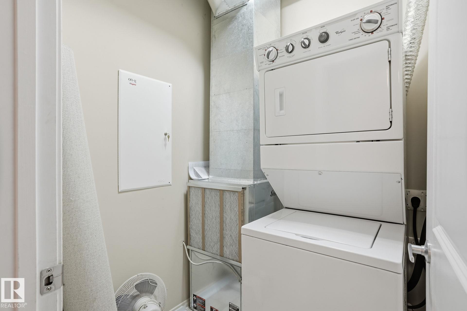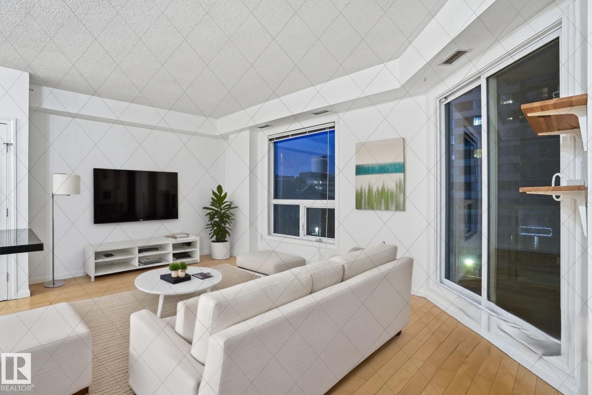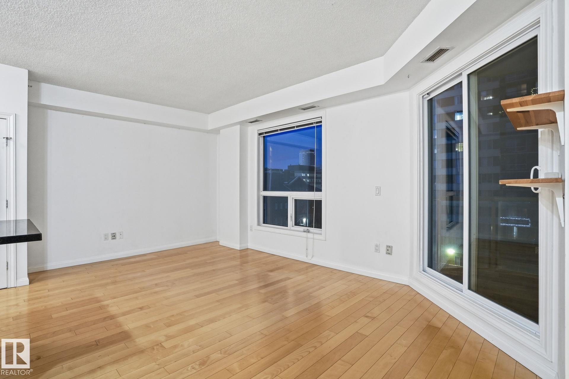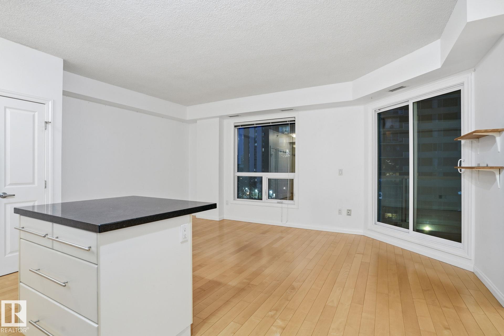 Enjoy downtown views from this move in ready condo in Vivacity, perfectly located near downtown, public transit, the river valley trails, shopping, restaurants, and the U of A. This modern open-concept suite features 9 ft ceilings, granite countertops, white cabinetry, stainless steel appliances, a kitchen island, and maple engineered hardwood flooring. The bright living area offers north and east exposures plus a gas BBQ hookup on the balcony. Recent upgrades include new carpet in the bedroom and a new furnace for added comfort. Included are the fridge, ceramic top stove, built-in microwave, dishwasher, in-suite washer & dryer, window coverings, and A/C. Comes with titled underground parking stall #96 on P1. Condo fees include heat, water, power, and access to building amenities: a rooftop patio with panoramic views, fitness room, and event room. A must-see condo offering modern living and unbeatable downtown convenience!