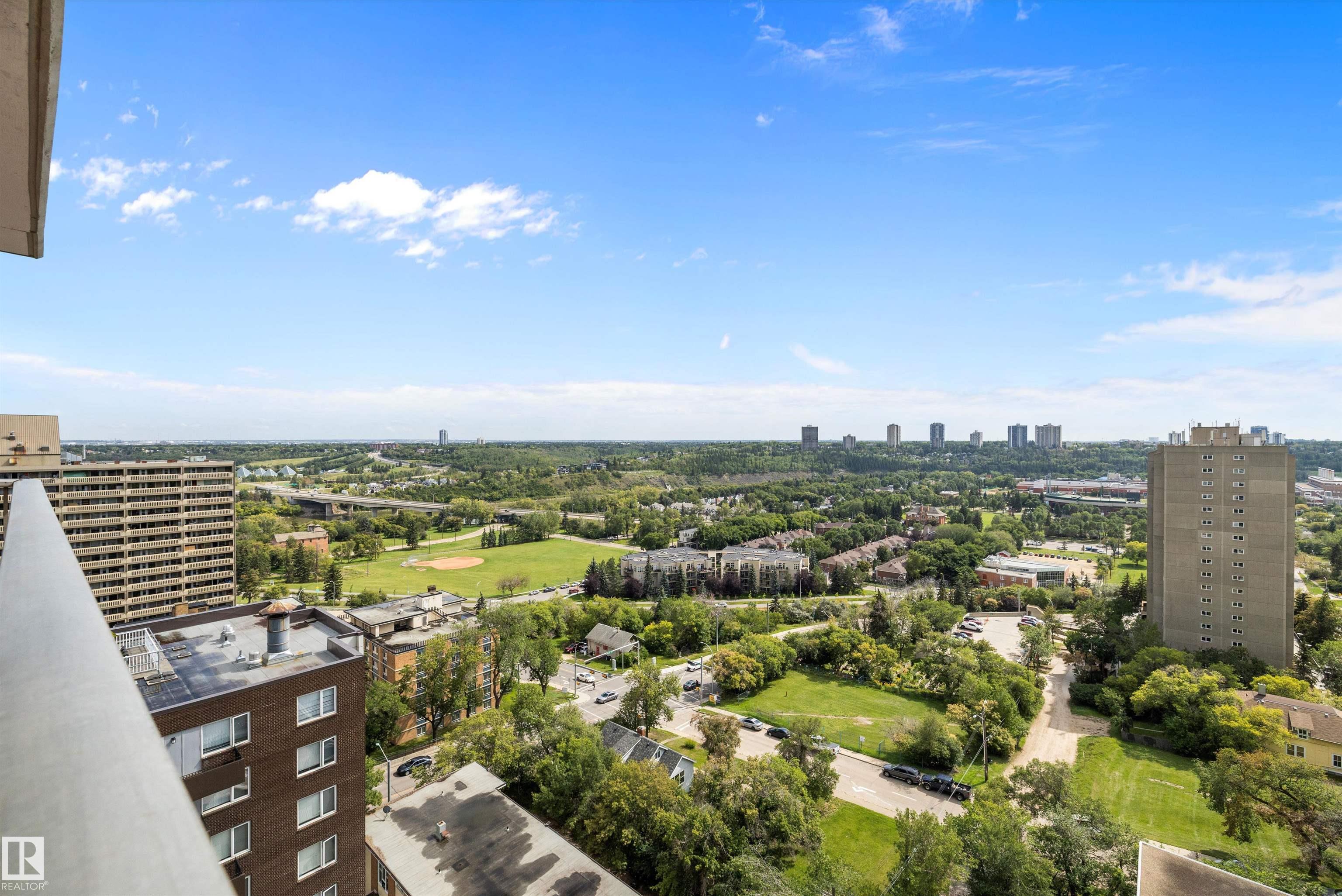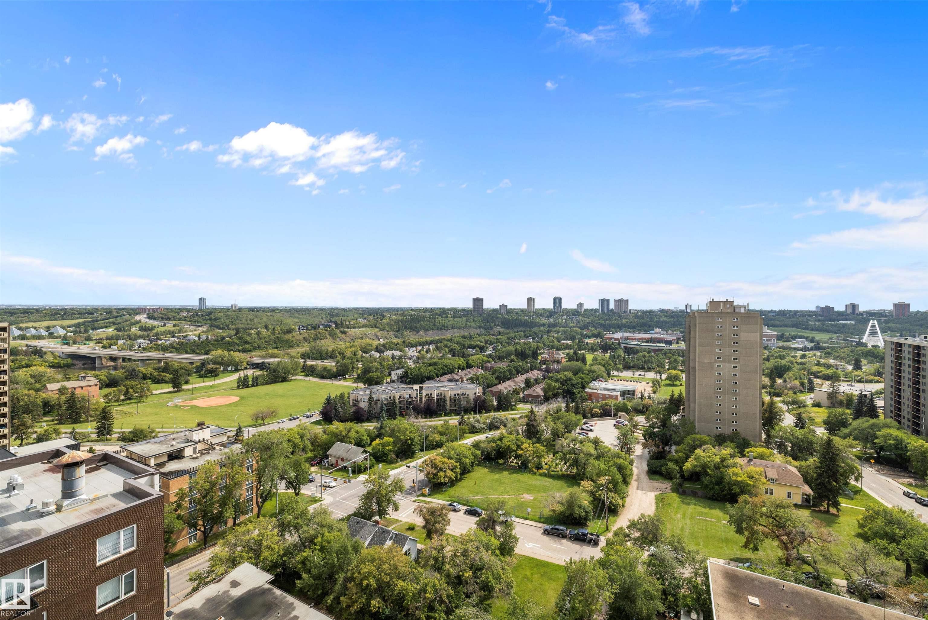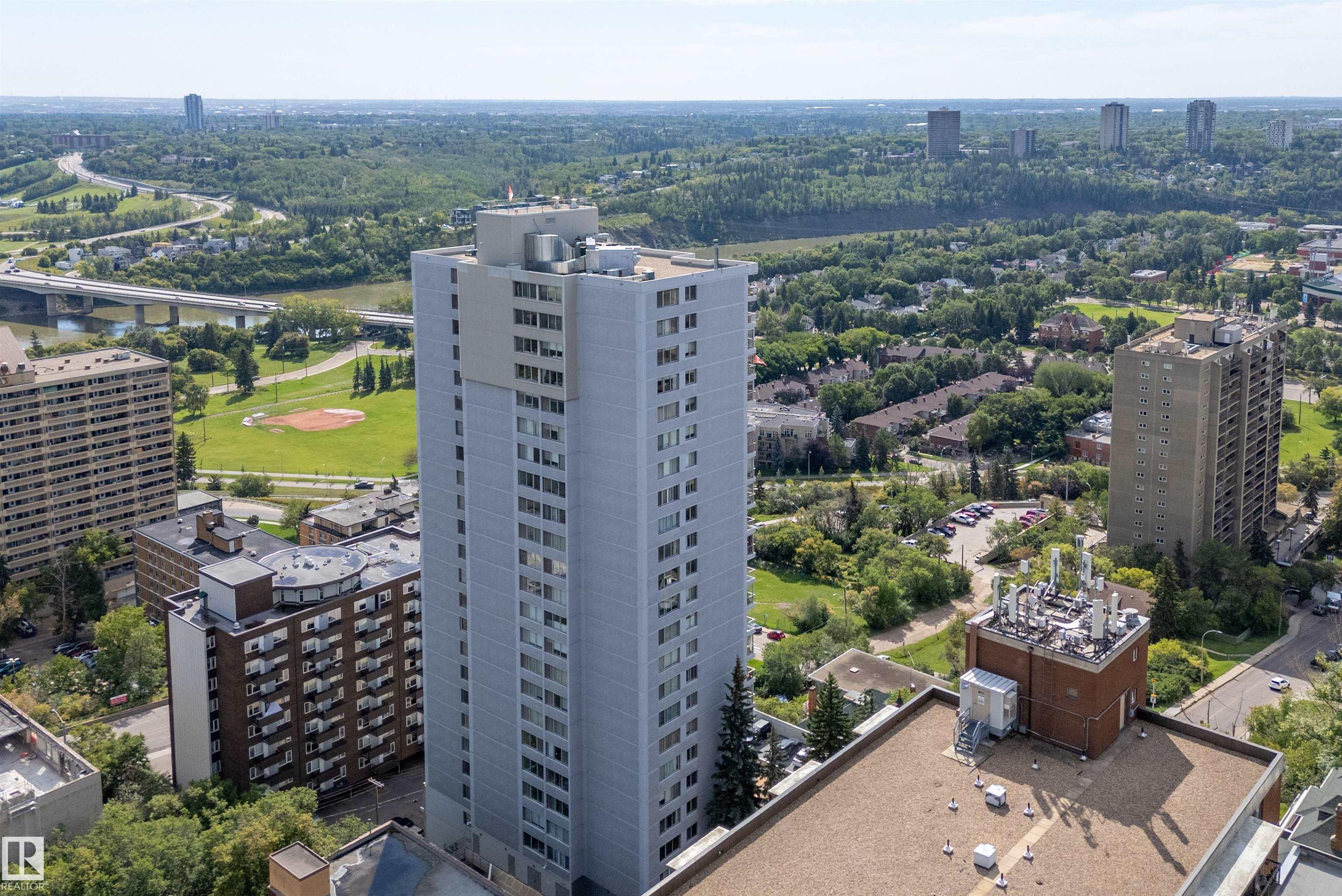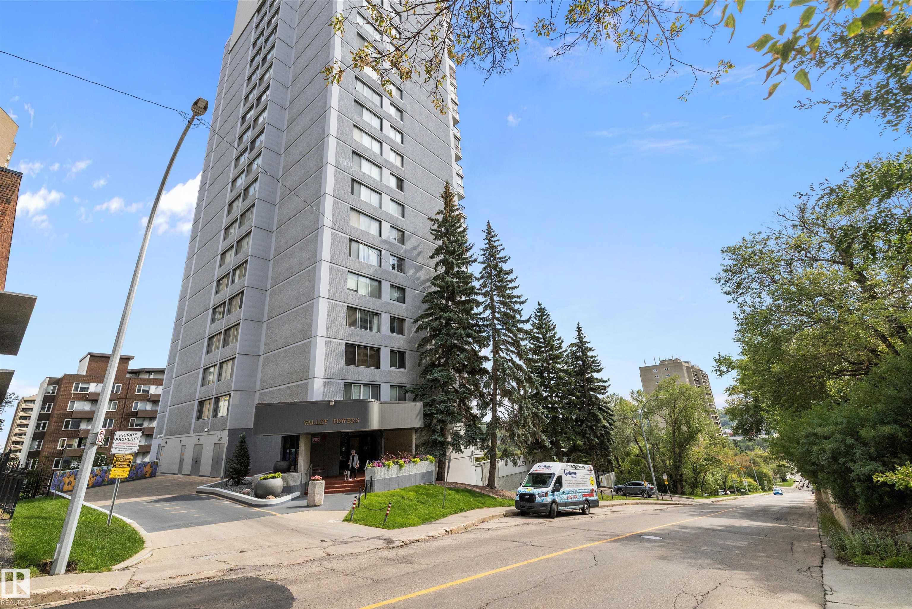 Experience breathtaking river valley views from this beautiful downtown suite located on the 11th floor of Valley Towers! Featuring 2 bedrooms & 2 bathrooms this large 1393 Sq Ft unit is perfectly positioned just steps away from Edmonton's beautiful River Valley, Downtown, and the UofA! The galley style Kitchen is a true show-stopper offering 2-tone cabinetry, sleek black appliances including a bar fridge, modern lighting, and open concept views. The spacious Living Room not only offers a cozy fireplace but also opens directly onto a sunny, south-facing patio and has a connected designated dining area. This floor plan also offers excellent separation of space for the Primary and Secondary Bedrooms as well as a dedicated in-suite Laundry/Storage room! This building comes with an impressive list of amenities including but not limited to: underground parking, a fully equipped gym, hot tub, swimming pool and a private terrace/patio for lounging. Come experience the best of downtown living!