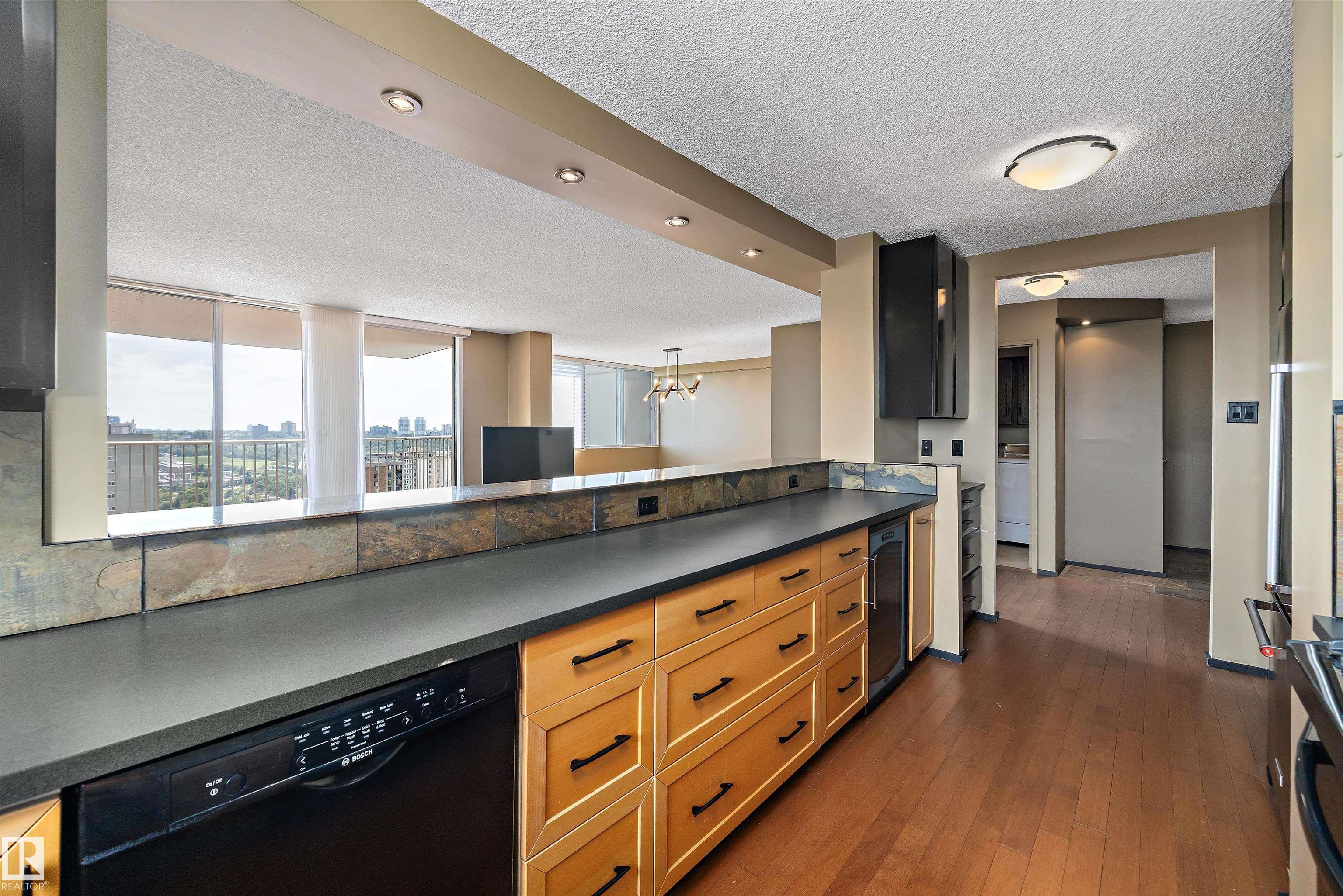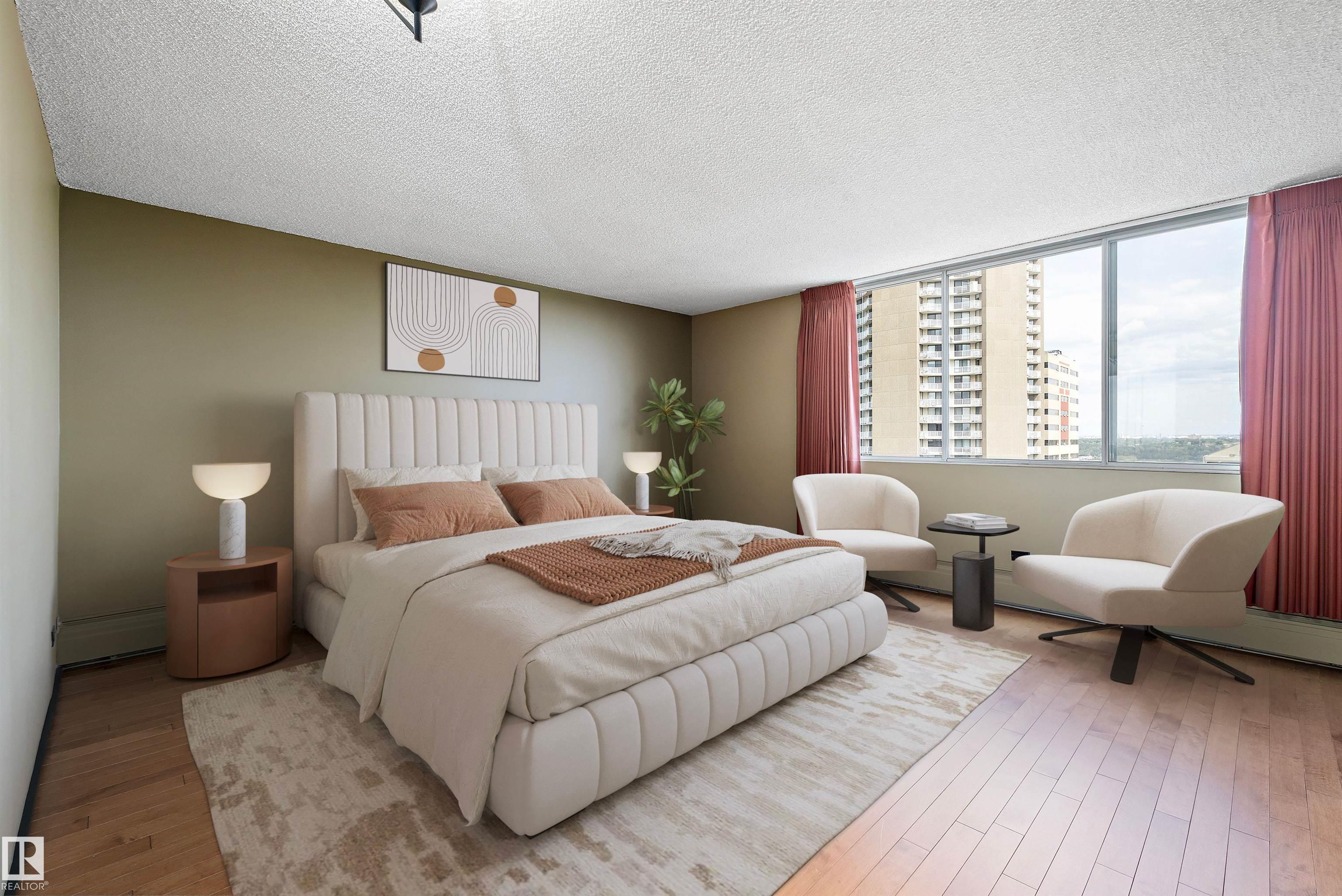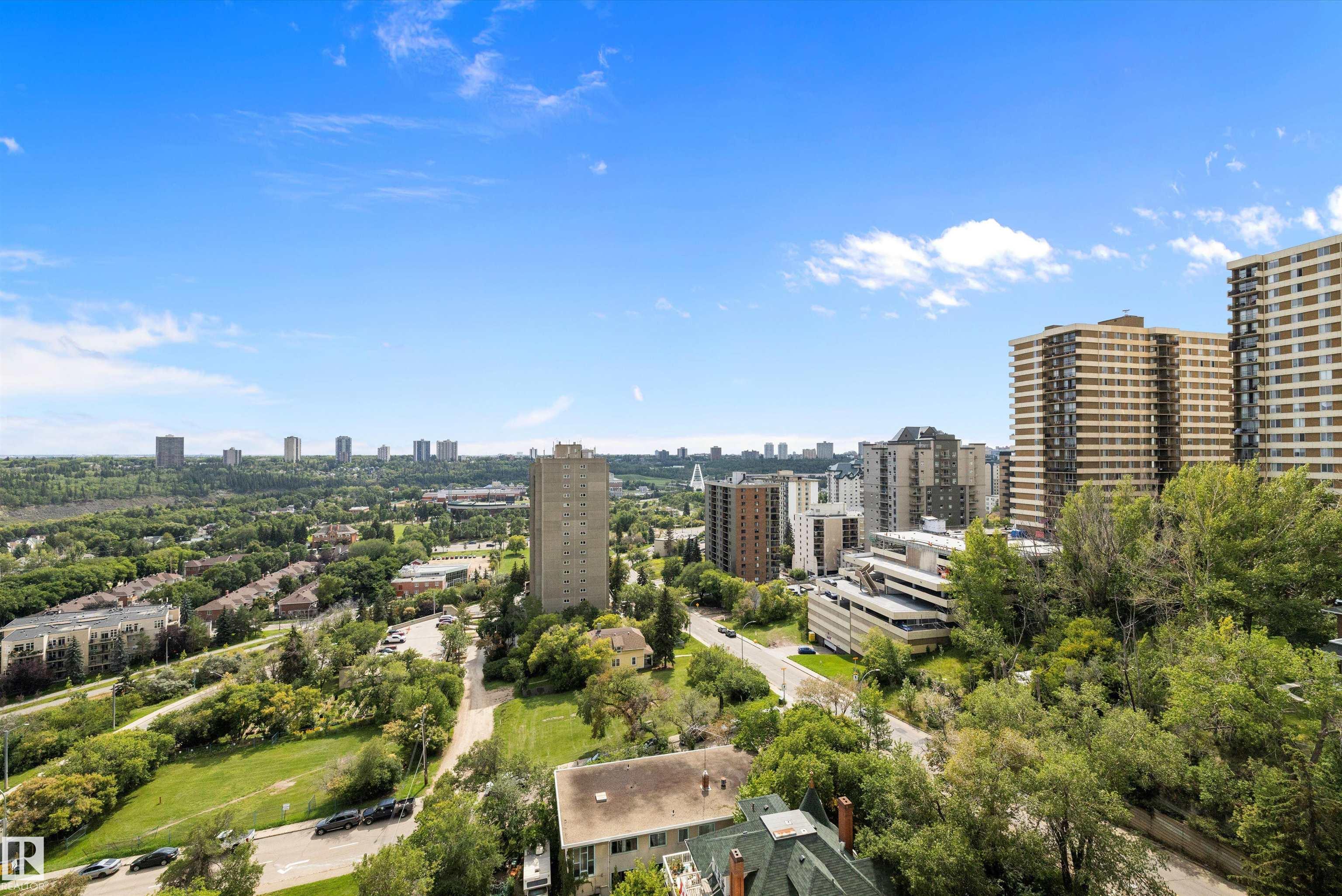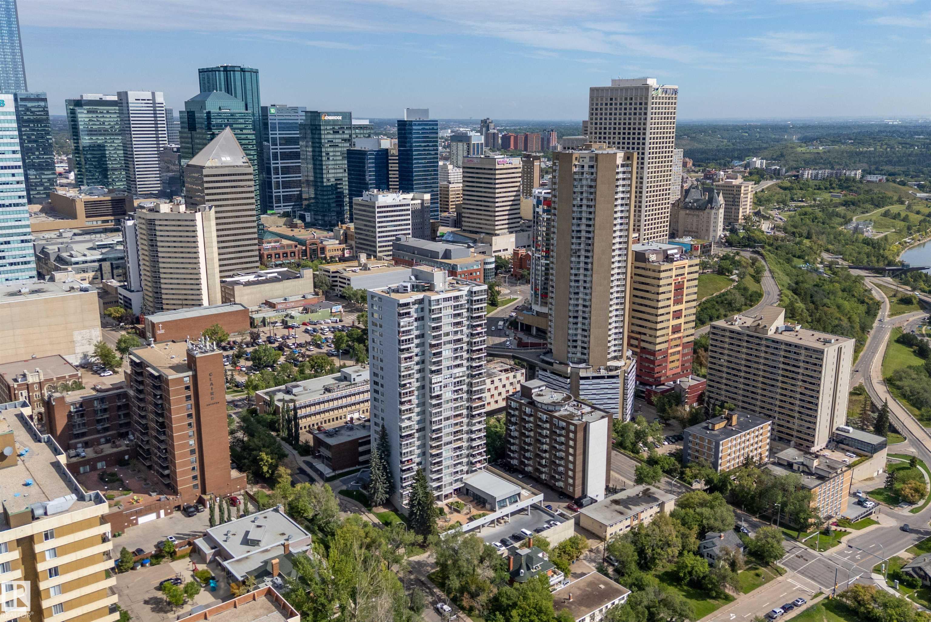 Experience breathtaking river valley views from this beautiful downtown suite located on the 11th floor of Valley Towers! Featuring 2 bedrooms & 2 bathrooms this large 1393 Sq Ft unit is perfectly positioned just steps away from Edmonton's beautiful River Valley, Downtown, and the UofA! The galley style Kitchen is a true show-stopper offering 2-tone cabinetry, sleek black appliances including a bar fridge, modern lighting, and open concept views. The spacious Living Room not only offers a cozy fireplace but also opens directly onto a sunny, south-facing patio and has a connected designated dining area. This floor plan also offers excellent separation of space for the Primary and Secondary Bedrooms as well as a dedicated in-suite Laundry/Storage room! This building comes with an impressive list of amenities including but not limited to: underground parking, a fully equipped gym, hot tub, swimming pool and a private terrace/patio for lounging. Come experience the best of downtown living!
