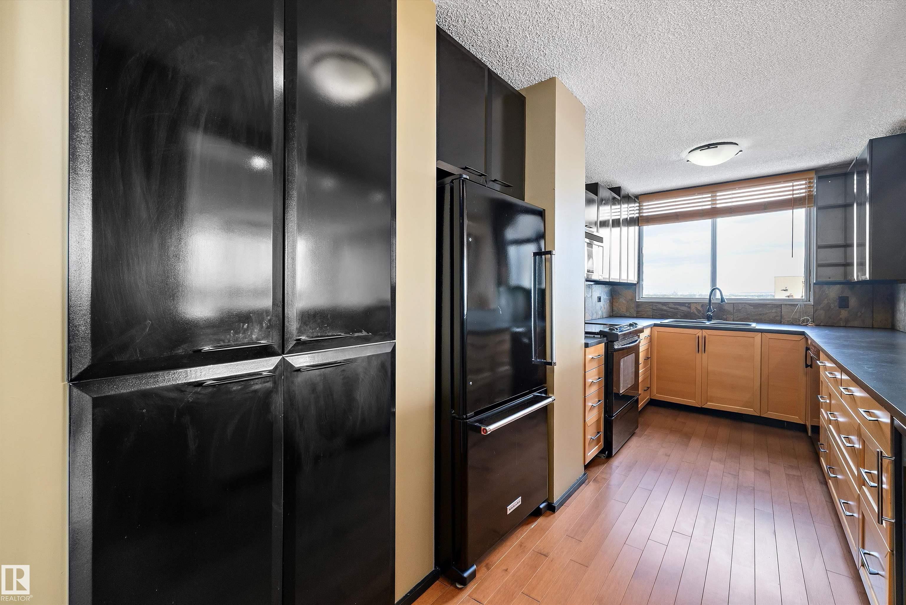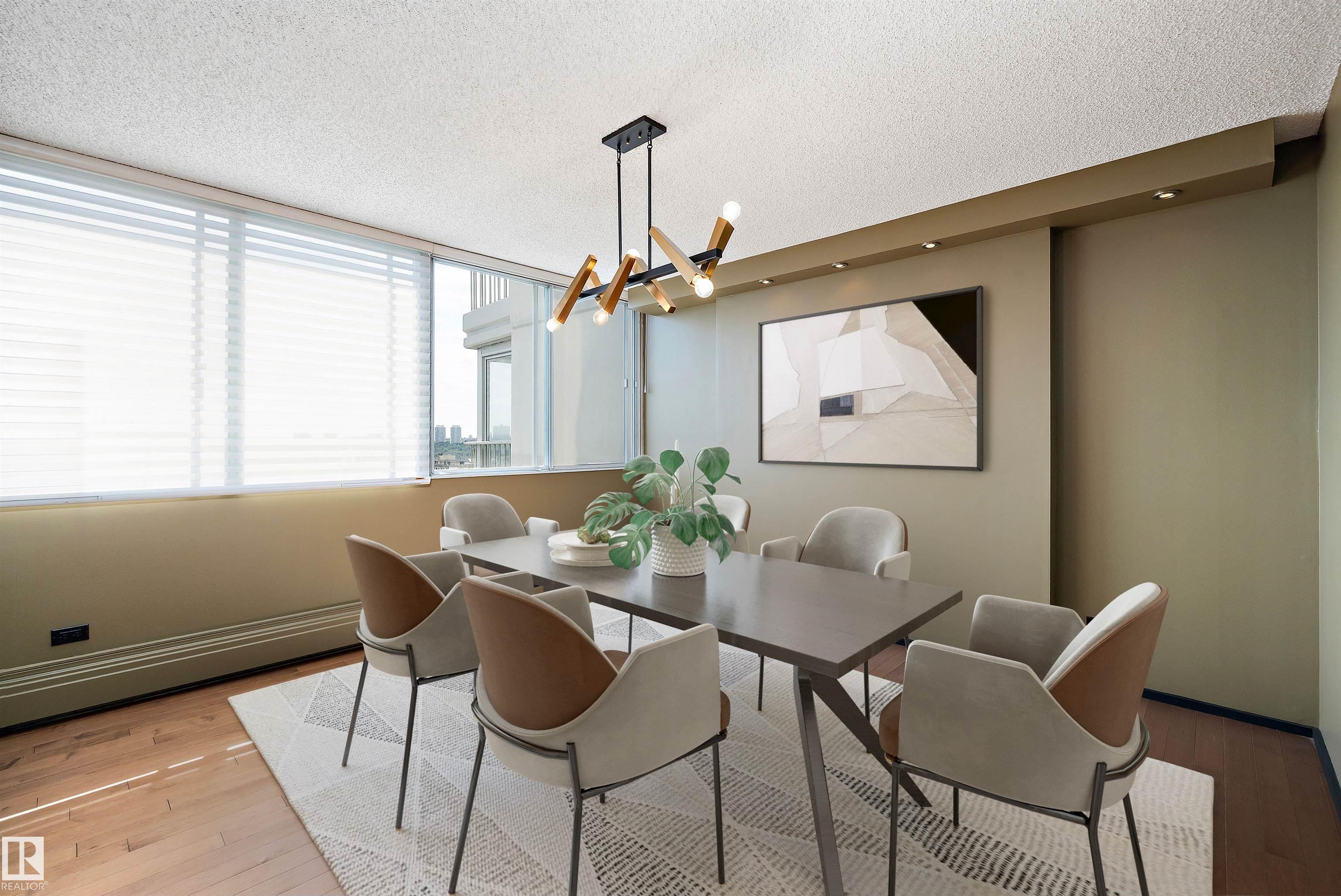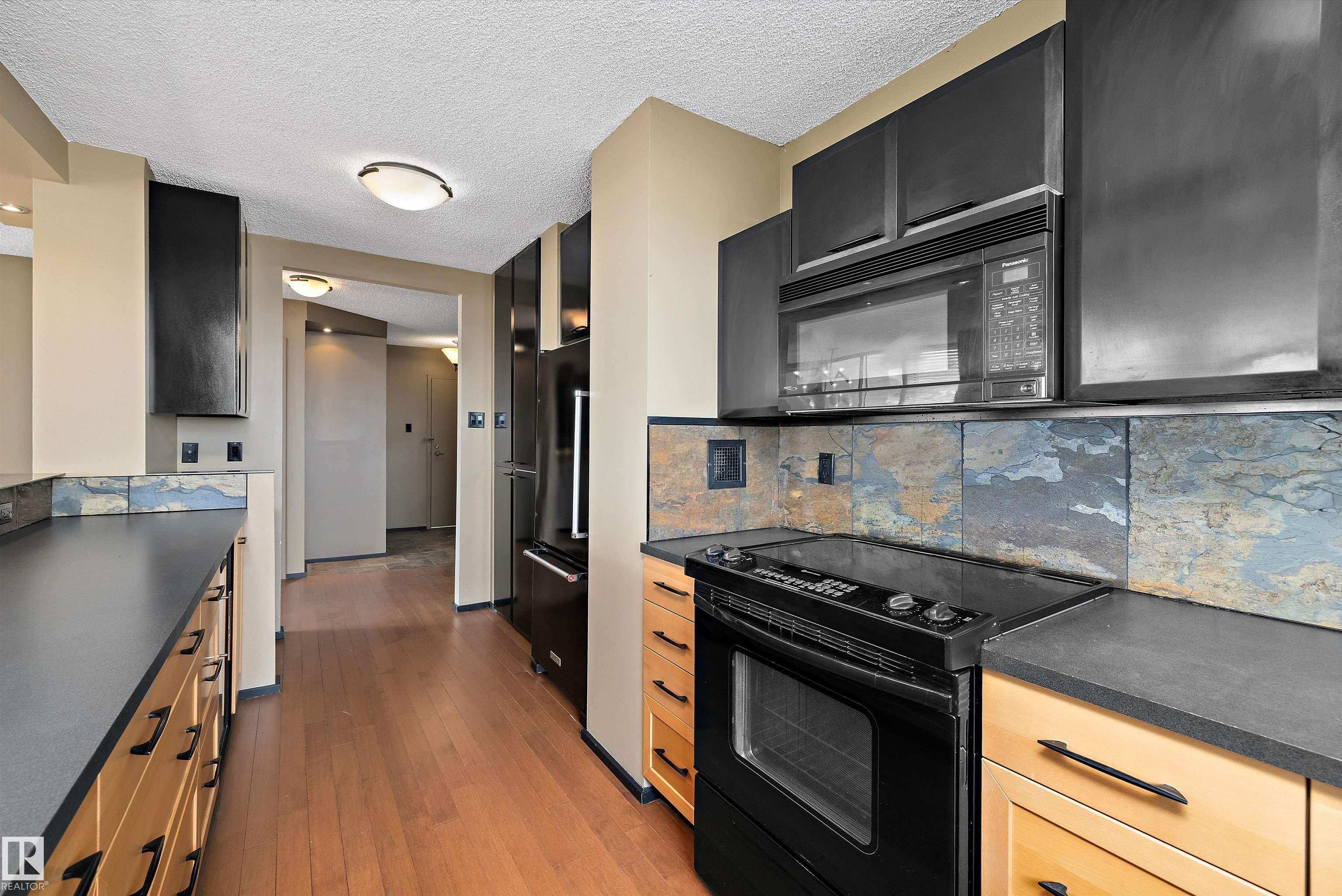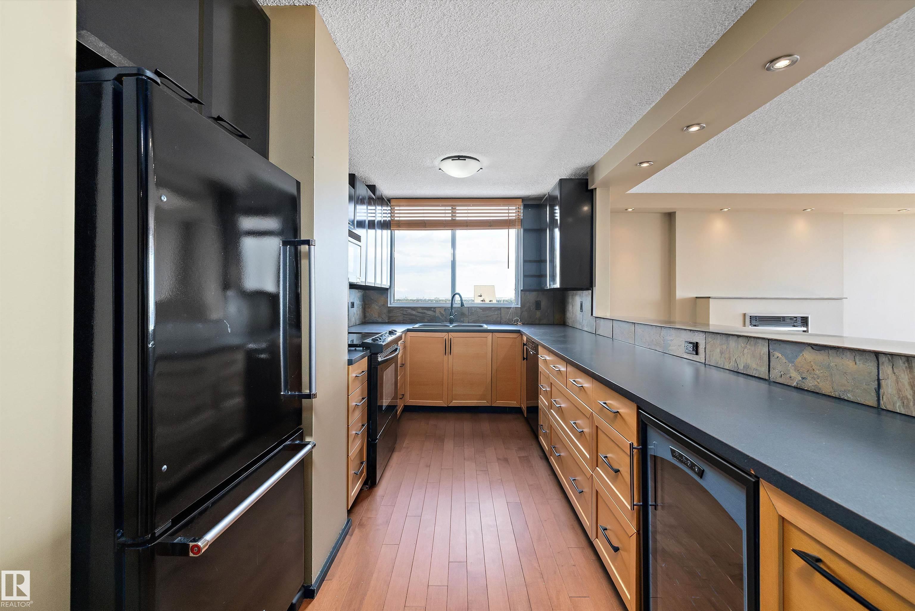 Experience breathtaking river valley views from this beautiful downtown suite located on the 11th floor of Valley Towers! Featuring 2 bedrooms & 2 bathrooms this large 1393 Sq Ft unit is perfectly positioned just steps away from Edmonton's beautiful River Valley, Downtown, and the UofA! The galley style Kitchen is a true show-stopper offering 2-tone cabinetry, sleek black appliances including a bar fridge, modern lighting, and open concept views. The spacious Living Room not only offers a cozy fireplace but also opens directly onto a sunny, south-facing patio and has a connected designated dining area. This floor plan also offers excellent separation of space for the Primary and Secondary Bedrooms as well as a dedicated in-suite Laundry/Storage room! This building comes with an impressive list of amenities including but not limited to: underground parking, a fully equipped gym, hot tub, swimming pool and a private terrace/patio for lounging. Come experience the best of downtown living!