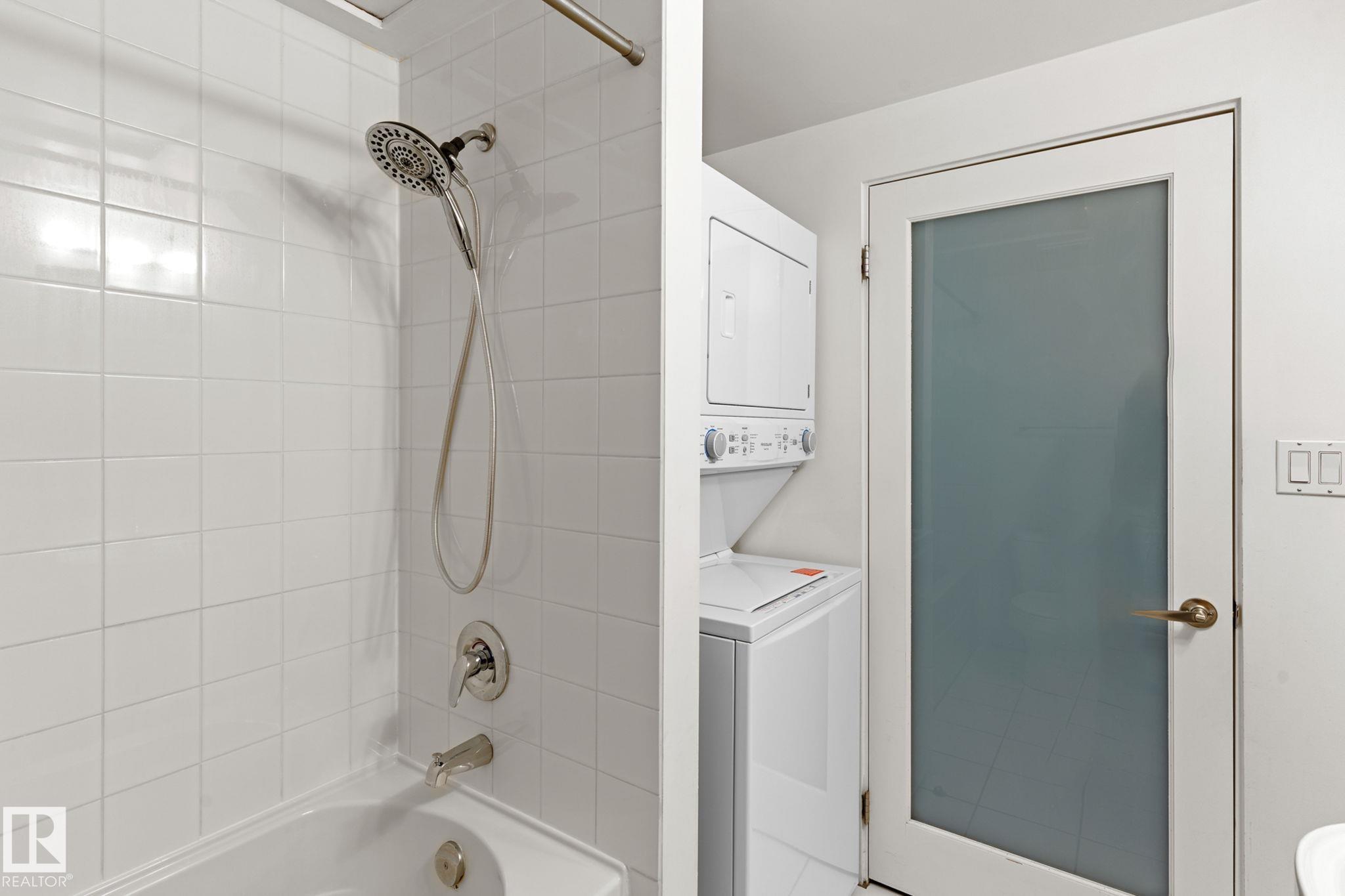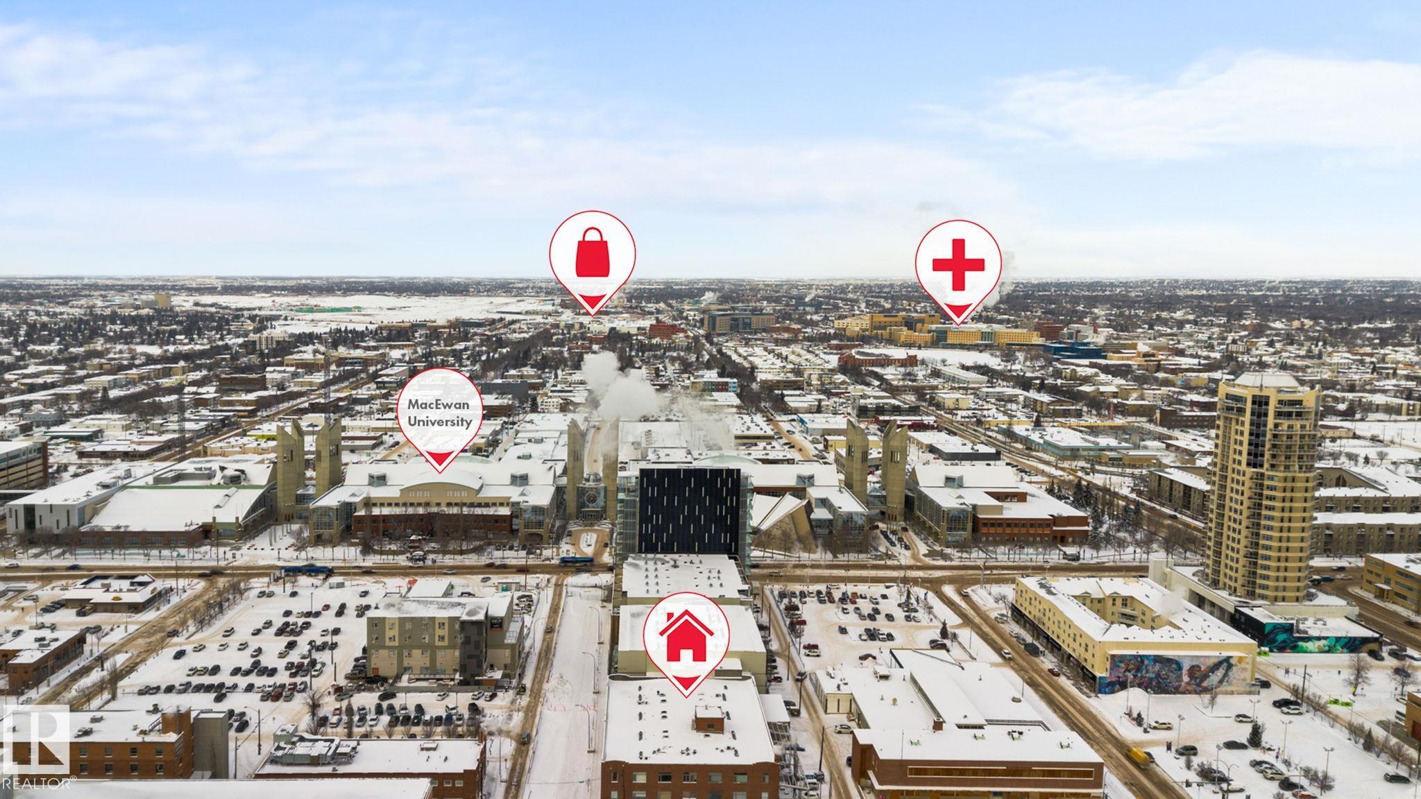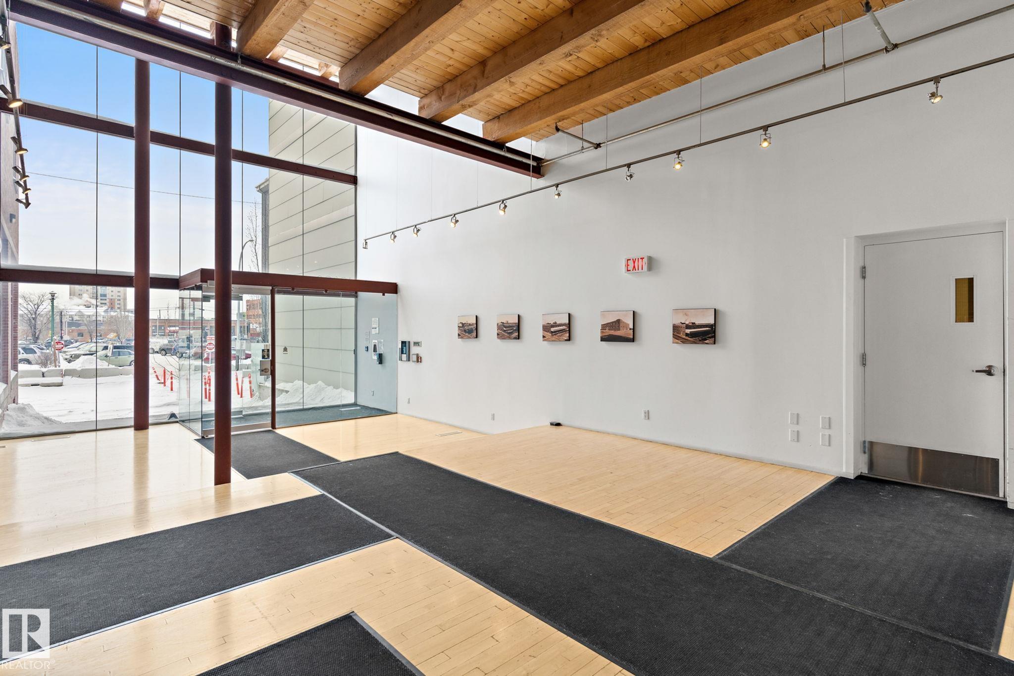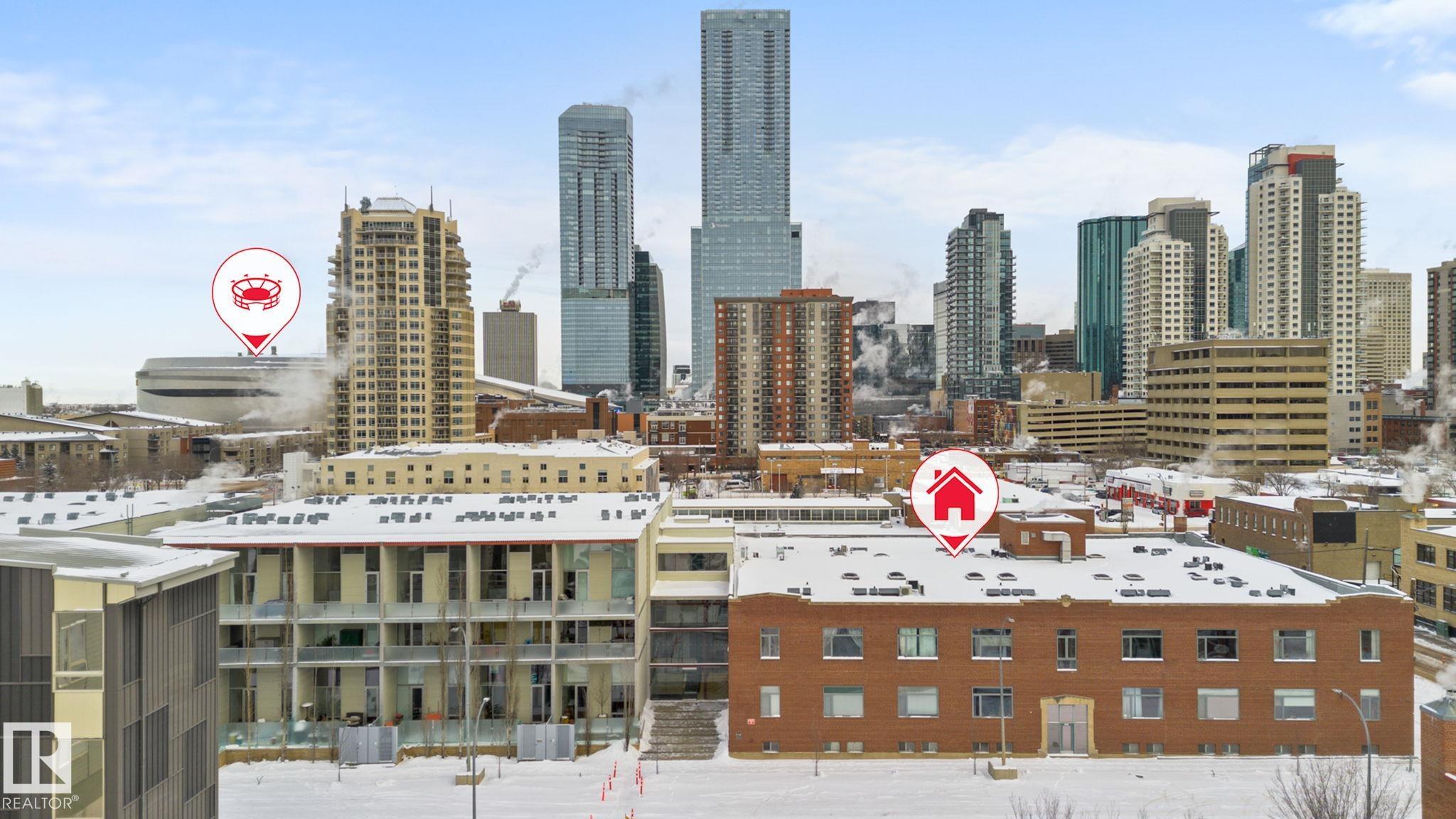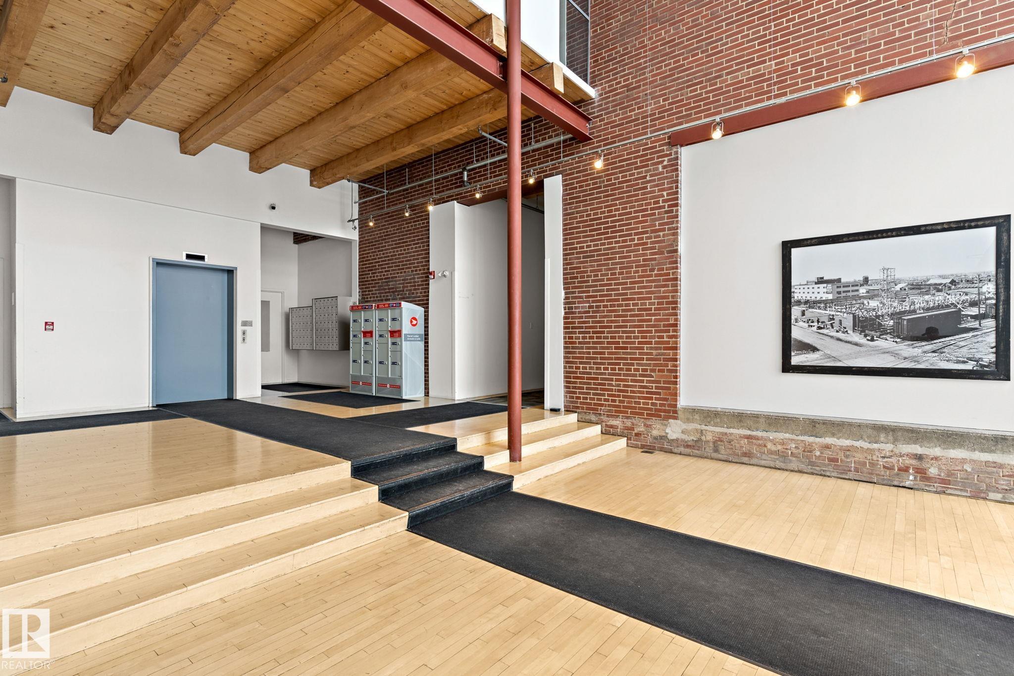 Historic Downtown Loft in the Iconic John Deere Warehouse! Experience the perfect mix of industrial charm and modern comfort with soaring 13' ceilings, original wood beams, a feature brick wall, and large west-facing window. A rare opening skylight with blackout blind fills the space with natural light and fresh air. The open-concept kitchen includes a large island for entertaining, while the raised bedroom platform offers smart under-bed storage. Enjoy laminate and ceramic tile flooring throughout. Prime Location - just 200m to MacEwan University & NorQuest College, and 600m to Rogers Place, grocery stores, and restaurants. Steps to the LRT and future 1.81-hectare Warehouse Park. Features include in-suite laundry, secure virtual keyless entry, underground bike storage, and on-site property maintenance. Move-in ready & Airbnb-friendly--a must see for investors, students, and professionals!
