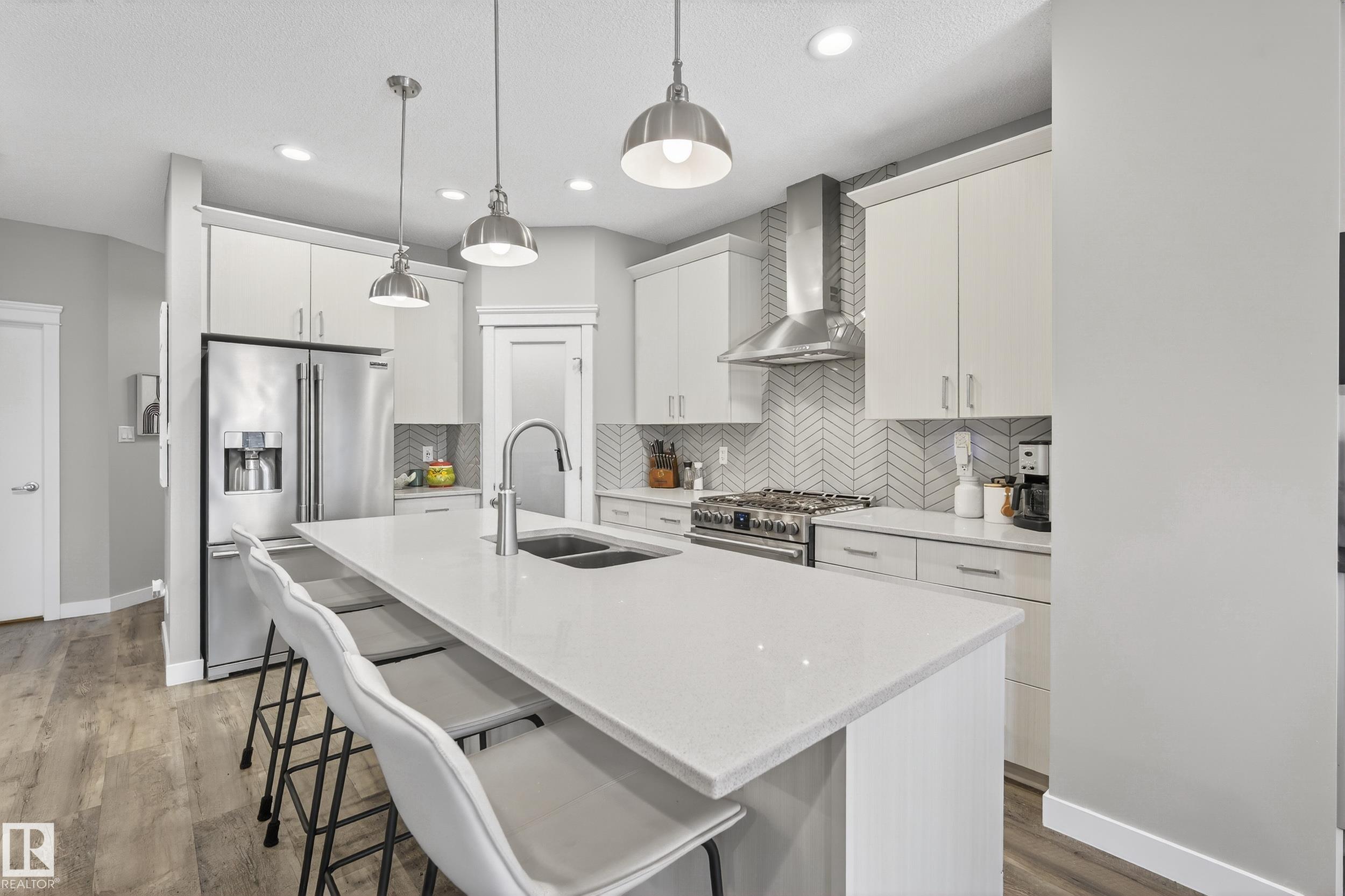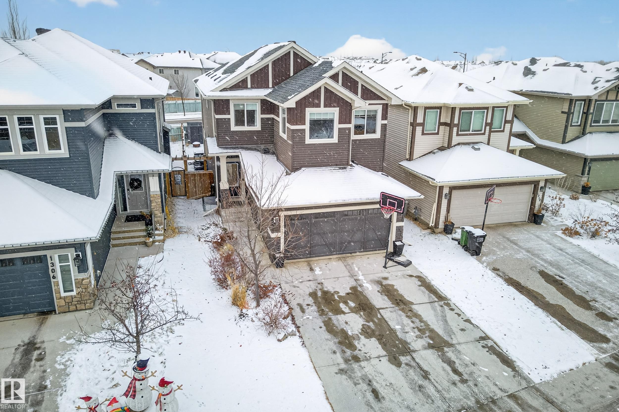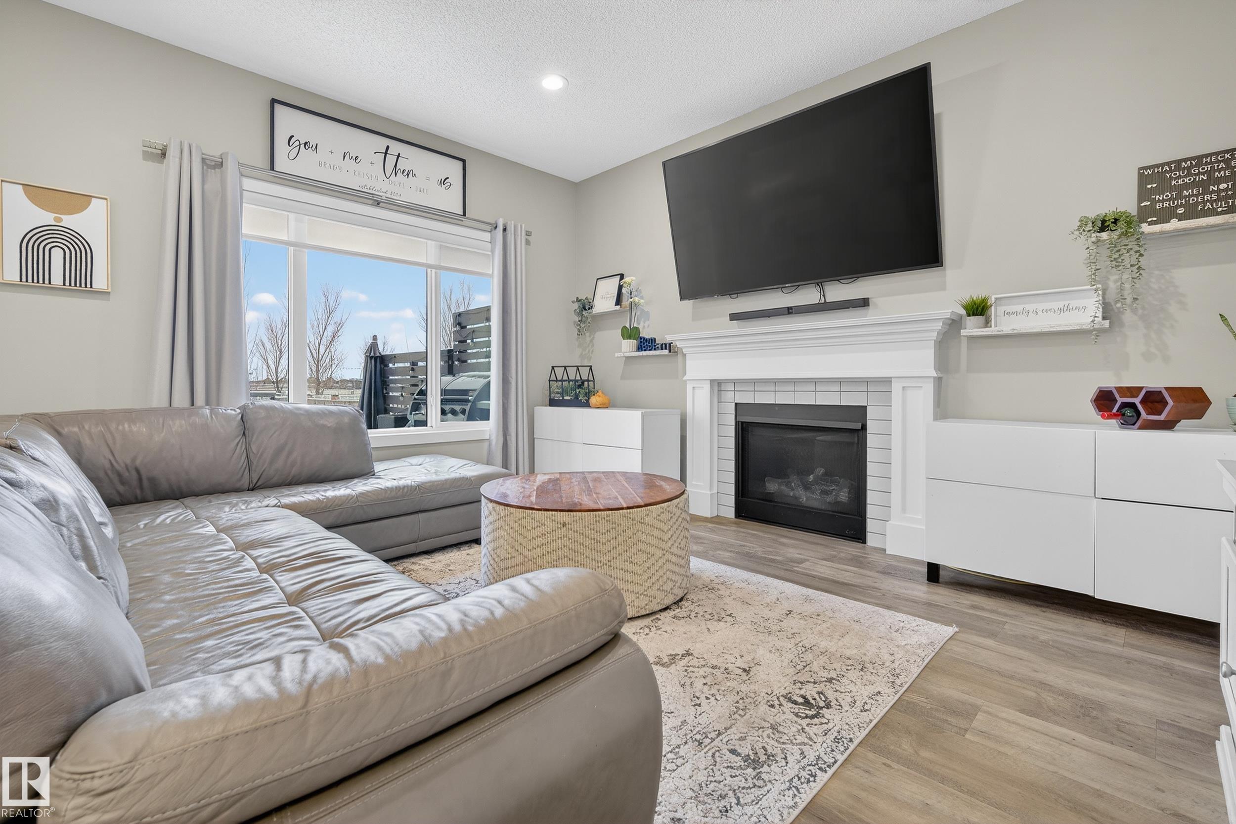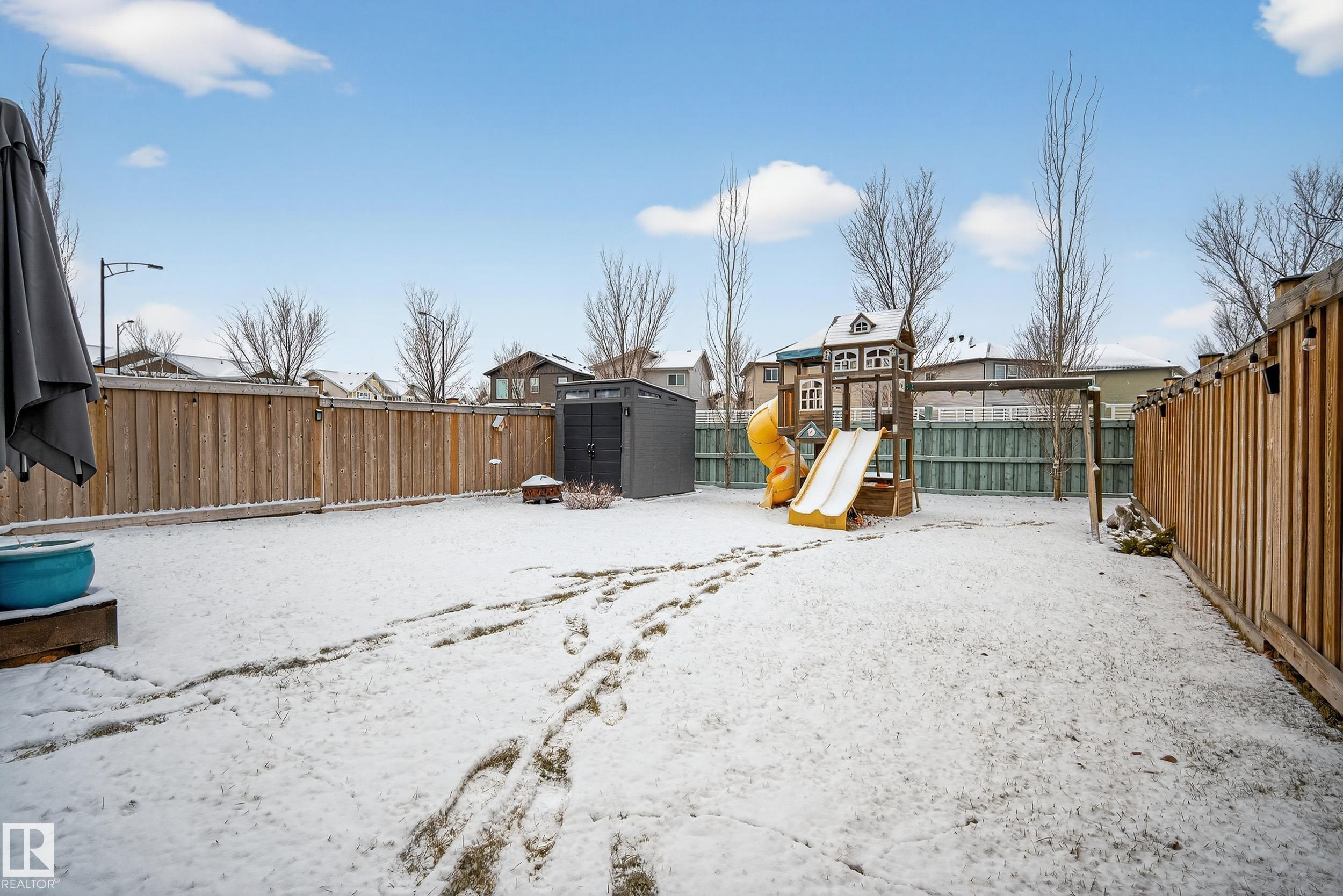 Welcome home to this property with 9-ft ceilings and upgraded flooring throughout the main level. The layout is ideal for daily living, featuring a cozy gas fireplace with mantle. The kitchen shines with quartz countertops, extended island, tile backsplash, upgraded lighting, Frigidaire gas range with stylish Faber hood fan, dishwasher, fridge, and extra dining room cabinetry. Upstairs offers 3 bedrooms plus a bonus room that can easily function as a 4th bedroom or office. The primary retreat includes a walk-in closet and a well-designed ensuite with walkthrough layout, hidden toilet, soaker tub, tiled shower, and upgraded countertop. Convenient upper-level laundry completes the floor. Enjoy the fully fenced backyard with stained deck, privacy walls, garden bed, new shed, and kids' playset. Energy-efficient features include high-efficiency furnace, HRV, Ecobee thermostat, central A/C, and excellent insulation. The garage includes hot/cold taps, floor drain and fridge water line. Truly move in ready!