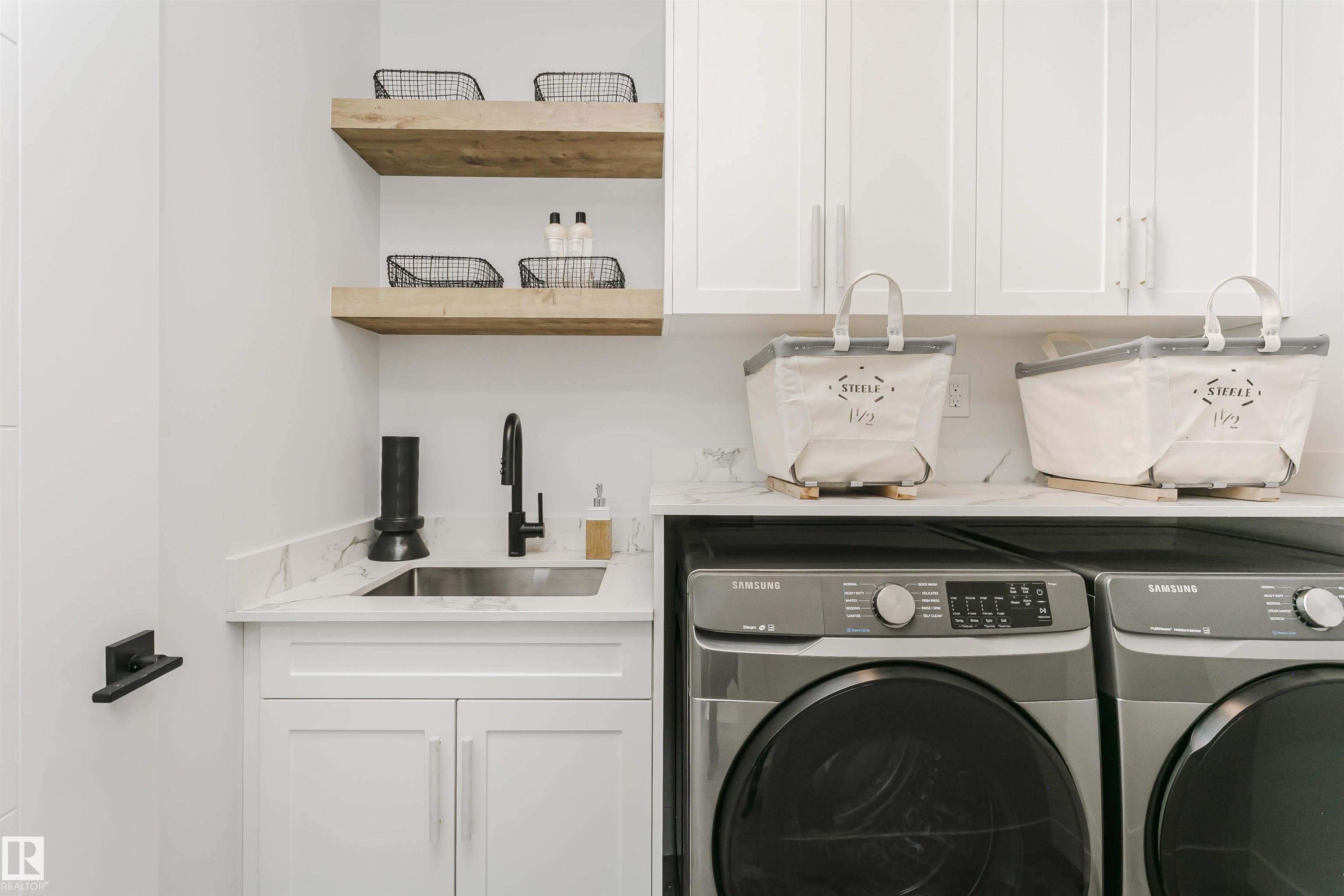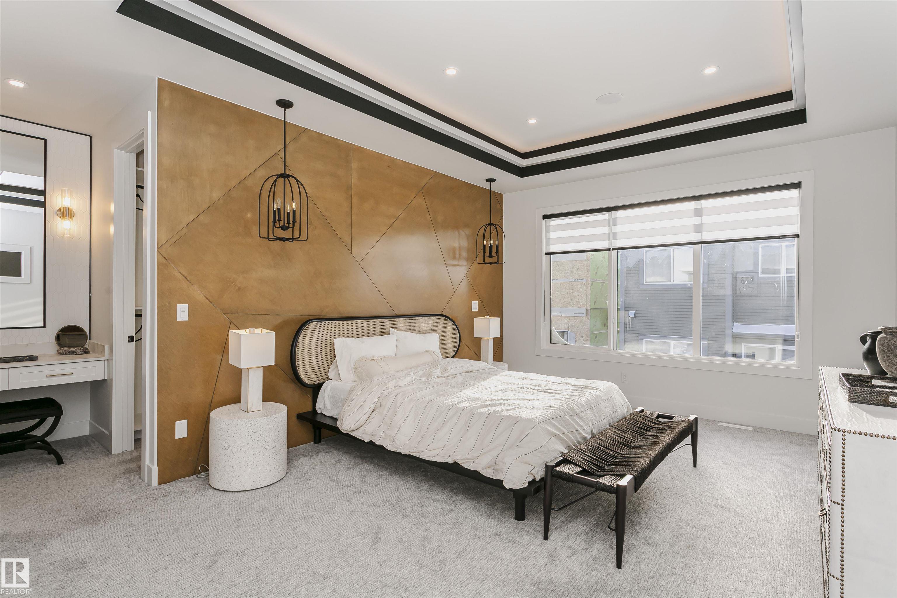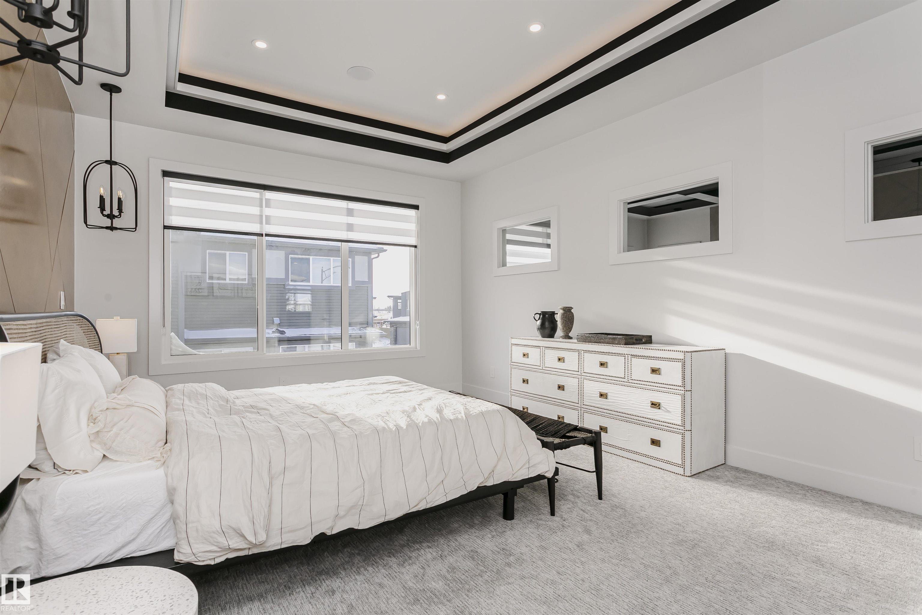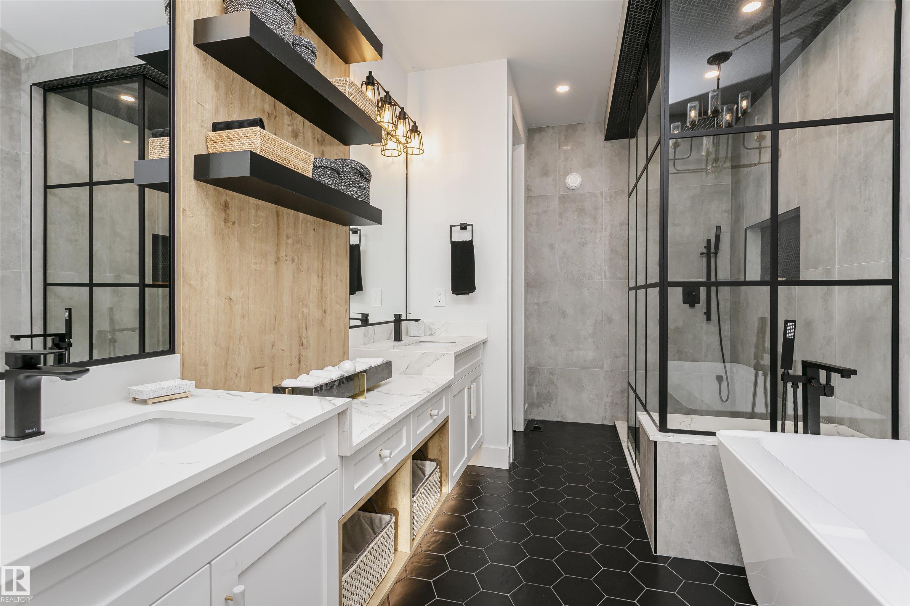 SHOWHOME FOR SALE Exceptional custom-built showhome by ART HOMES with luxury finishes and attention to detail throughout. Main floor features a private office with oversized windows and barn doors, flowing into an open-to-below living room with a unique concrete feature wall. Chef-inspired kitchen with fully upgraded appliances, custom black and white cabinetry, quartz island with double waterfall, warm wood accents, and a striking glass wine wall feature--perfect if you love hosting. Mudroom with custom locker-style cabinets. Upper level offers a luxurious primary suite with heated floors, spa-style custom tiled shower with rain head and body sprays, skylight, private makeup vanity, and custom walk-in closets, along with two additional bedrooms, a full bath, and convenient laundry. Fully finished basement with in-floor heating, guest bedroom and bath, and spacious rec room with bar. Includes air conditioning and is move-in ready with all upgraded appliances.