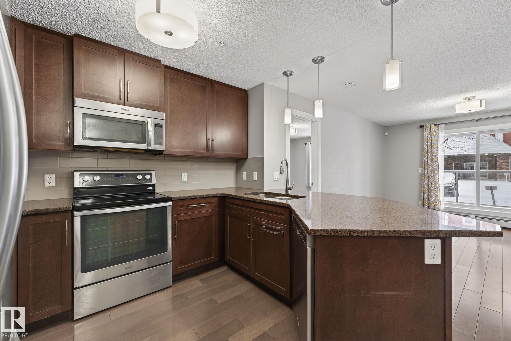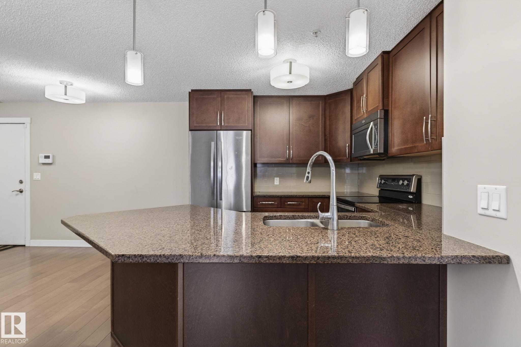 Welcome to Aspen Meadows! This modern 2-bedroom, 2-bath condo offers air conditioning, a bright open-concept layout with 9-ft ceilings, and engineered hardwood throughout. The chef-inspired kitchen features full-height cabinetry, granite countertops, a ceramic tile backsplash, stainless steel appliances, and a large island ideal for entertaining. The primary bedroom includes a private 3-piece ensuite and a walk-in closet, while the spacious second bedroom is served by a 4-piece main bath. Additional features include in-suite laundry, a private balcony, and secure underground parking. Condo fees include heat, water, and electricity. Conveniently located near golf, public swimming, schools, shopping, and transit, this home combines comfort, style, and an excellent location.