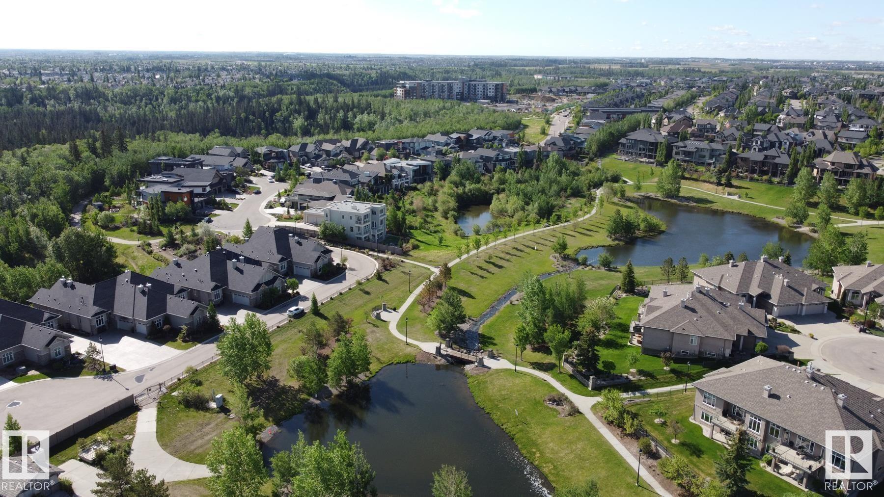 Highly sought after Cascades of Larch Park, backing ravine & fronting walking trails, ponds & park. Fully finished bungalow, offering approx 3300sf of living space w/3 living areas, 3 bedroomsÿ+2 flex rooms. Gleaming hardwood greets you through an open floorplan & rays of natural light. This executive home features 9' ceilings, wainscoting, built-in speakers, upgraded mechanicals & in mint condition. Sunny west facing den is perfect for a home office/library. Great room highlights a stone surround fireplace & provides direct access to balcony/ravine views. Bright kitchen is equippedÿw/plenty of storage space, white maple shaker cabinets, S/S upgraded appliances,ÿgraniteÿcounters & walkthrough pantry. Spacious dining nook can accommodate extended dining. Large primary bedroom w/ample windows, 5pc ensuite & dressing room. Dual seating areas on recreation level, wet bar, gym/flex room, 2 bedrooms, 3pc bath is perfect for extended guest stays. Privately located, surrounded by nature & well maintained complex.