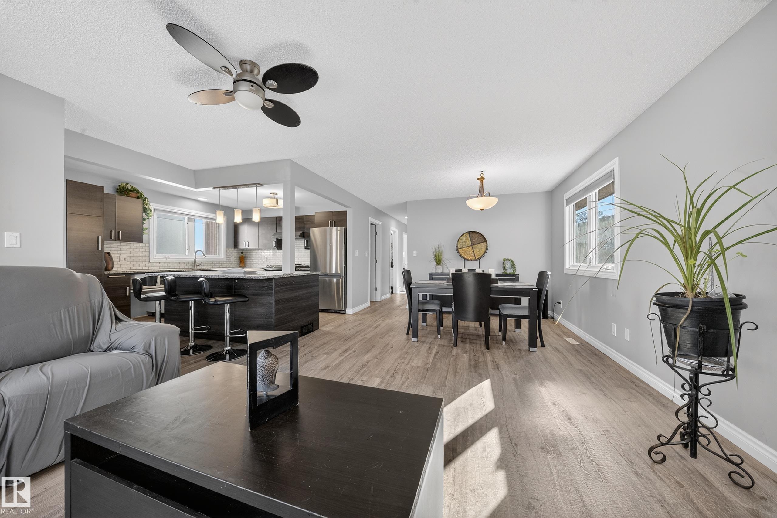 Investors & first-time buyers alert! Well-maintained and extensively updated bungalow offering 4 bedrooms, 2.5 baths, with potential for a 5th bed. Just minutes to NAIT, NorQuest, MacEwan, Rogers Place, Royal Alex Hospital, downtown, etc. The main floor features a spacious kitchen, dining area, and living room with a classic brick-facing fireplace. The primary bedroom with 2-piece ensuite. There are two additional bedrooms and a full bathroom on the main level. The basement comes with a separate entrance and includes a second kitchen with dining nook, a large living area with brick fireplace, one bedroom, full bathroom, laundry, plus an unfinished room that could be converted into a 5th bedroom. Detached garage and backyard with room for a garden. UPGRADES INCLUDE roof and shingles, foundation work with dimpled membrane & weeping tile, remodeled kitchen and baths upstairs, updated windows, vinyl plank flooring, sump pump, backflow valve, front exterior paint, smart thermostat.