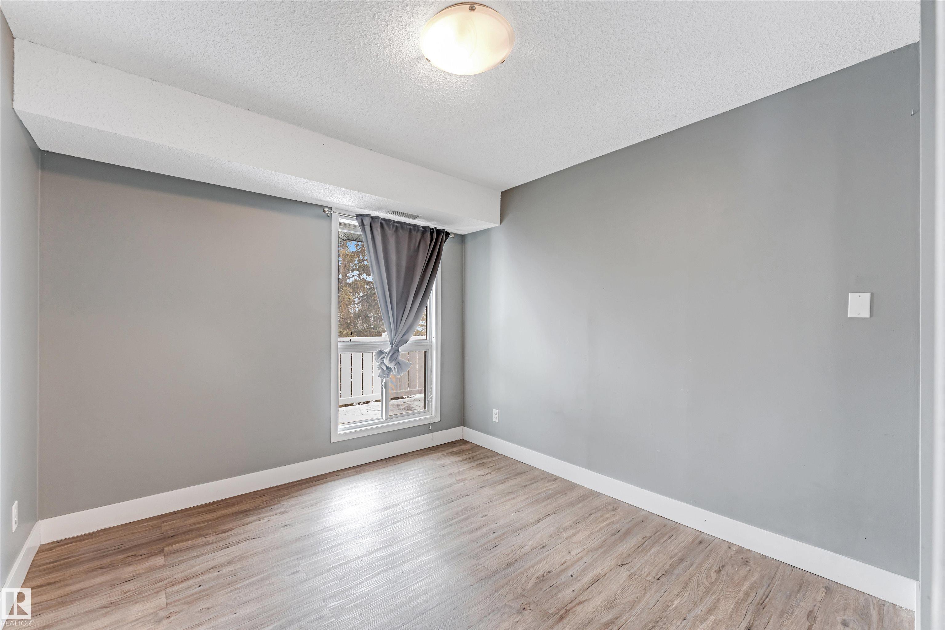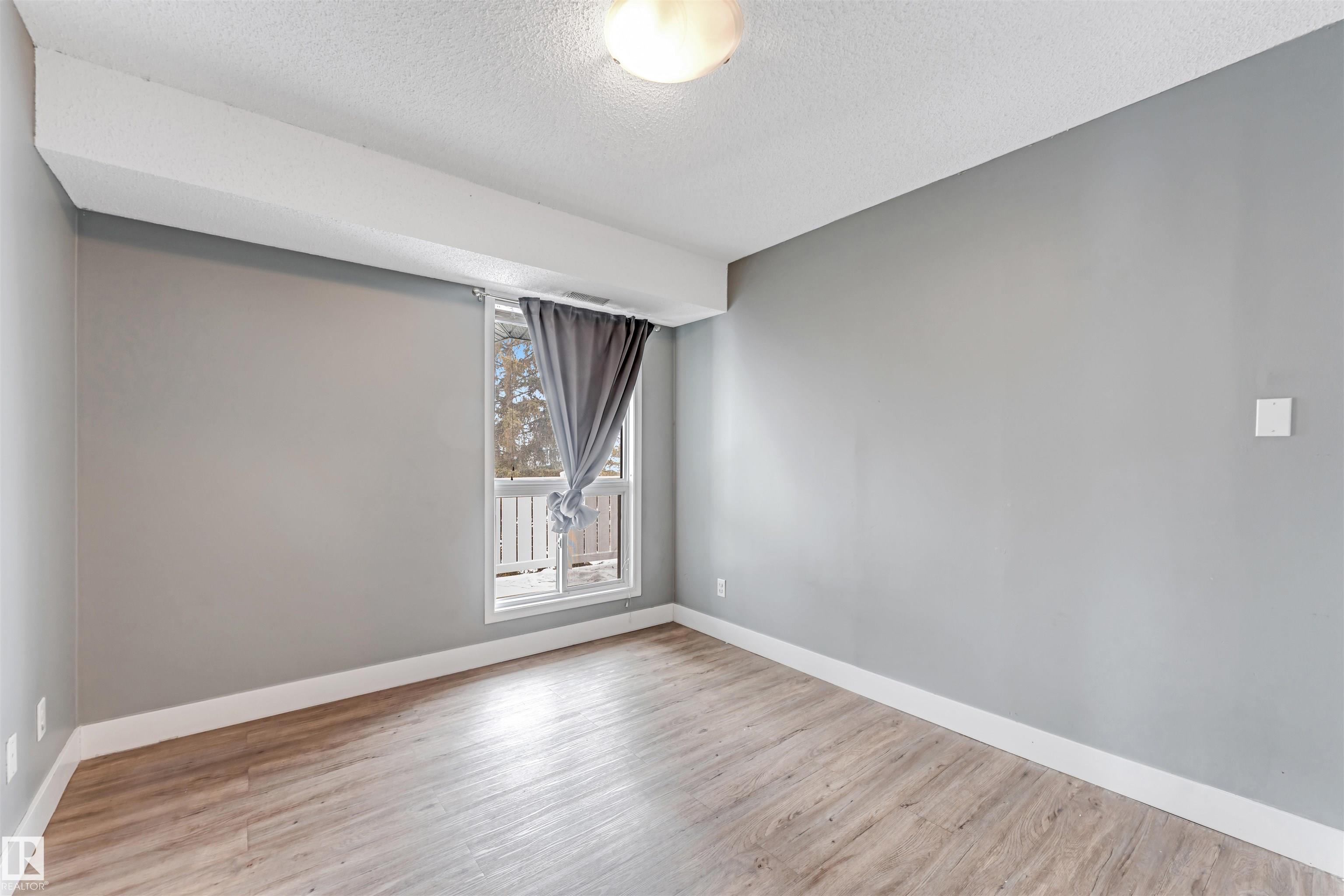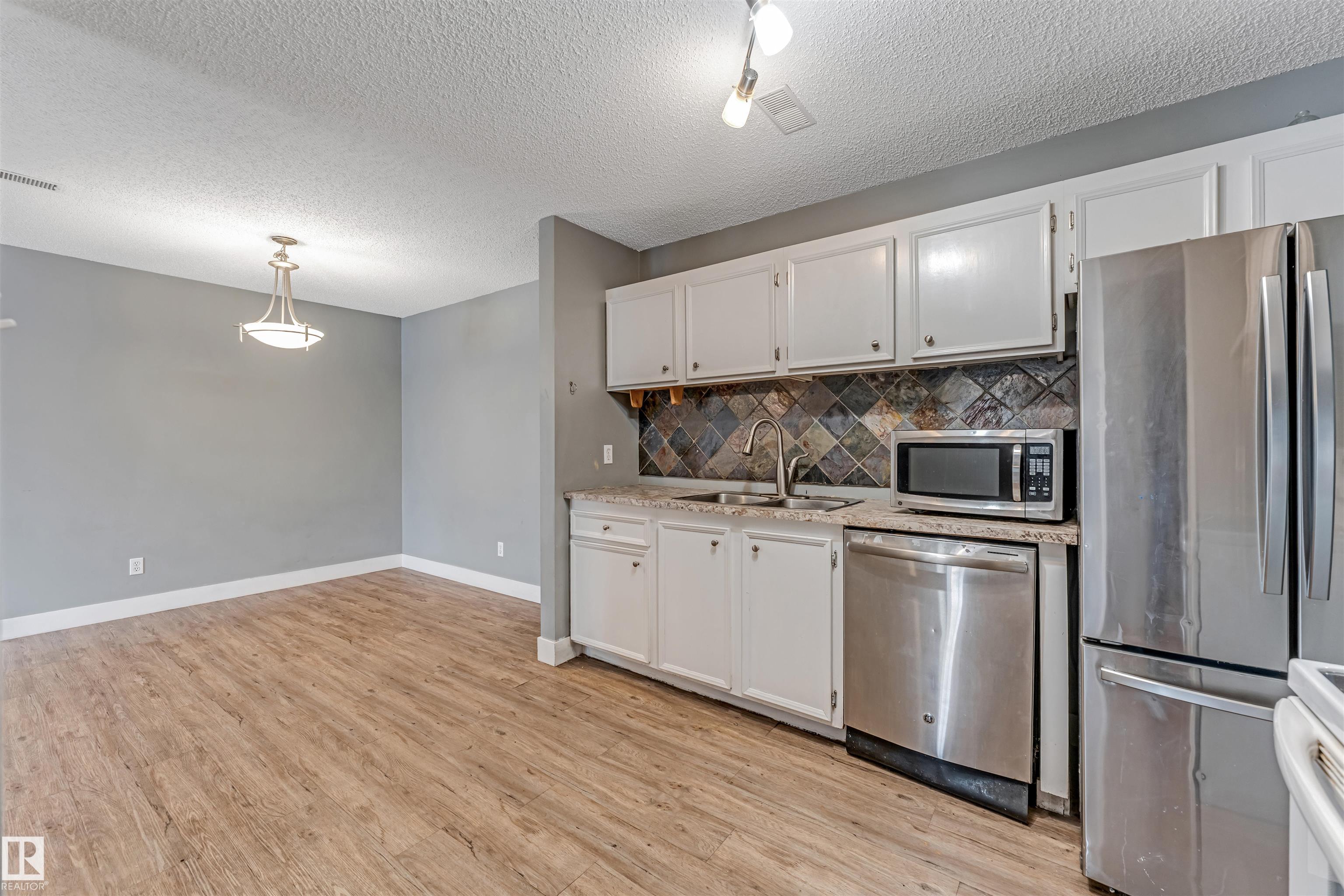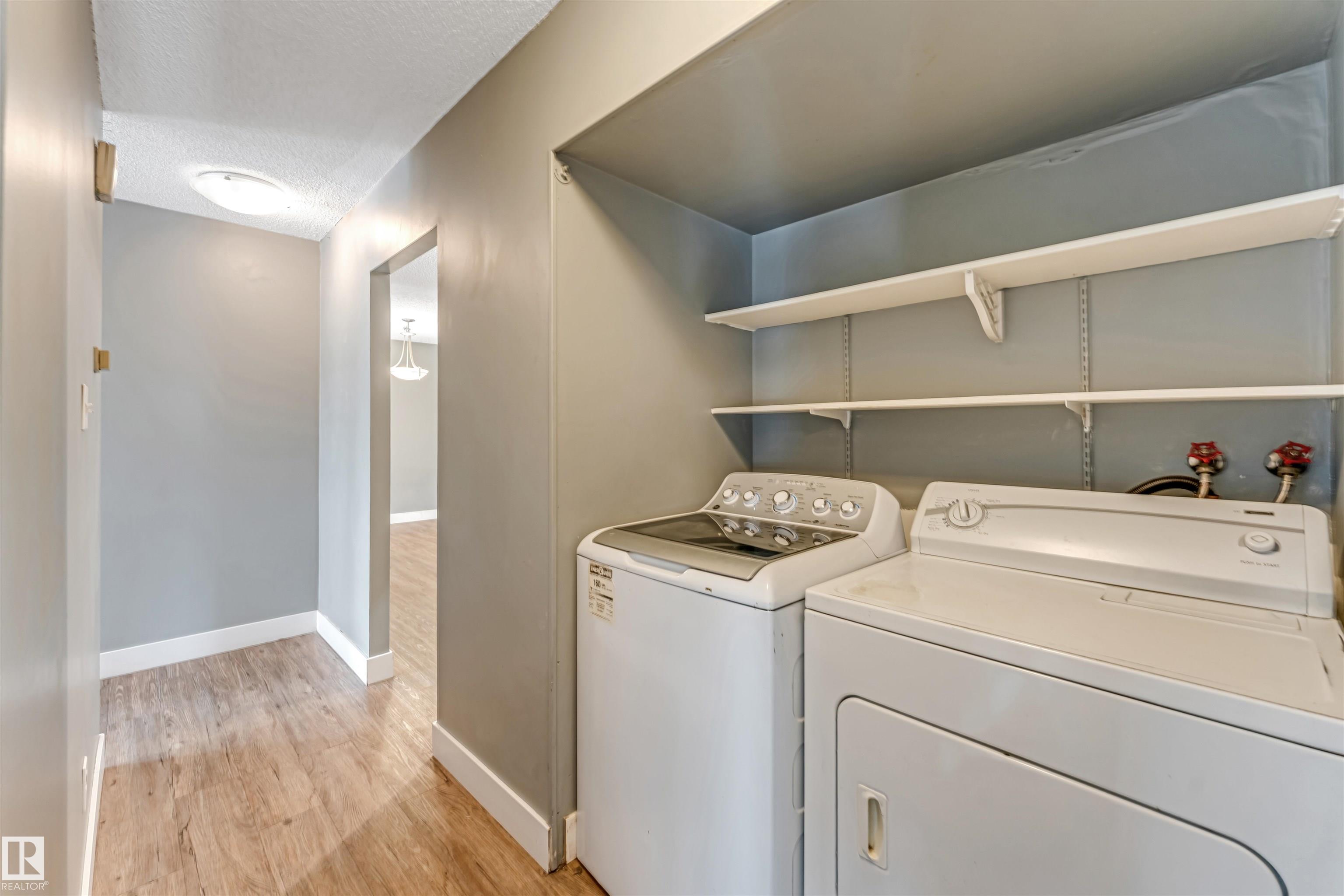 Spacious corner upper unit featuring 3 bedrooms and 1 bathroom. Enjoy a private balcony, exterior storage, and an assigned electrified parking stall, with ample street parking available. Inside, the home offers easy-maintenance vinyl plank flooring throughout. The kitchen showcases white cabinetry, mainly stainless steel appliances, and a walk-in pantry providing excellent storage. The bright living room is highlighted by a cozy fireplace. The primary bedroom includes a generous walk-in closet and convenient dual access to the bathroom. This end unit overlooks a peaceful green space with mature trees and is ideally located close to shopping, parks, schools, and everyday amenities. With excellent access to Gateway Blvd, Calgary Trail, Whitemud Drive, and Anthony Henday, plus a future LRT station nearby, commuting throughout the city is simple and convenient.