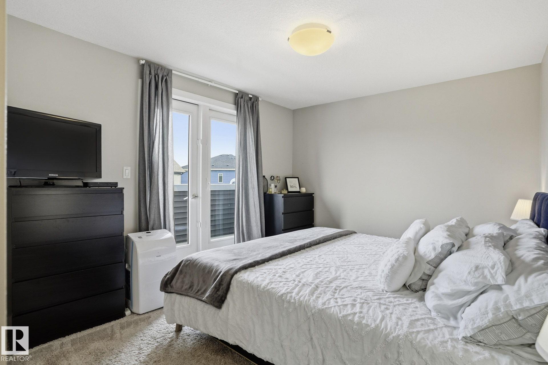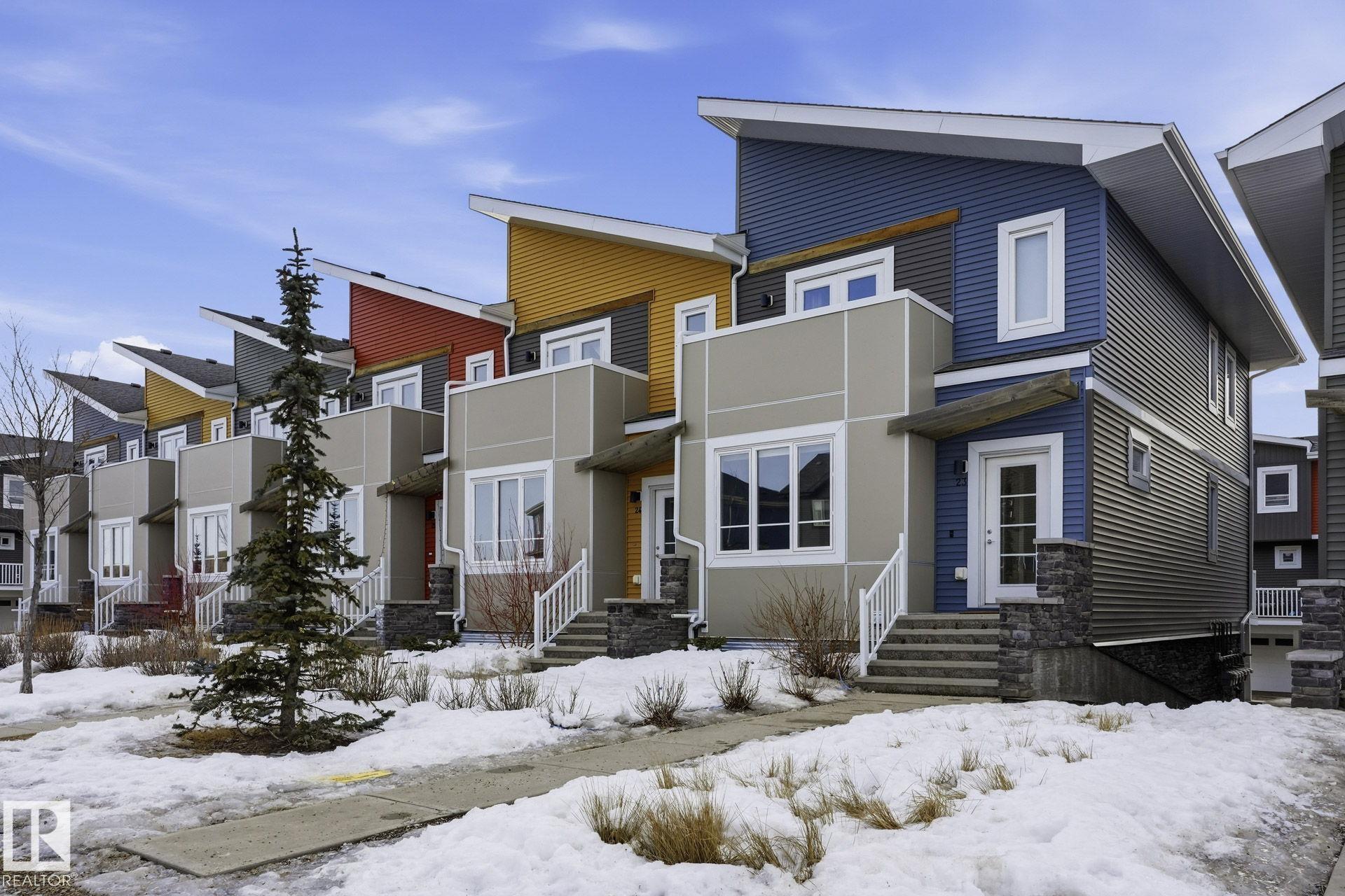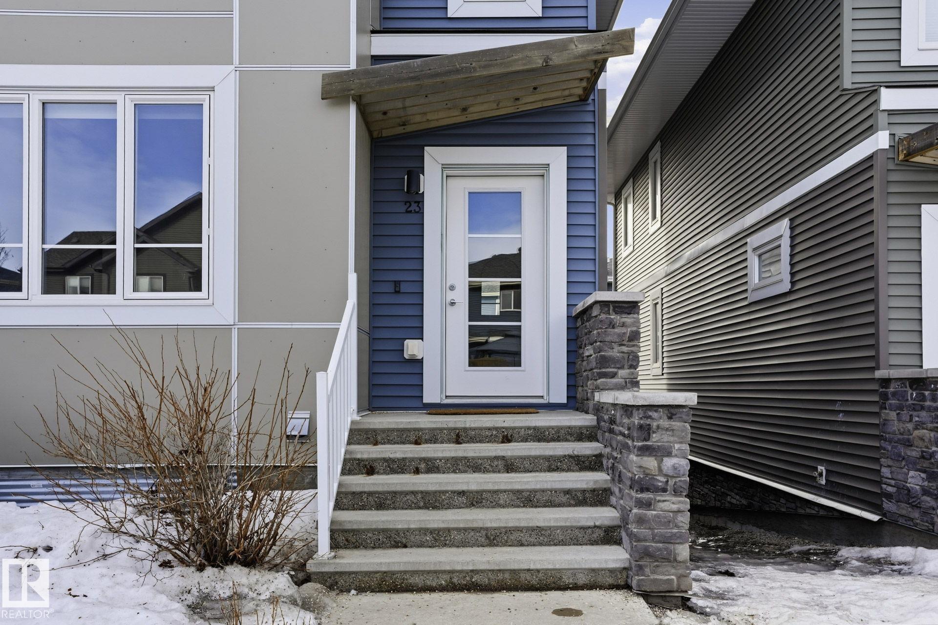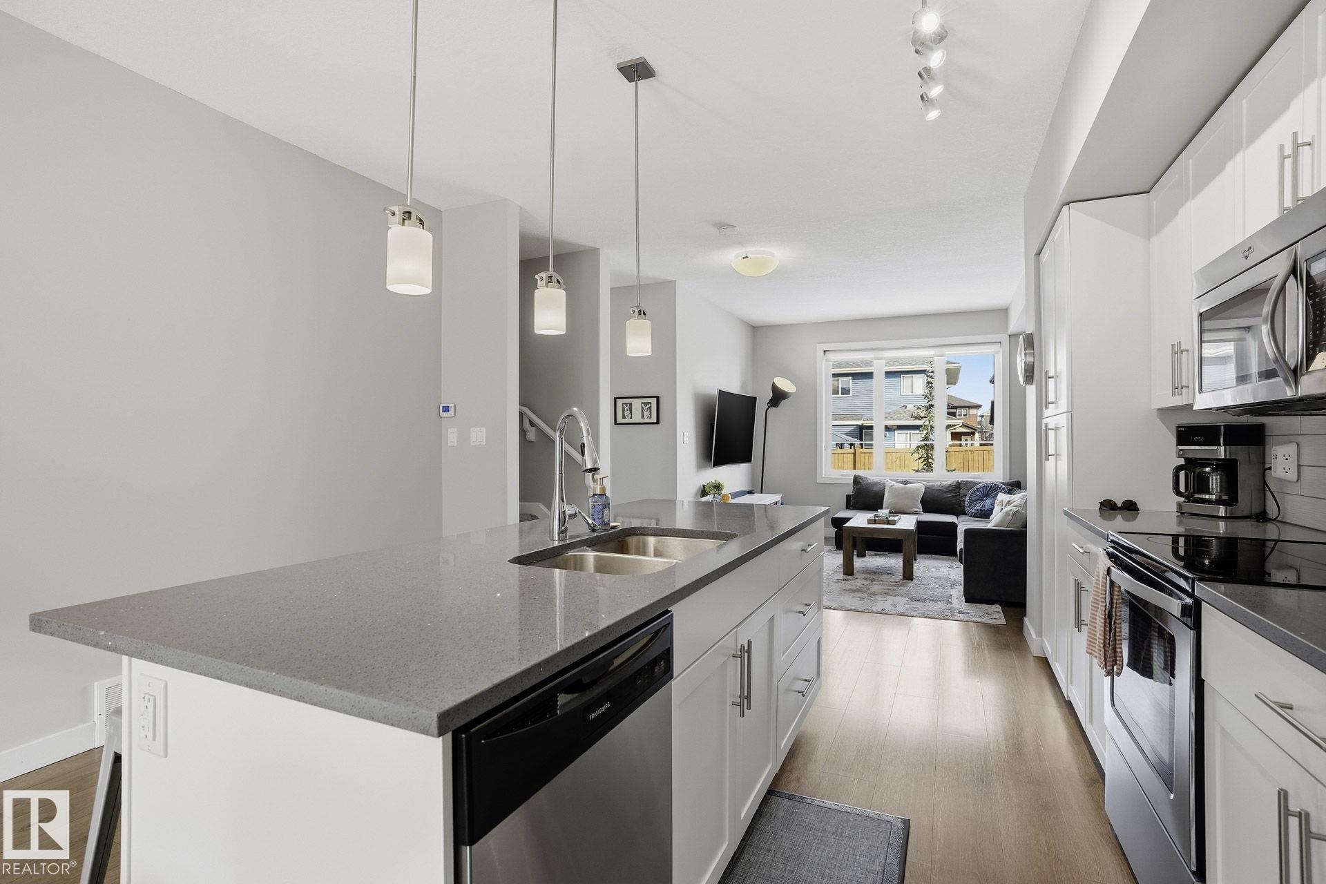 Welcome to this Revv townhome in the community of Walker, offering 3 bedrooms, 2.5 bathrooms, and a double front attached garage. Backing onto a quiet walking path, this property provides a functional layout and convenient access to nearby amenities. The main floor features an open-concept living area with large windows allowing natural light, a modern kitchen with ample cabinetry, island seating, and stainless steel appliances including a new dishwasher. The adjacent dining area offers direct sightlines to the living space, creating a practical layout for everyday living. Upstairs includes three bedrooms, 1 full bathrooms, and a primary bedroom with full ensuite. The upper level also offers convenient laundry with new washer and dryer. Located in a family-friendly neighborhood close to schools, shopping centers, parks, public transit, and Edmonton International Airport, with quick access to major roadways. An opportunity to own in the established and growing community of Walker.