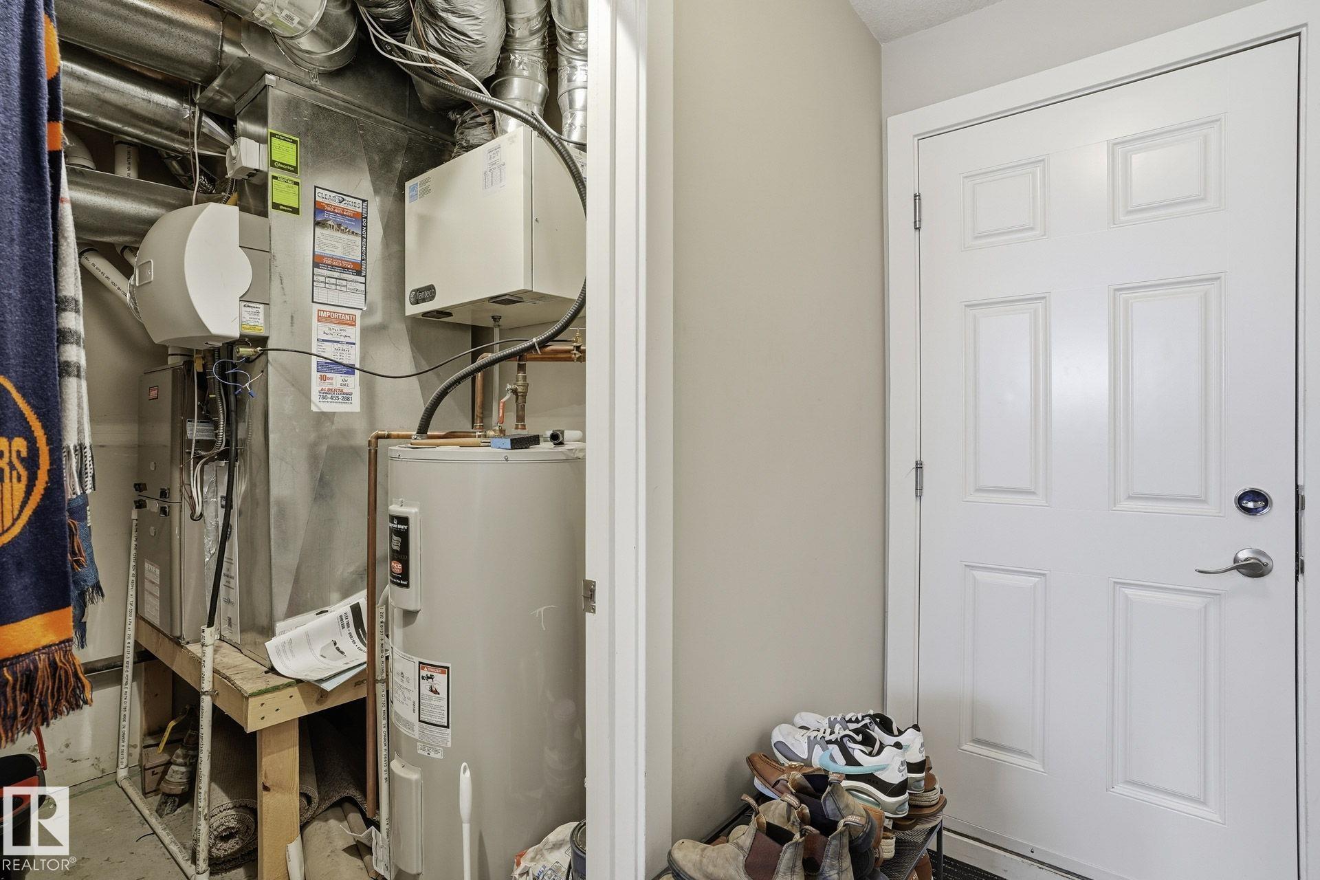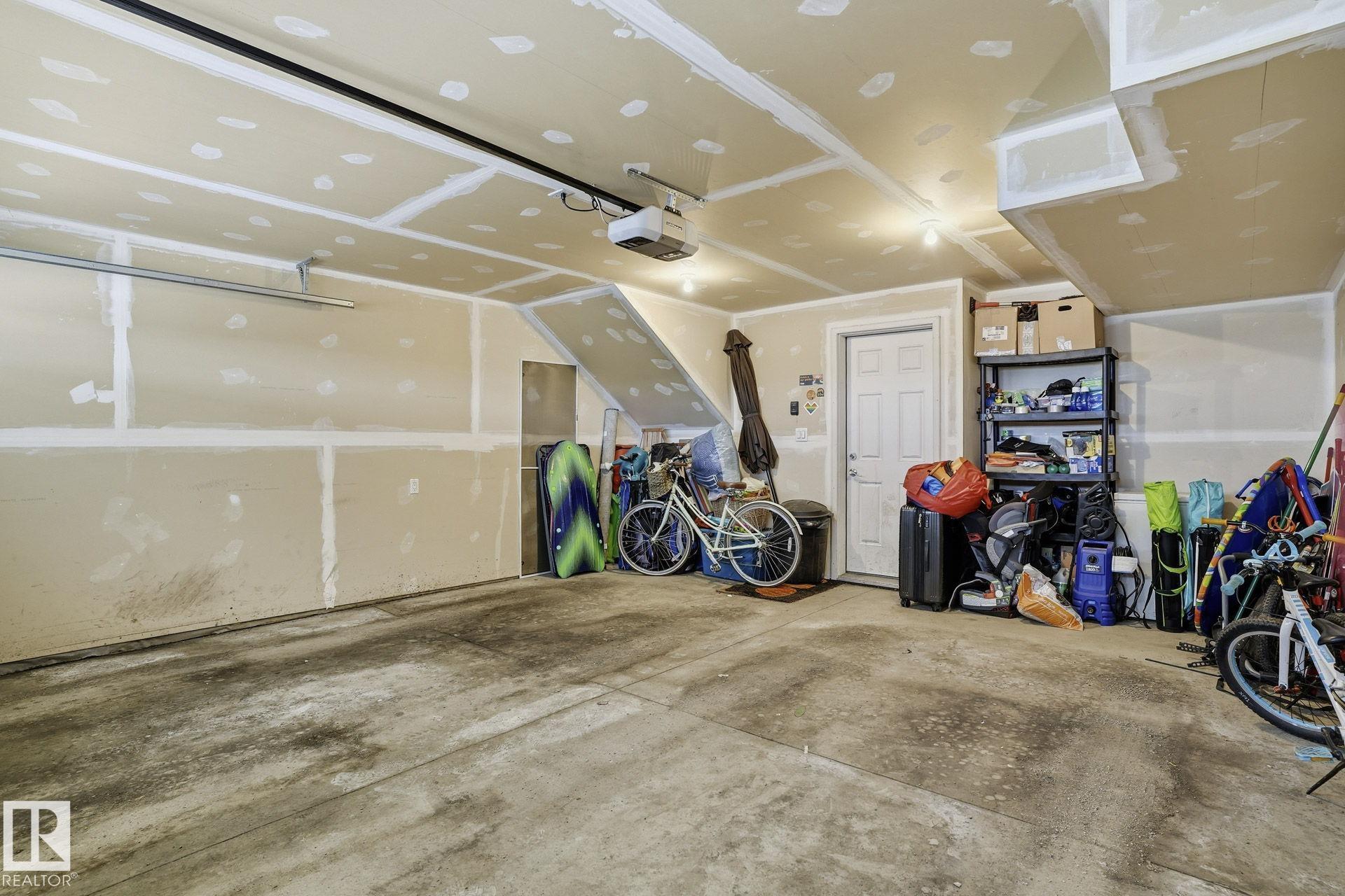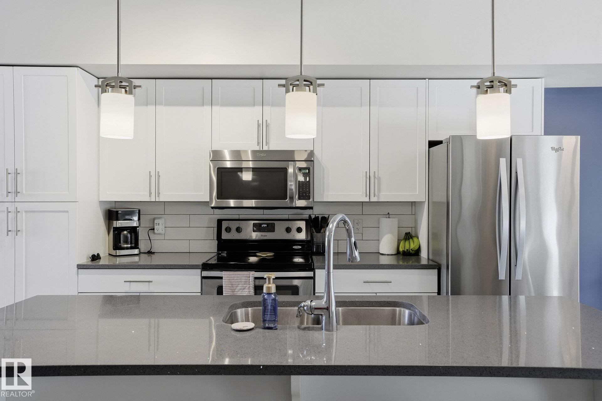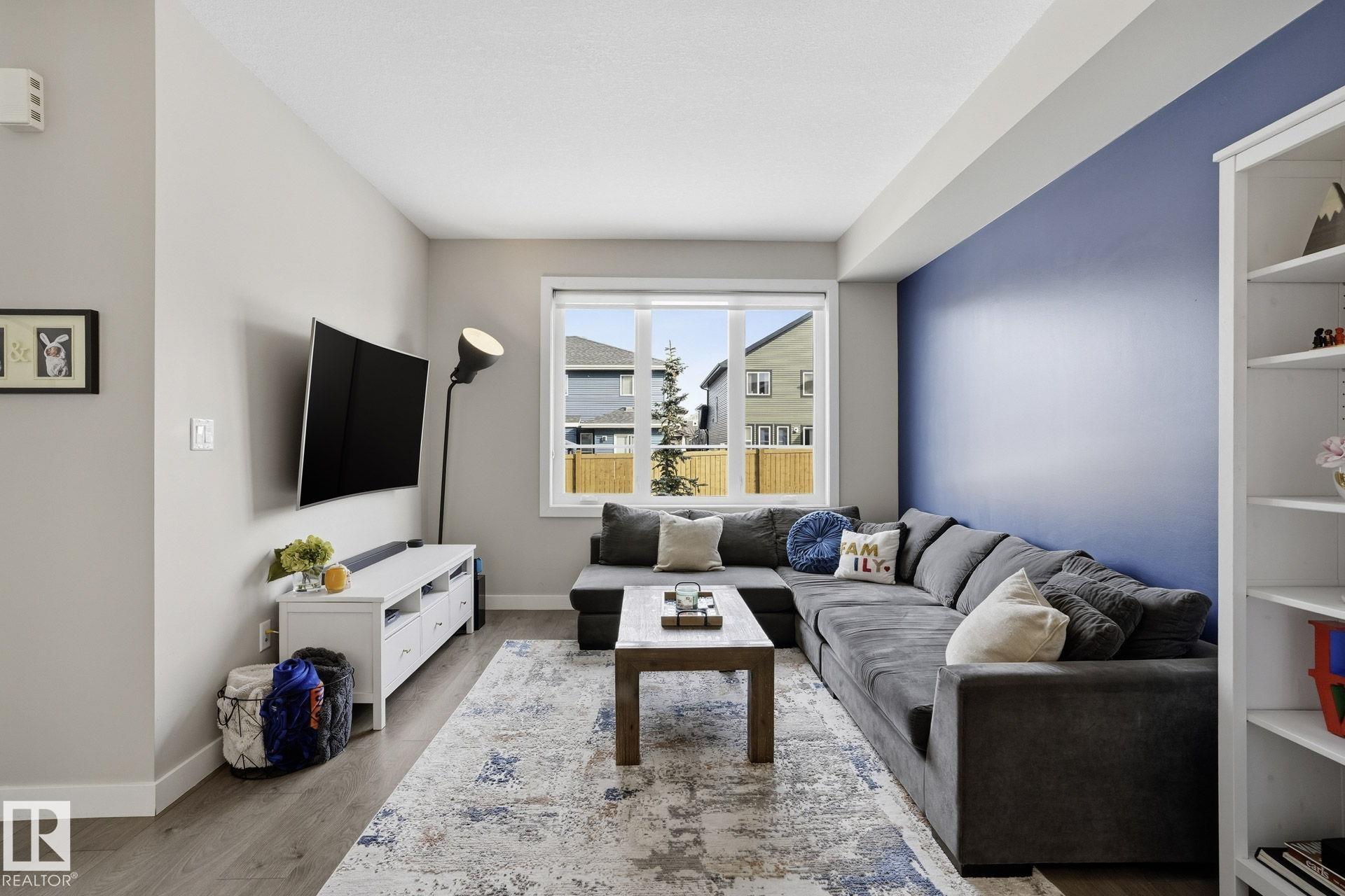 Welcome to this Revv townhome in the community of Walker, offering 3 bedrooms, 2.5 bathrooms, and a double front attached garage. Backing onto a quiet walking path, this property provides a functional layout and convenient access to nearby amenities. The main floor features an open-concept living area with large windows allowing natural light, a modern kitchen with ample cabinetry, island seating, and stainless steel appliances including a new dishwasher. The adjacent dining area offers direct sightlines to the living space, creating a practical layout for everyday living. Upstairs includes three bedrooms, 1 full bathrooms, and a primary bedroom with full ensuite. The upper level also offers convenient laundry with new washer and dryer. Located in a family-friendly neighborhood close to schools, shopping centers, parks, public transit, and Edmonton International Airport, with quick access to major roadways. An opportunity to own in the established and growing community of Walker.
