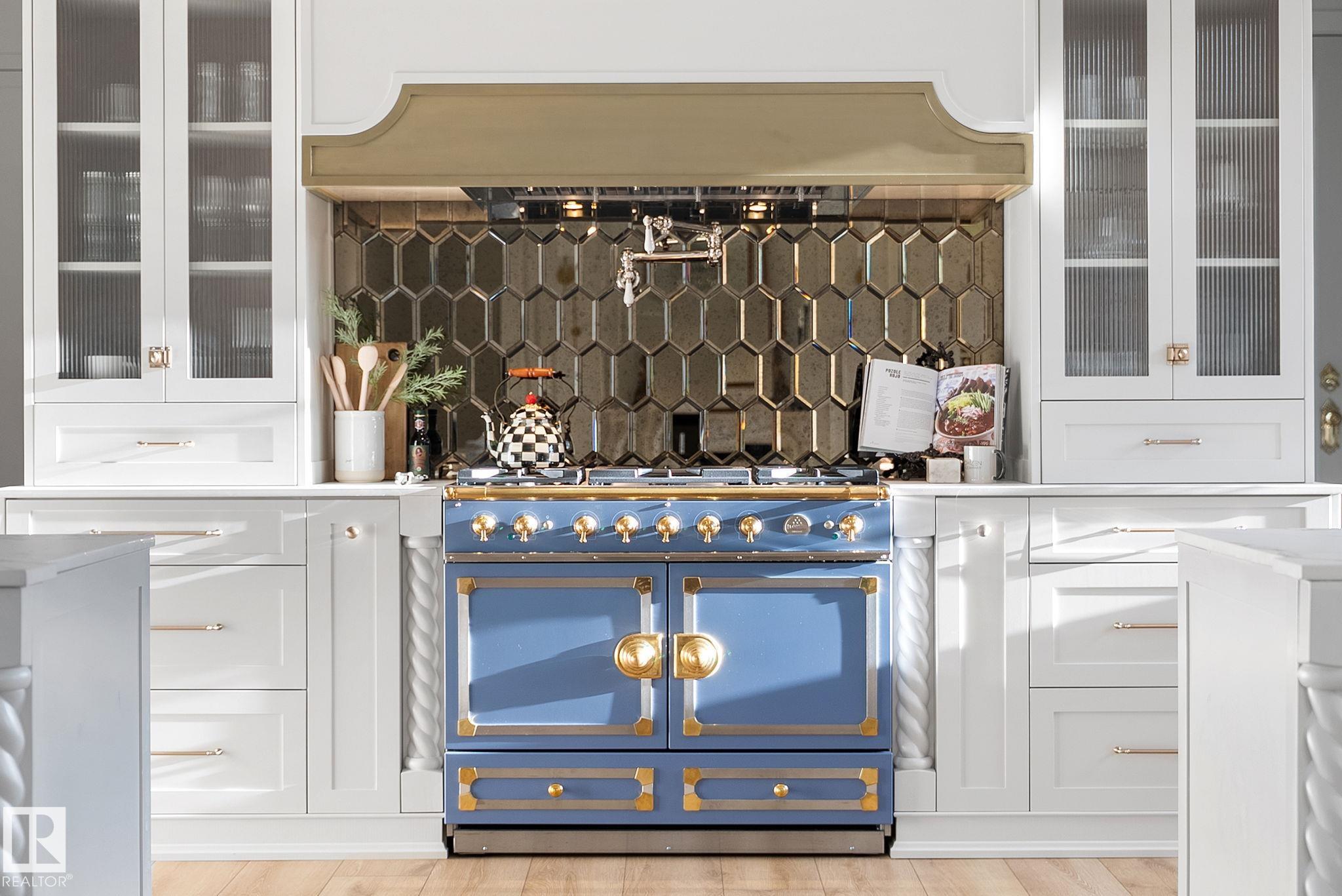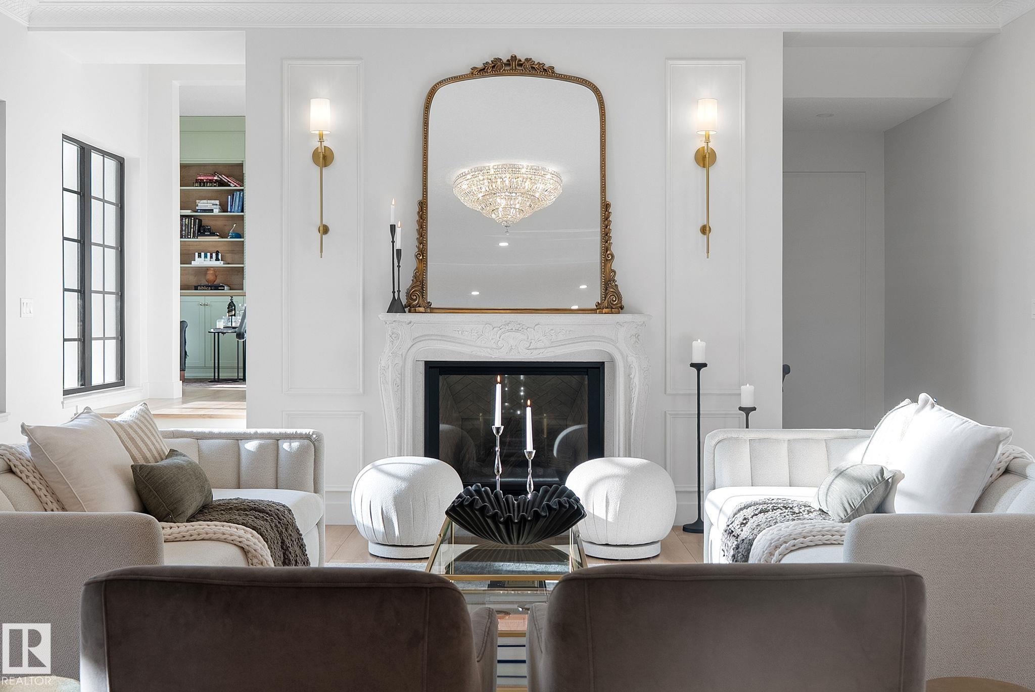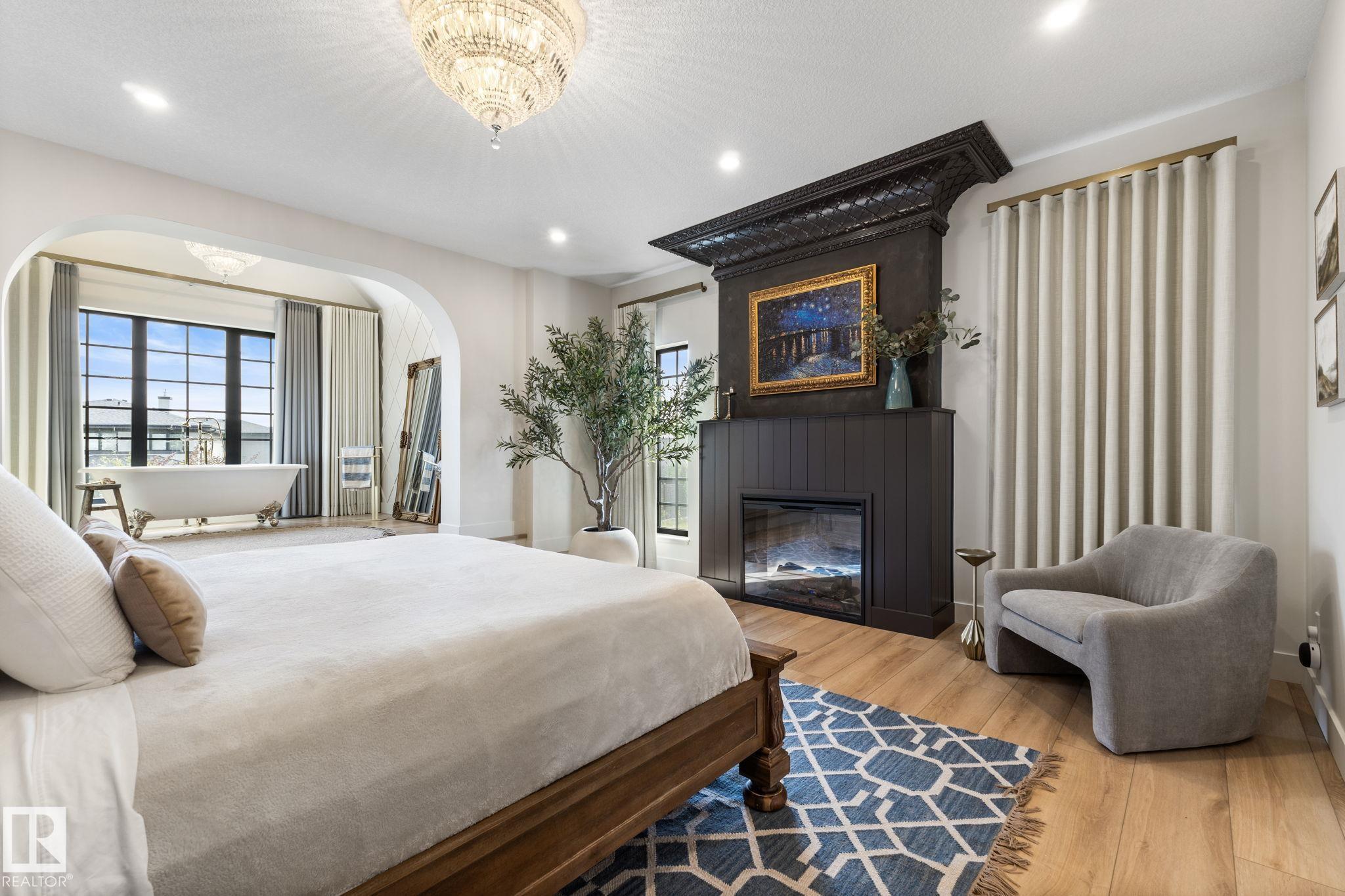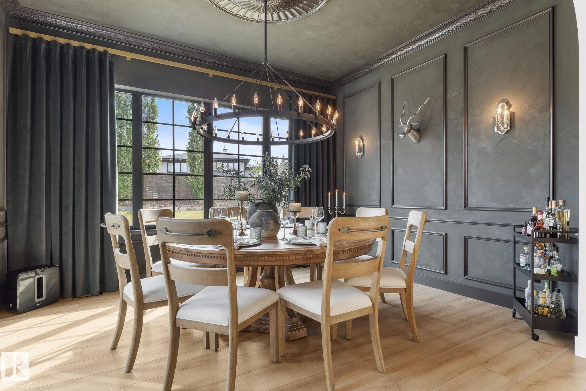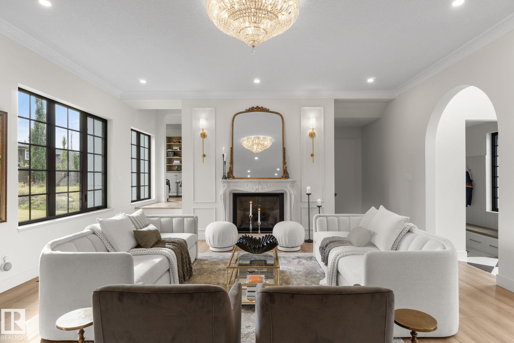Visit the Listing Brokerage (and/or listing REALTOR©) website to obtain additional information. Located on prestigious Windermere Drive, this former Chizen & Co. showhome blends French and German architectural influences with curved metal roofs, copper accents, and a stone fa‡ade. Set on a massive 20,000+ sq ft lot, over 5,500 sq ft of refined living features 10-ft ceilings, a cast-carved stone fireplace, designer lighting, and a chef's kitchen with La Cornue range, paneled appliances, and prep kitchen. The library with custom millwork offers a quiet retreat. The three-tiered primary bedroom includes dual baths, walk-in closet, and fireplace. Highlights include four bedrooms, 3.5 baths, den, hidden wine room, third-story loft with river views, and basement with golf simulator rough-in and arched bar. Outdoors, enjoy a covered entertaining area with grill, pizza oven, and landscaped grounds. A heated five-car garage completes one of Edmonton's most architecturally coveted residences.