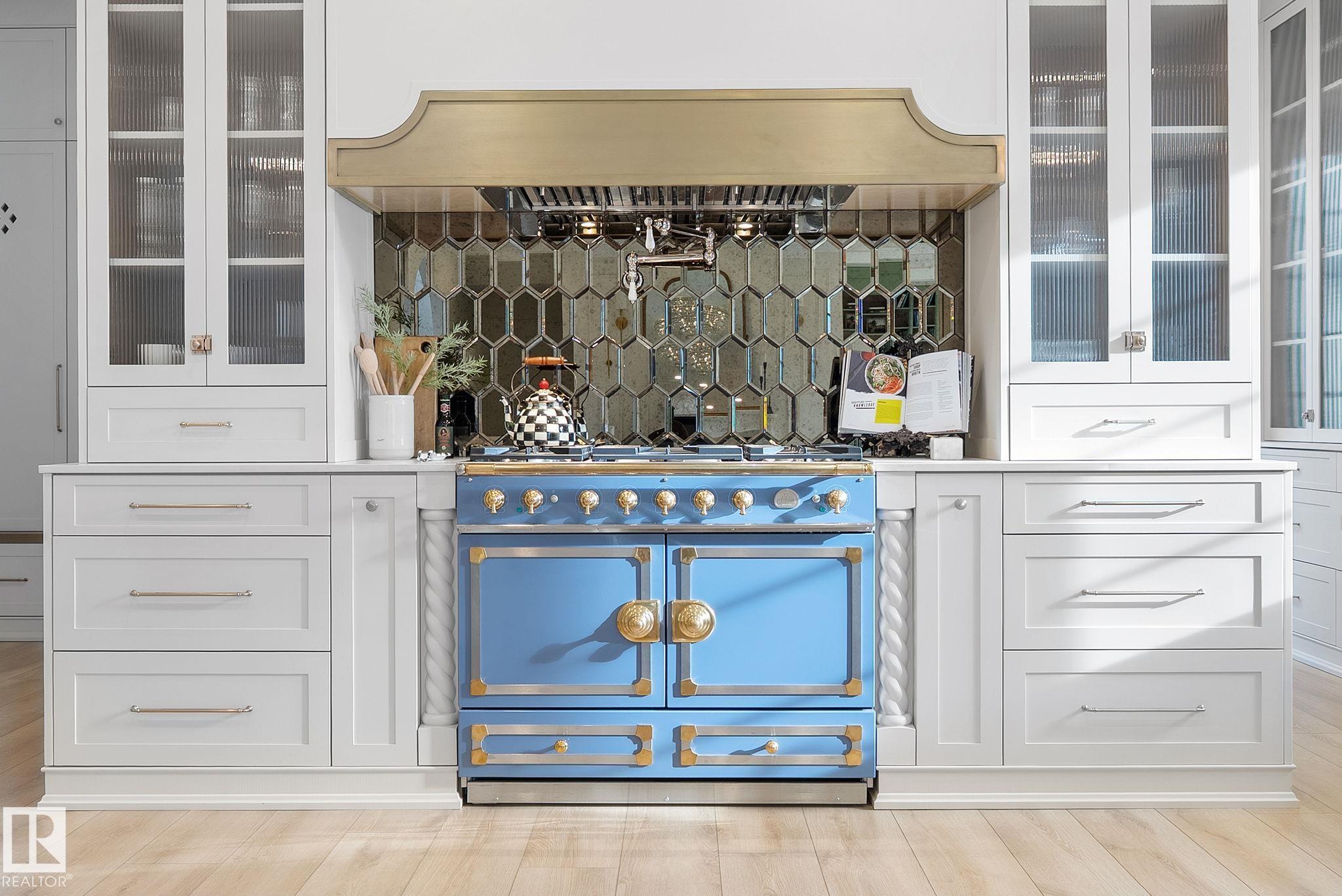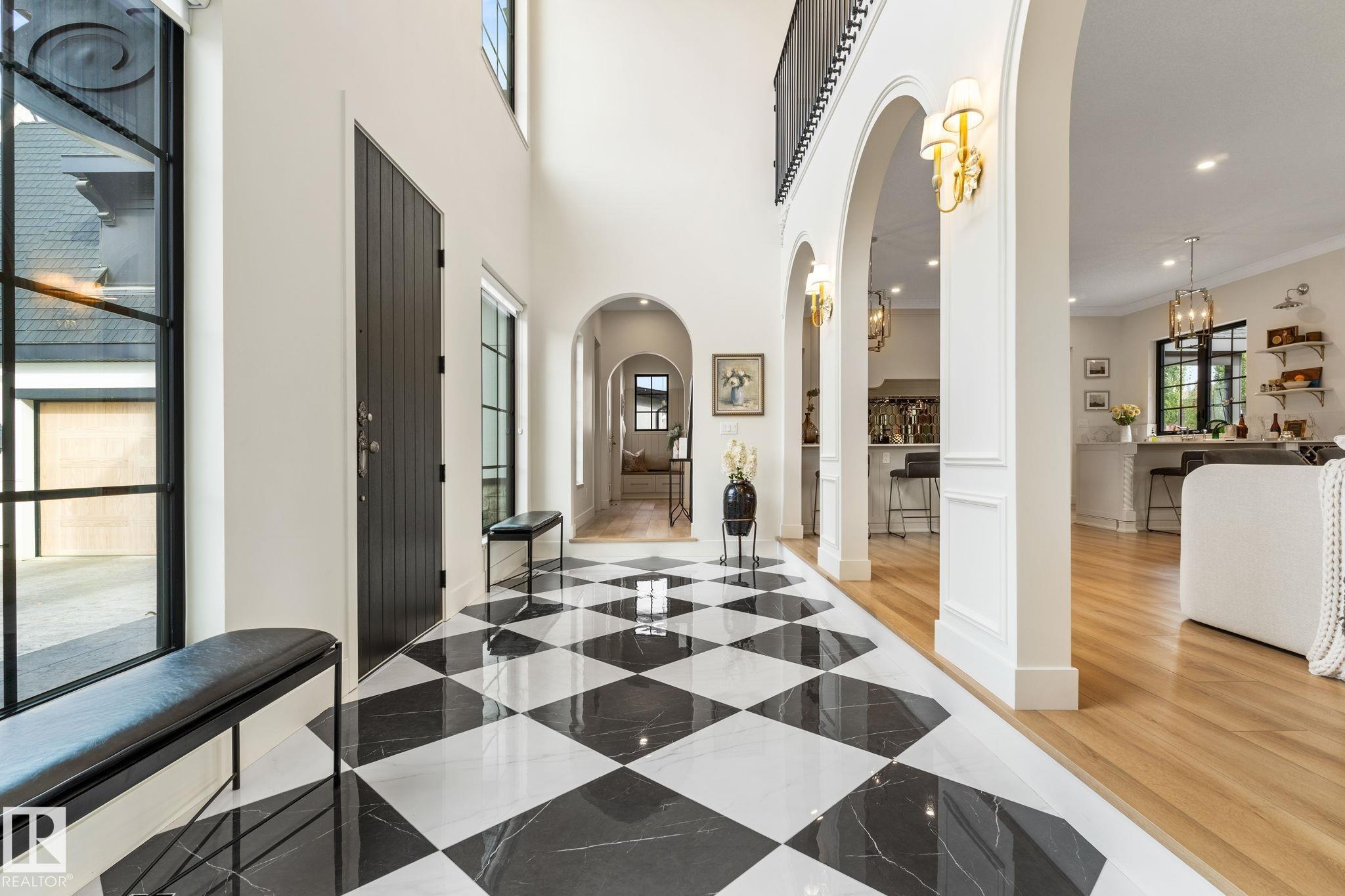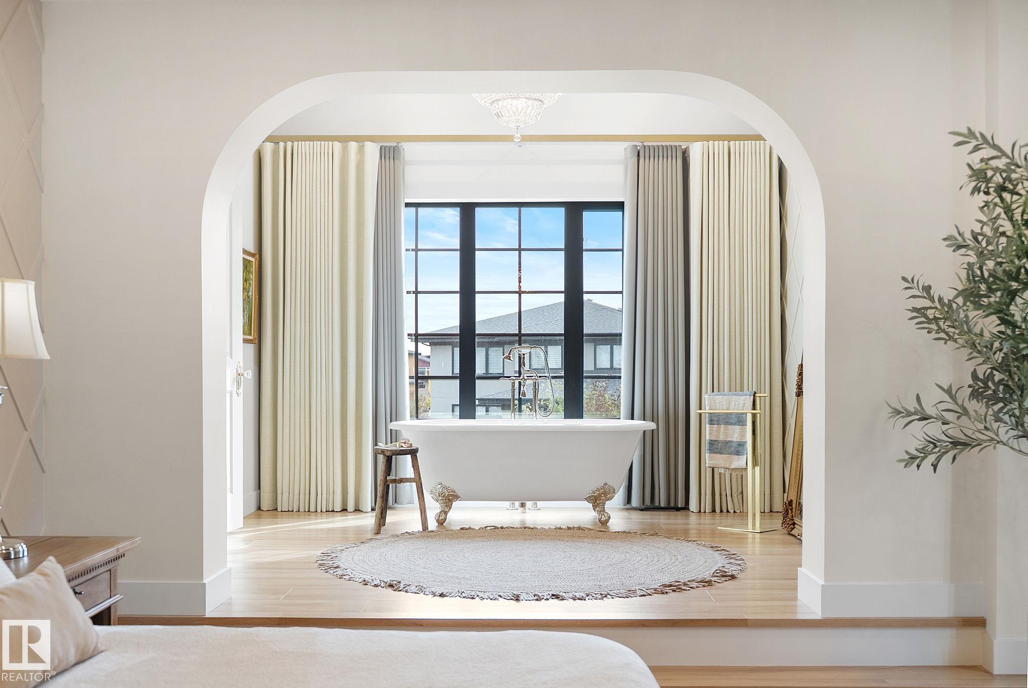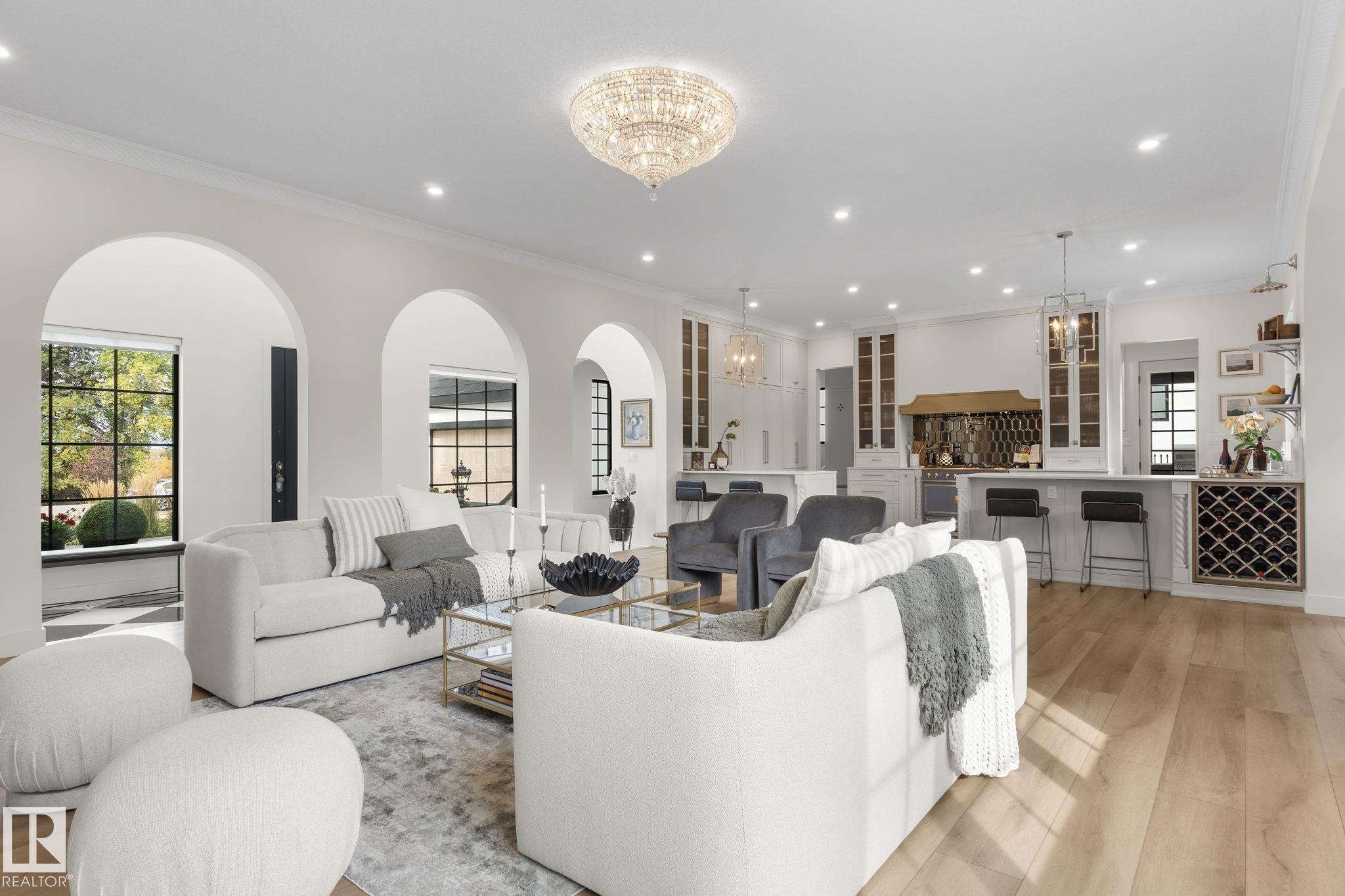 Visit the Listing Brokerage (and/or listing REALTOR©) website to obtain additional information. Located on prestigious Windermere Drive, this former Chizen & Co. showhome blends French and German architectural influences with curved metal roofs, copper accents, and a stone fa‡ade. Set on a massive 20,000+ sq ft lot, over 5,500 sq ft of refined living features 10-ft ceilings, a cast-carved stone fireplace, designer lighting, and a chef's kitchen with La Cornue range, paneled appliances, and prep kitchen. The library with custom millwork offers a quiet retreat. The three-tiered primary bedroom includes dual baths, walk-in closet, and fireplace. Highlights include four bedrooms, 3.5 baths, den, hidden wine room, third-story loft with river views, and basement with golf simulator rough-in and arched bar. Outdoors, enjoy a covered entertaining area with grill, pizza oven, and landscaped grounds. A heated five-car garage completes one of Edmonton's most architecturally coveted residences.