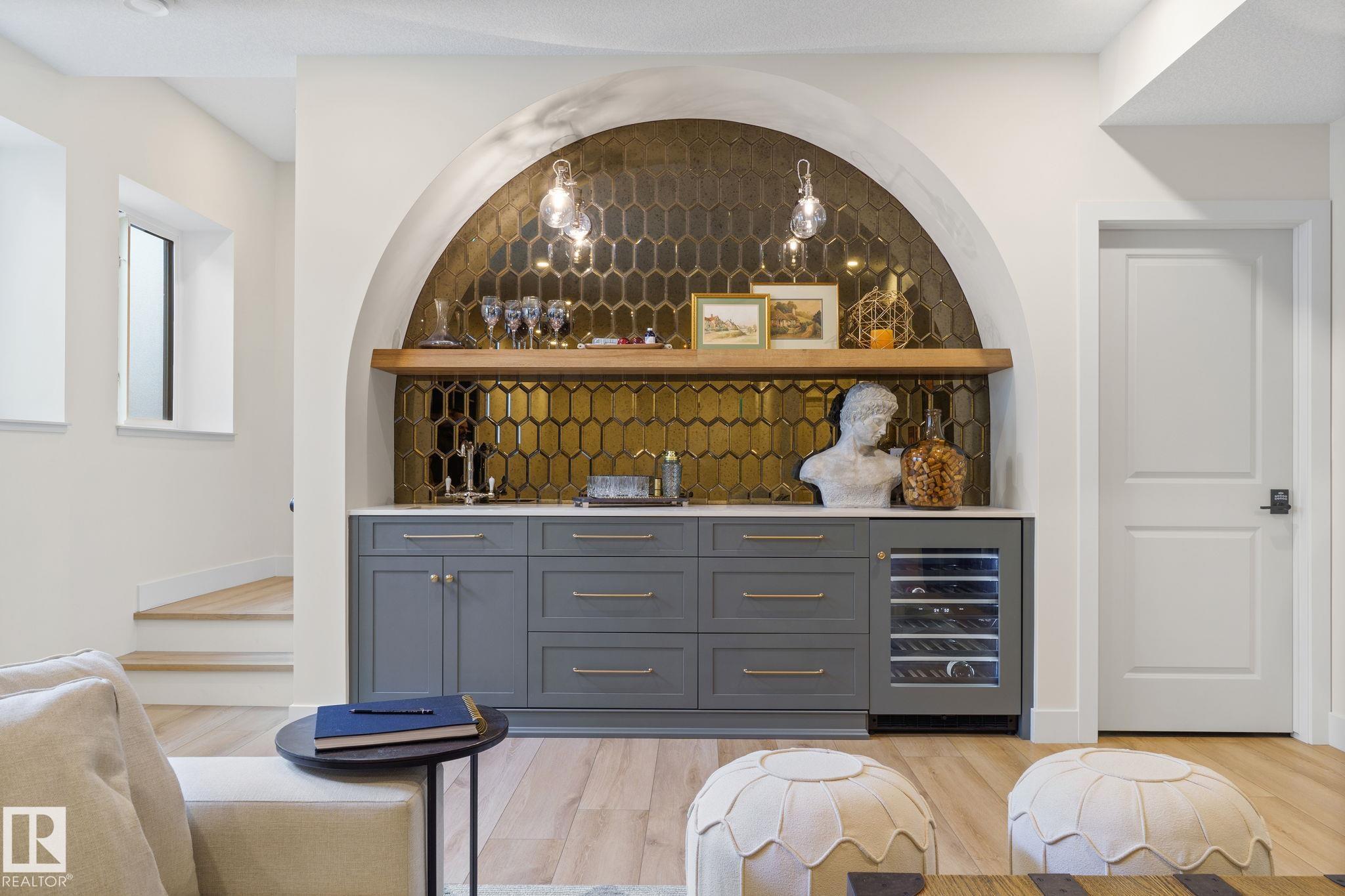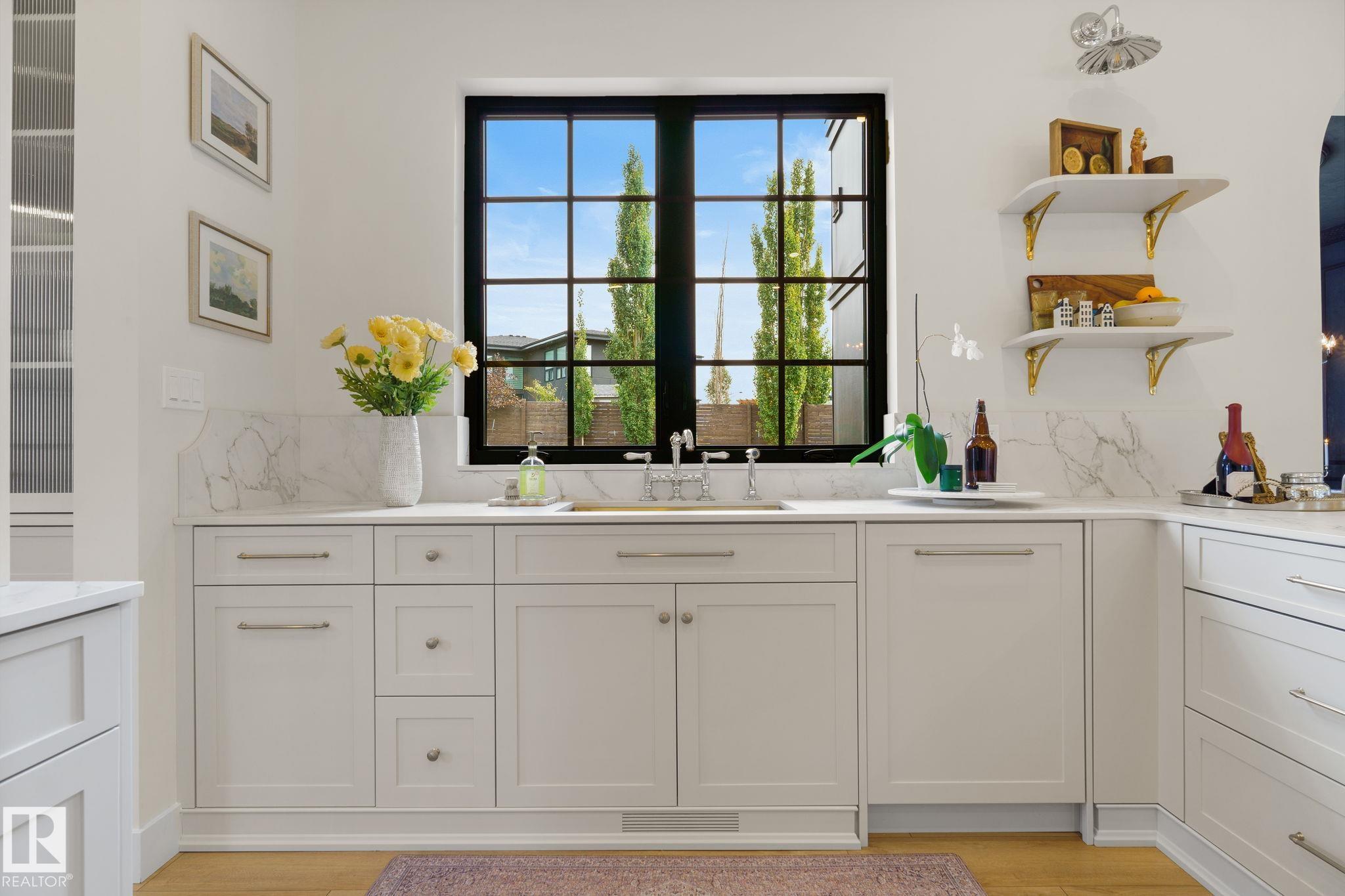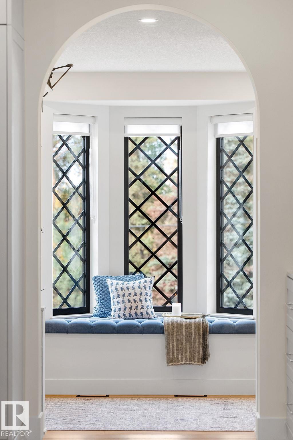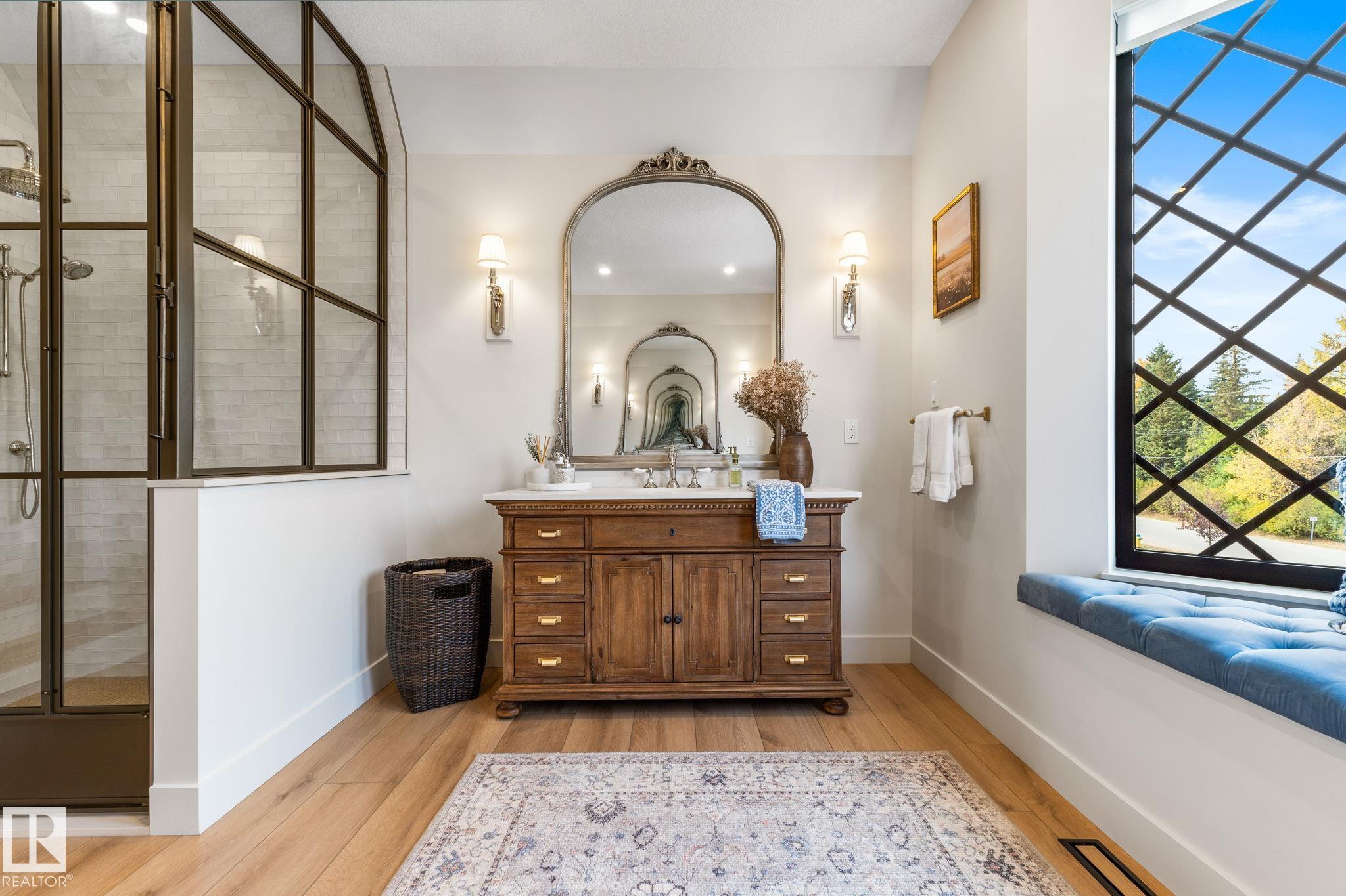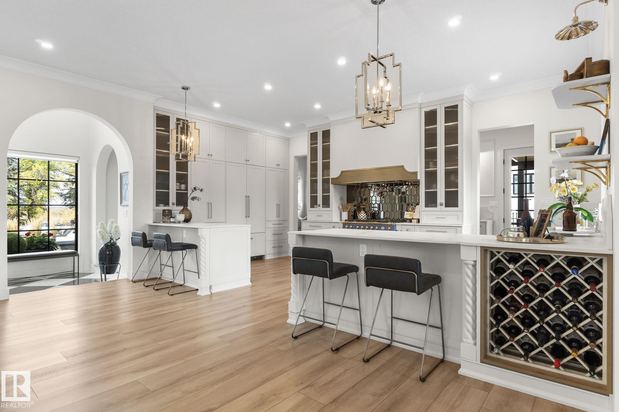 Visit the Listing Brokerage (and/or listing REALTOR©) website to obtain additional information. Located on prestigious Windermere Drive, this former Chizen & Co. showhome blends French and German architectural influences with curved metal roofs, copper accents, and a stone fa‡ade. Set on a massive 20,000+ sq ft lot, over 5,500 sq ft of refined living features 10-ft ceilings, a cast-carved stone fireplace, designer lighting, and a chef's kitchen with La Cornue range, paneled appliances, and prep kitchen. The library with custom millwork offers a quiet retreat. The three-tiered primary bedroom includes dual baths, walk-in closet, and fireplace. Highlights include four bedrooms, 3.5 baths, den, hidden wine room, third-story loft with river views, and basement with golf simulator rough-in and arched bar. Outdoors, enjoy a covered entertaining area with grill, pizza oven, and landscaped grounds. A heated five-car garage completes one of Edmonton's most architecturally coveted residences.