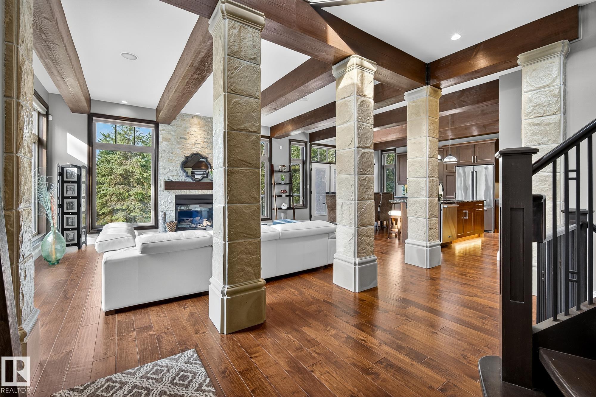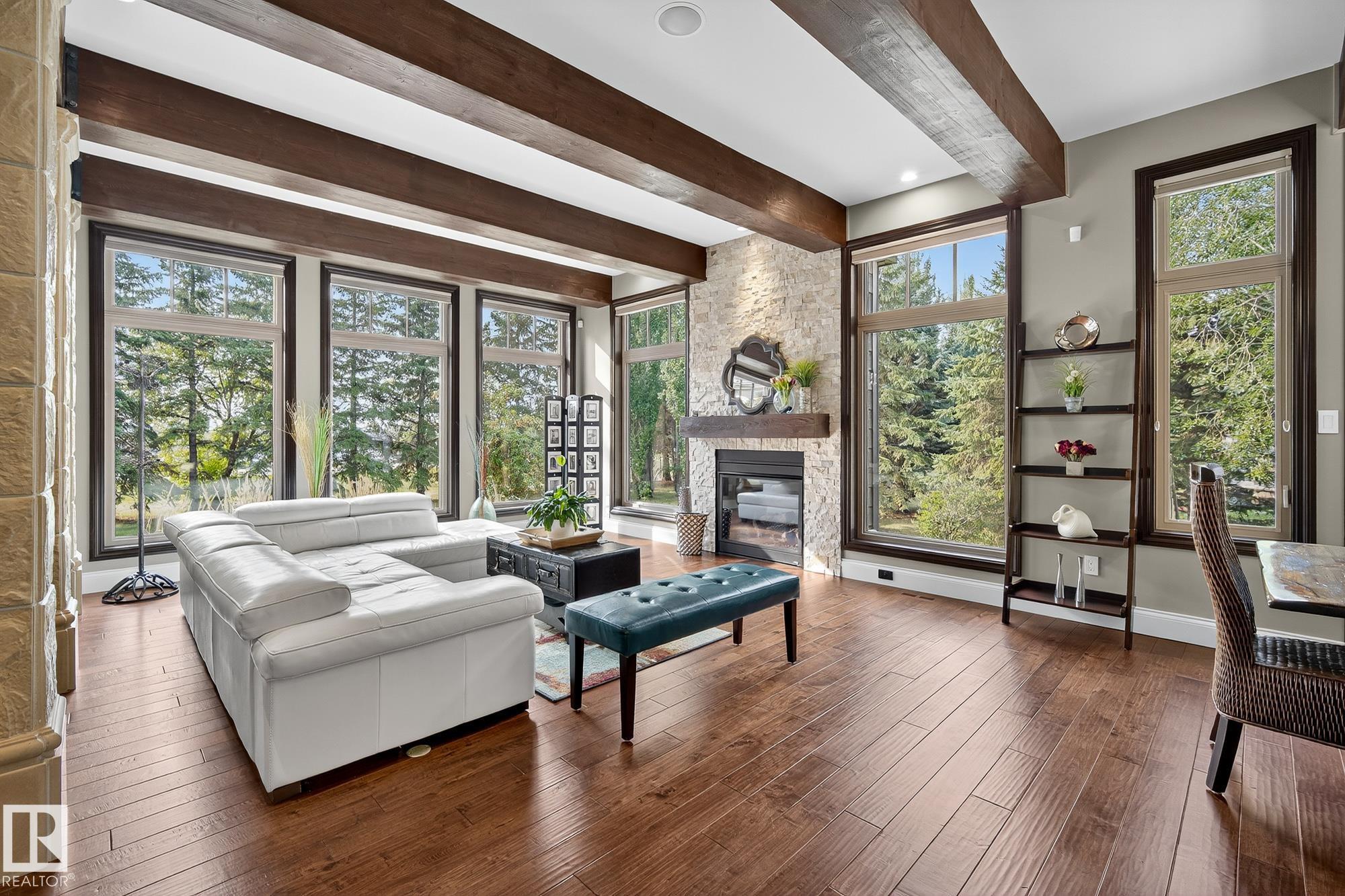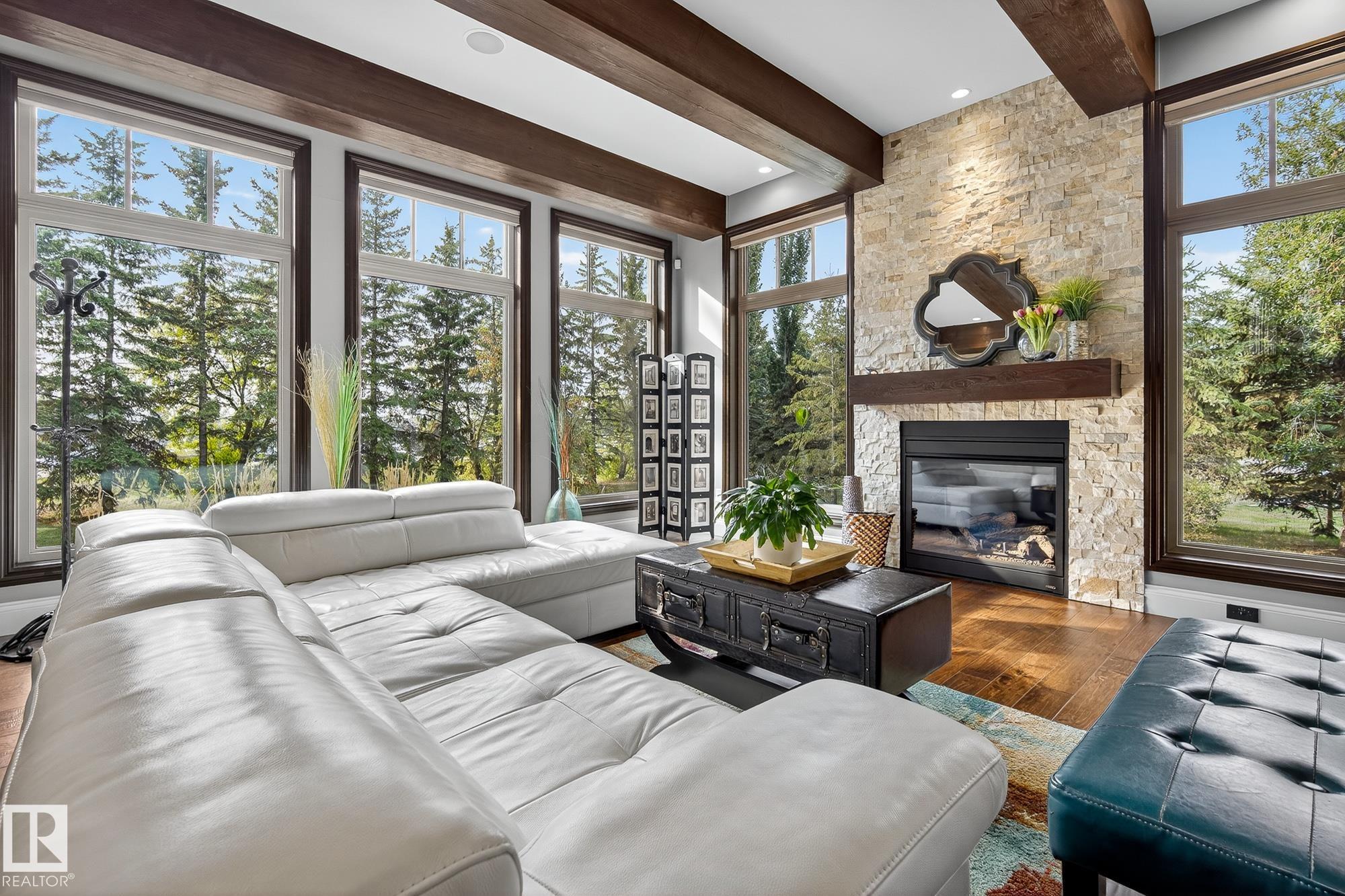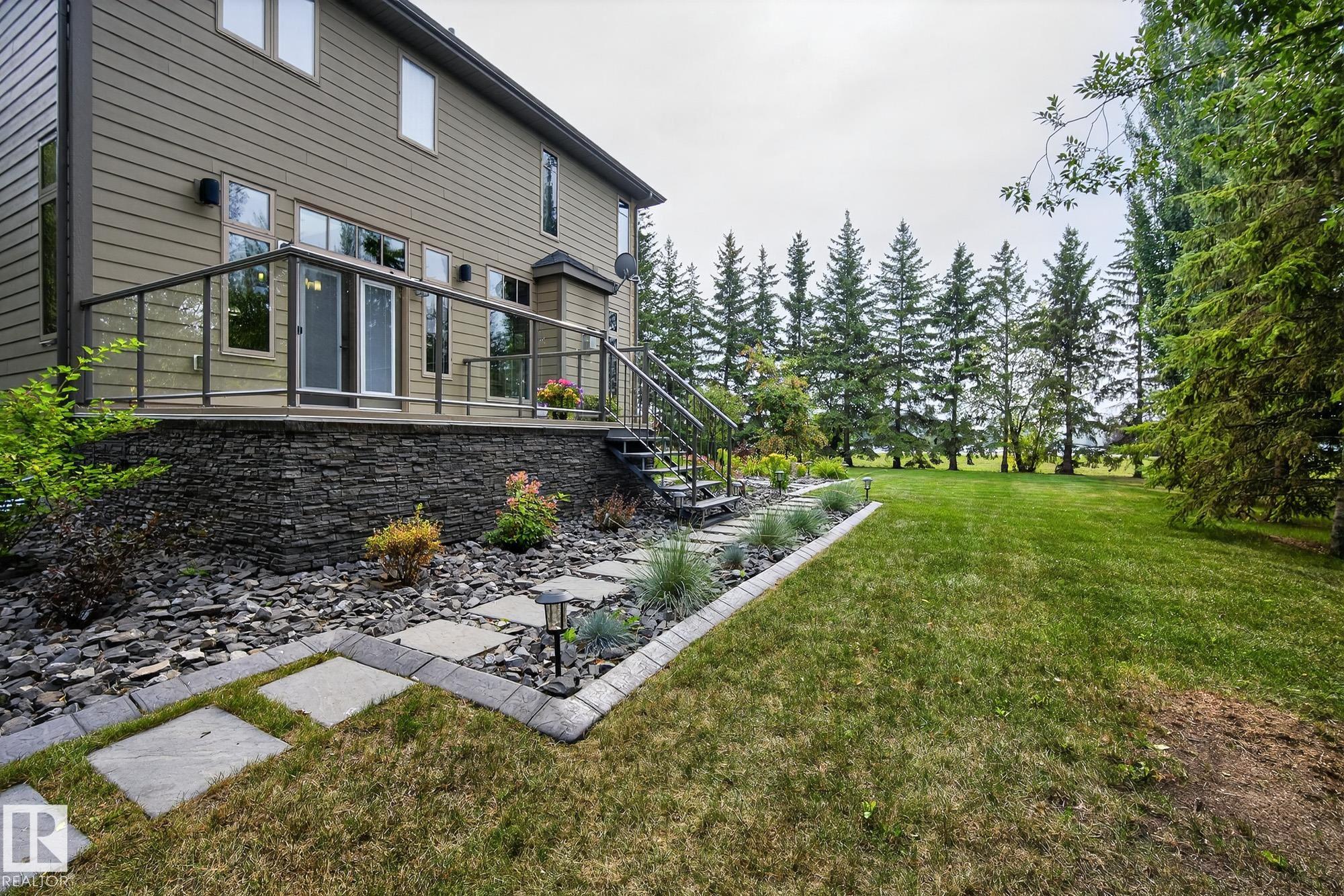 FORMER BROOKHAVEN SHOWHOME on 1.55 acres located ACROSS FROM SANDPIPER GOLF COURSE & under 5 MINUTES WEST OF ST. ALBERT! Unique 4-level split dream home featuring a full custom kitchen by Gem Cabinets, dark wood beams & stone pillars on the main level, floor-to-ceiling windows to enjoy your tree-line views, curved wood open tread stair case leading to your huge den + bonus room and screened-in upper patio by Suncoast Enclosures. Upstairs you'll find 3 bedrooms & 2 full bathrooms including a spacious primary retreat looking out onto the trees. The basement is fully-finished w/ a 4th bedroom, projector TV area & large storage room. Your vehicles will stay cozy all winter long in your fully finished & heated triple attached garage. Outside, you can bring your acreage dreams to life with lots of space to build a secondary shop. And yes, you have FIBRE INTERNET! Enjoy the amenities of city living paired with the serenity + green space of rural life. Welcome home!