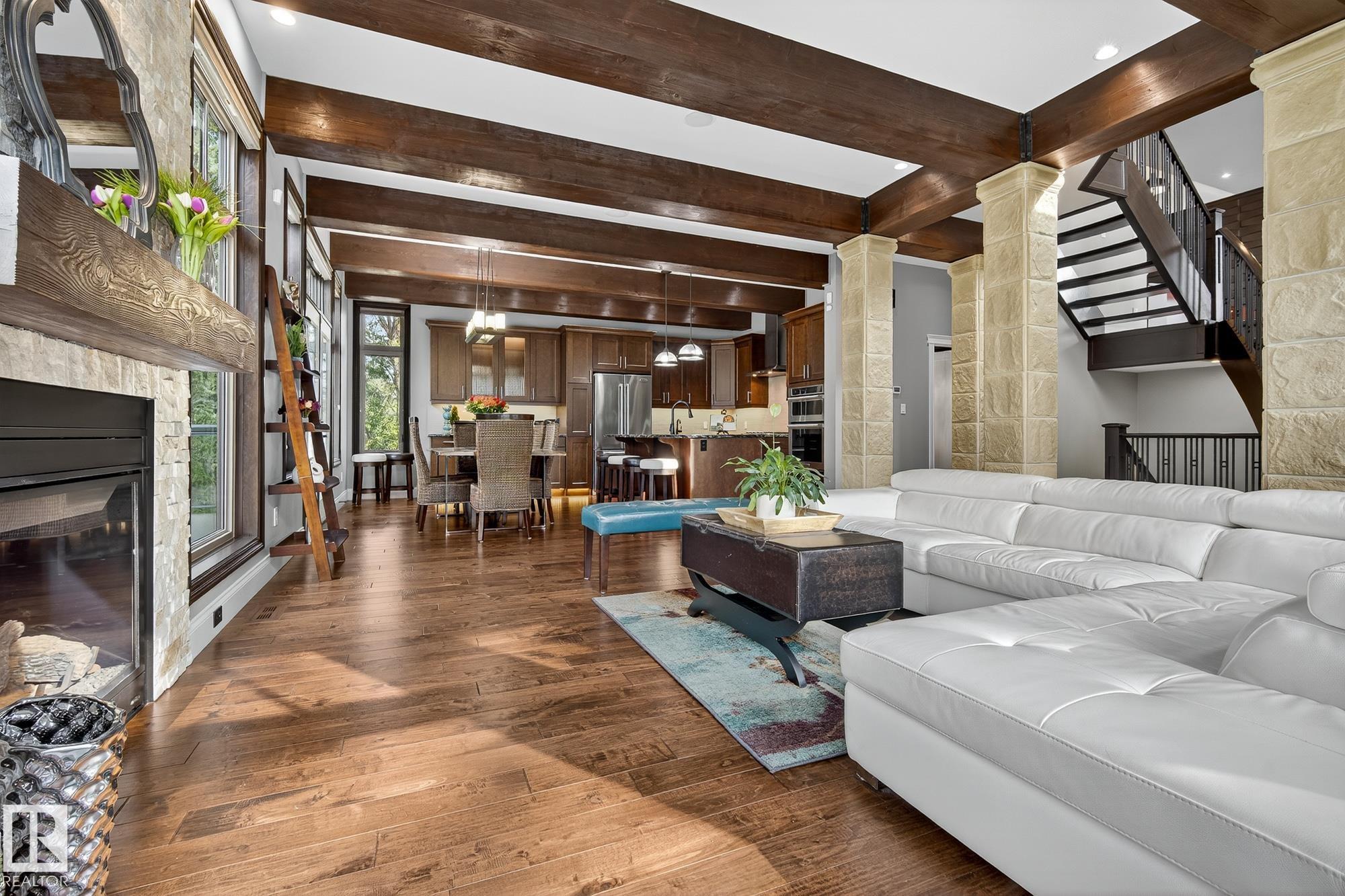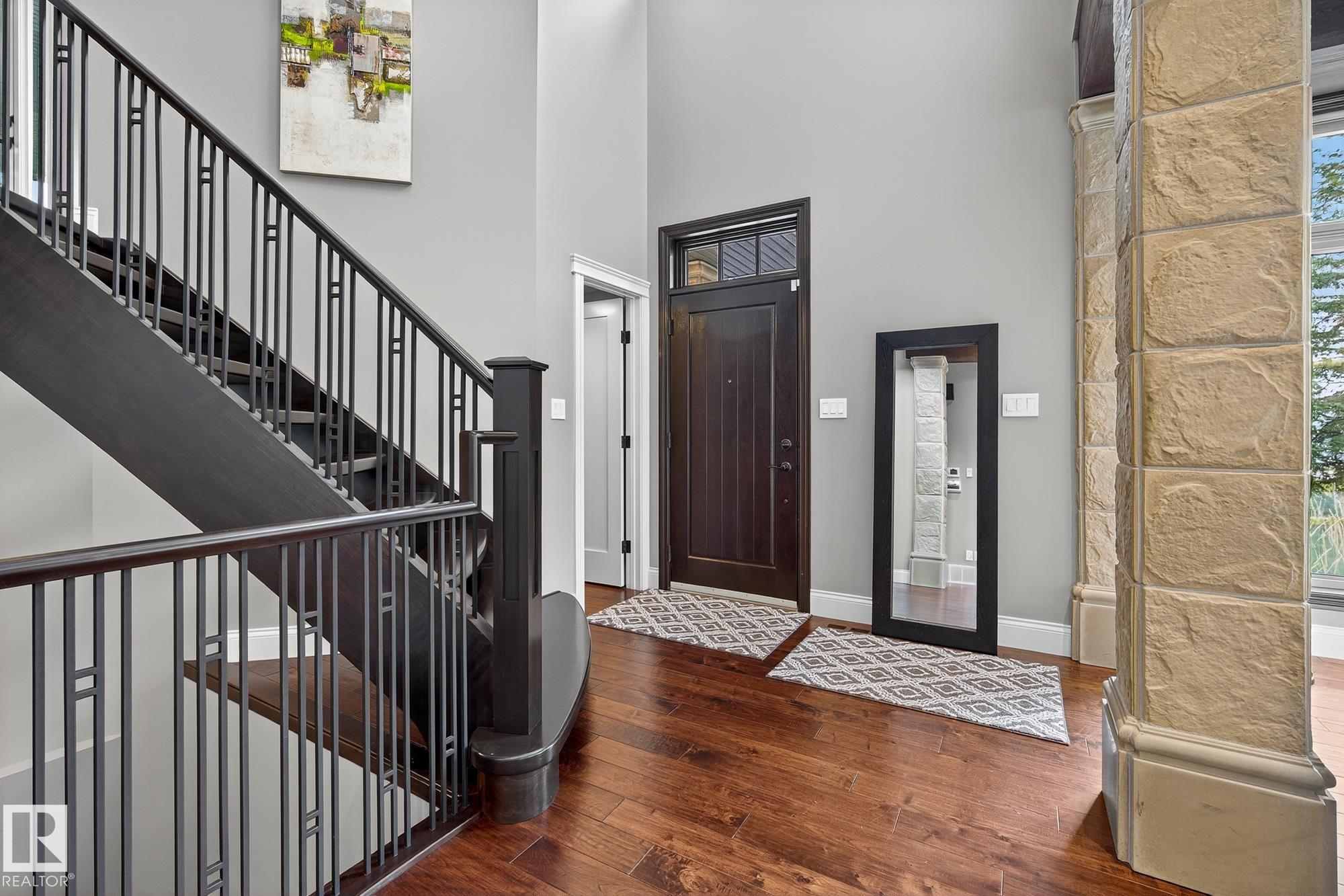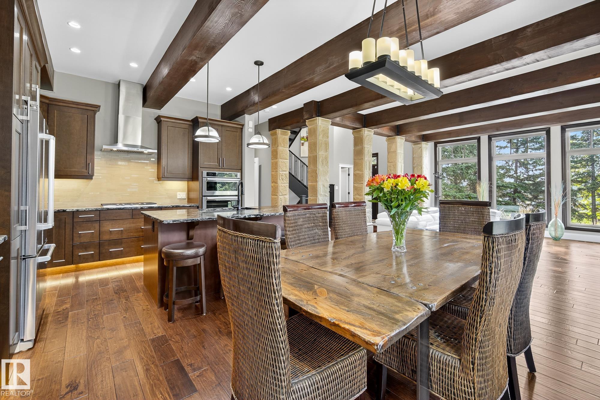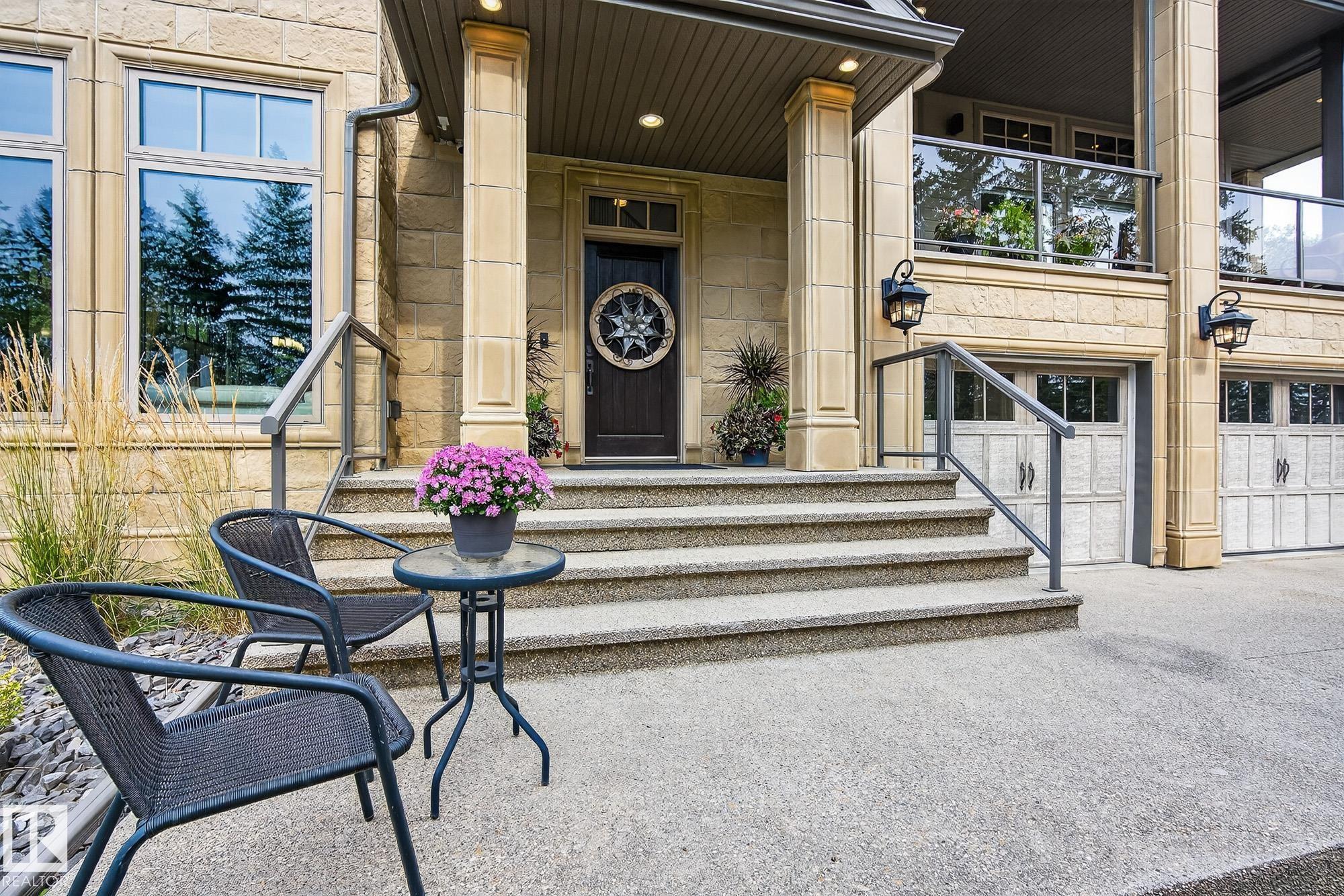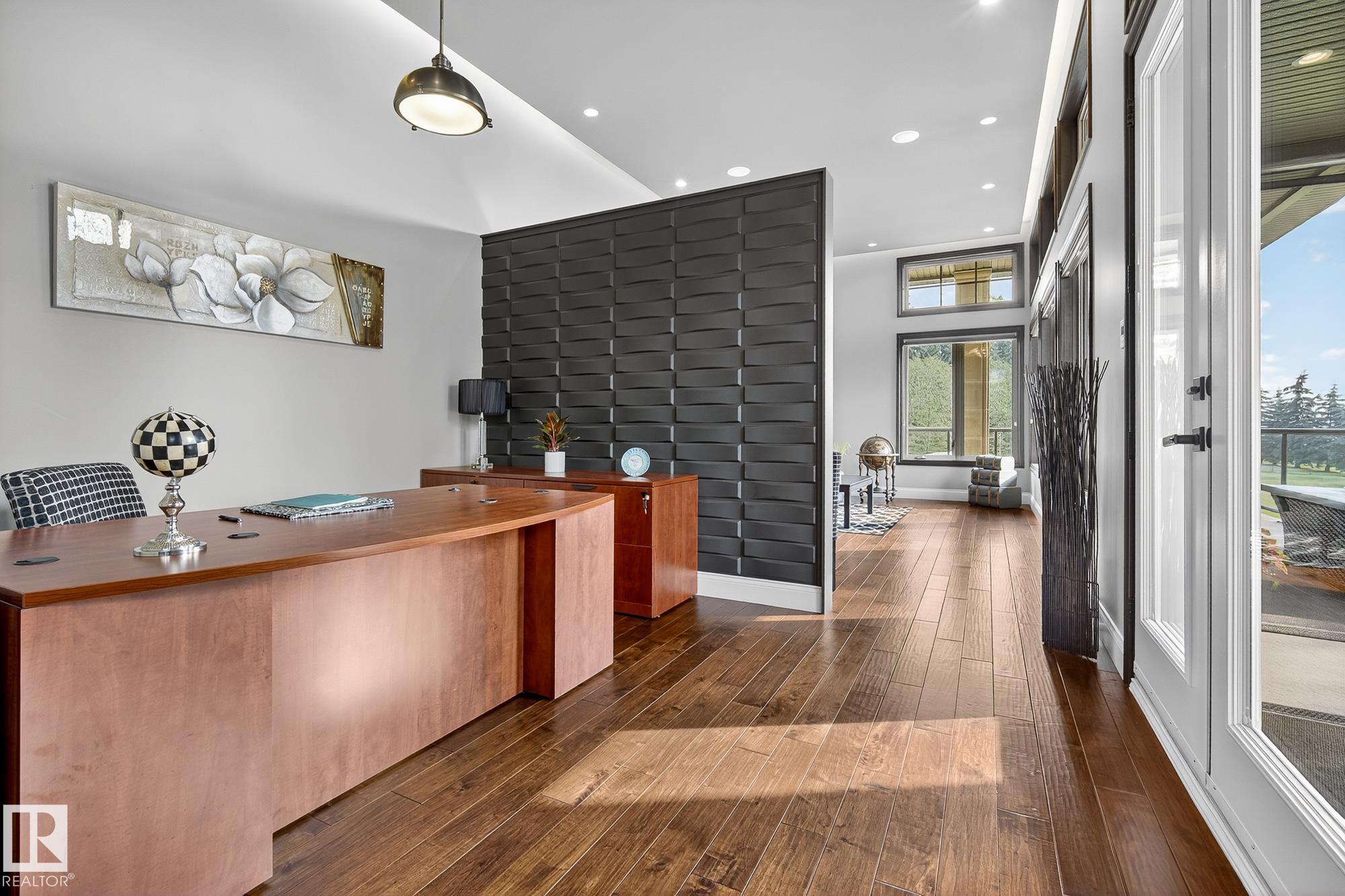 FORMER BROOKHAVEN SHOWHOME on 1.55 acres located ACROSS FROM SANDPIPER GOLF COURSE & under 5 MINUTES WEST OF ST. ALBERT! Unique 4-level split dream home featuring a full custom kitchen by Gem Cabinets, dark wood beams & stone pillars on the main level, floor-to-ceiling windows to enjoy your tree-line views, curved wood open tread stair case leading to your huge den + bonus room and screened-in upper patio by Suncoast Enclosures. Upstairs you'll find 3 bedrooms & 2 full bathrooms including a spacious primary retreat looking out onto the trees. The basement is fully-finished w/ a 4th bedroom, projector TV area & large storage room. Your vehicles will stay cozy all winter long in your fully finished & heated triple attached garage. Outside, you can bring your acreage dreams to life with lots of space to build a secondary shop. And yes, you have FIBRE INTERNET! Enjoy the amenities of city living paired with the serenity + green space of rural life. Welcome home!