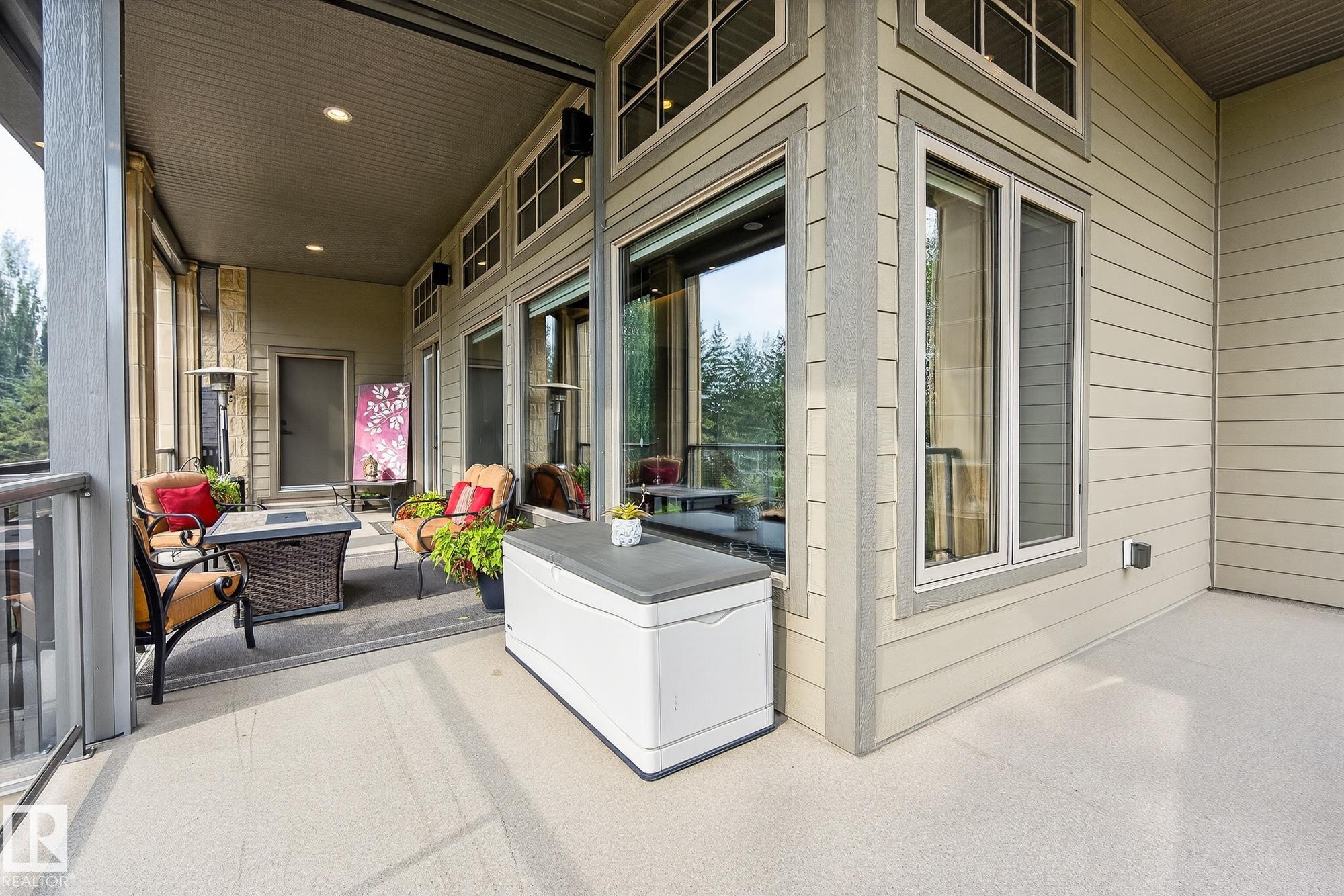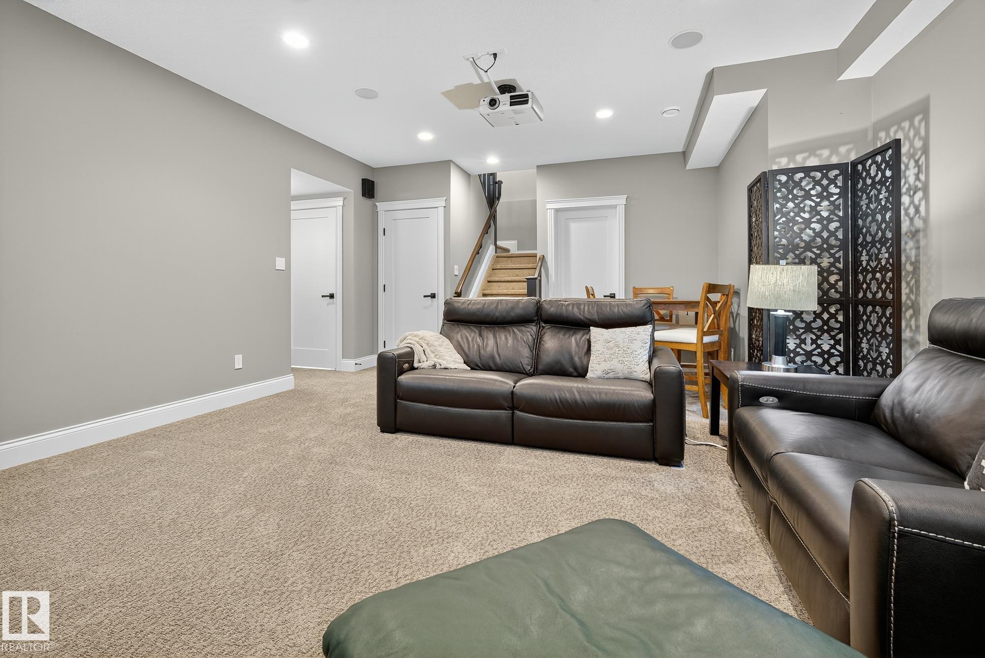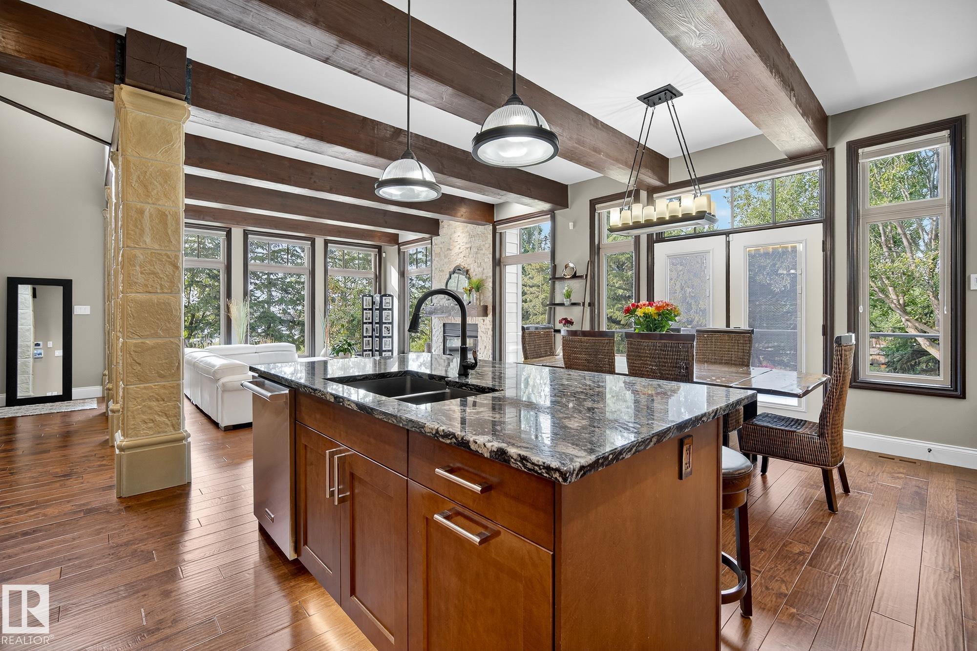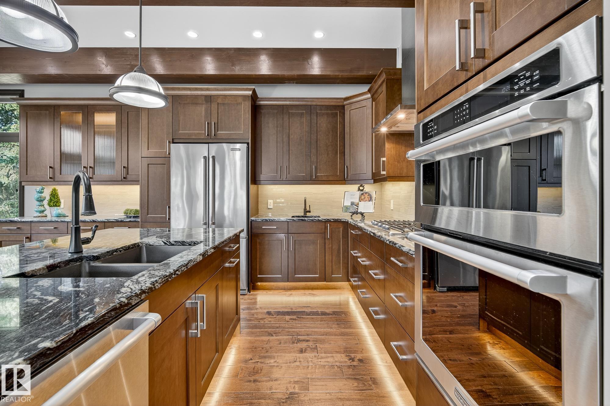 FORMER BROOKHAVEN SHOWHOME on 1.55 acres located ACROSS FROM SANDPIPER GOLF COURSE & under 5 MINUTES WEST OF ST. ALBERT! Unique 4-level split dream home featuring a full custom kitchen by Gem Cabinets, dark wood beams & stone pillars on the main level, floor-to-ceiling windows to enjoy your tree-line views, curved wood open tread stair case leading to your huge den + bonus room and screened-in upper patio by Suncoast Enclosures. Upstairs you'll find 3 bedrooms & 2 full bathrooms including a spacious primary retreat looking out onto the trees. The basement is fully-finished w/ a 4th bedroom, projector TV area & large storage room. Your vehicles will stay cozy all winter long in your fully finished & heated triple attached garage. Outside, you can bring your acreage dreams to life with lots of space to build a secondary shop. And yes, you have FIBRE INTERNET! Enjoy the amenities of city living paired with the serenity + green space of rural life. Welcome home!
