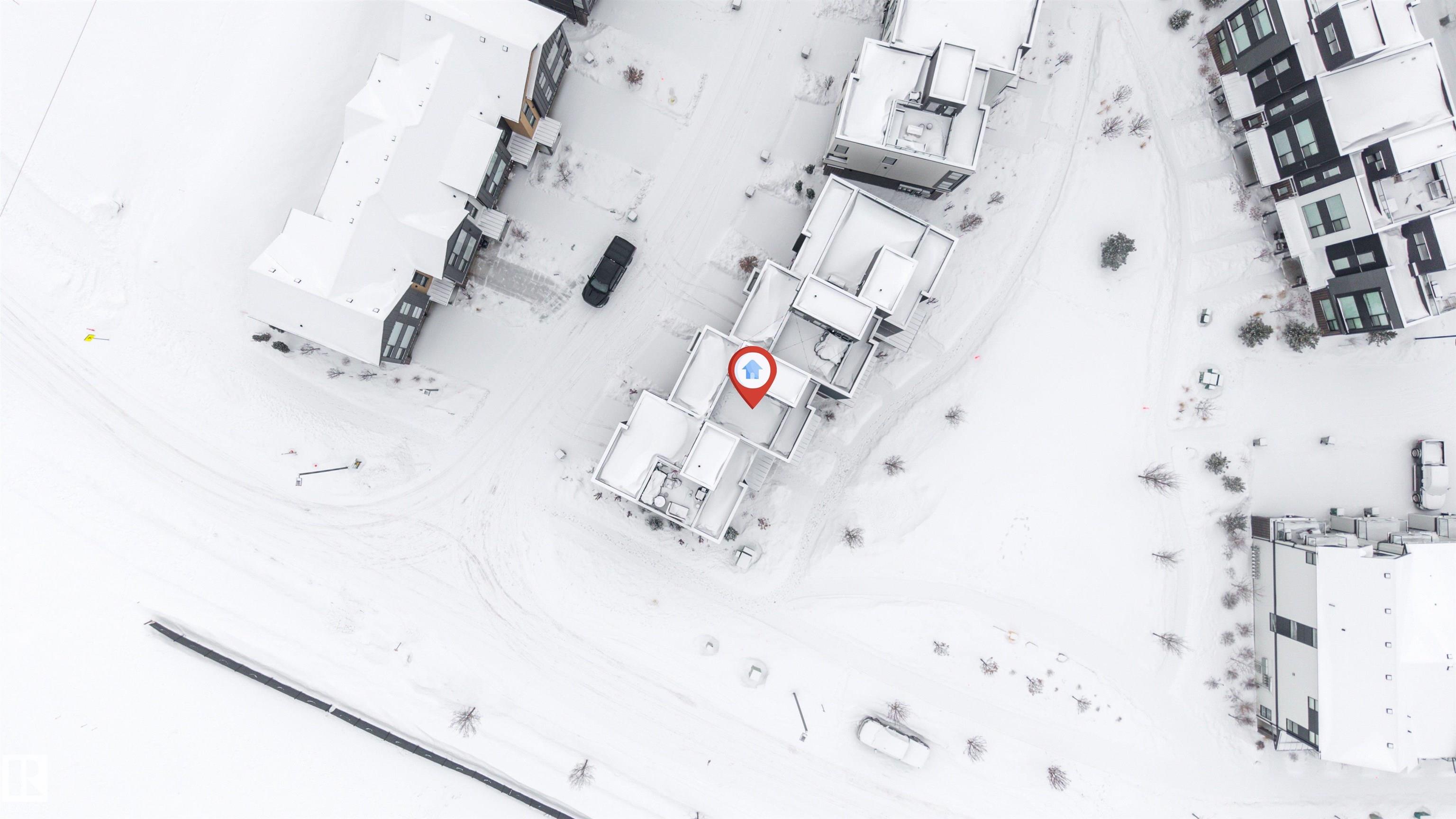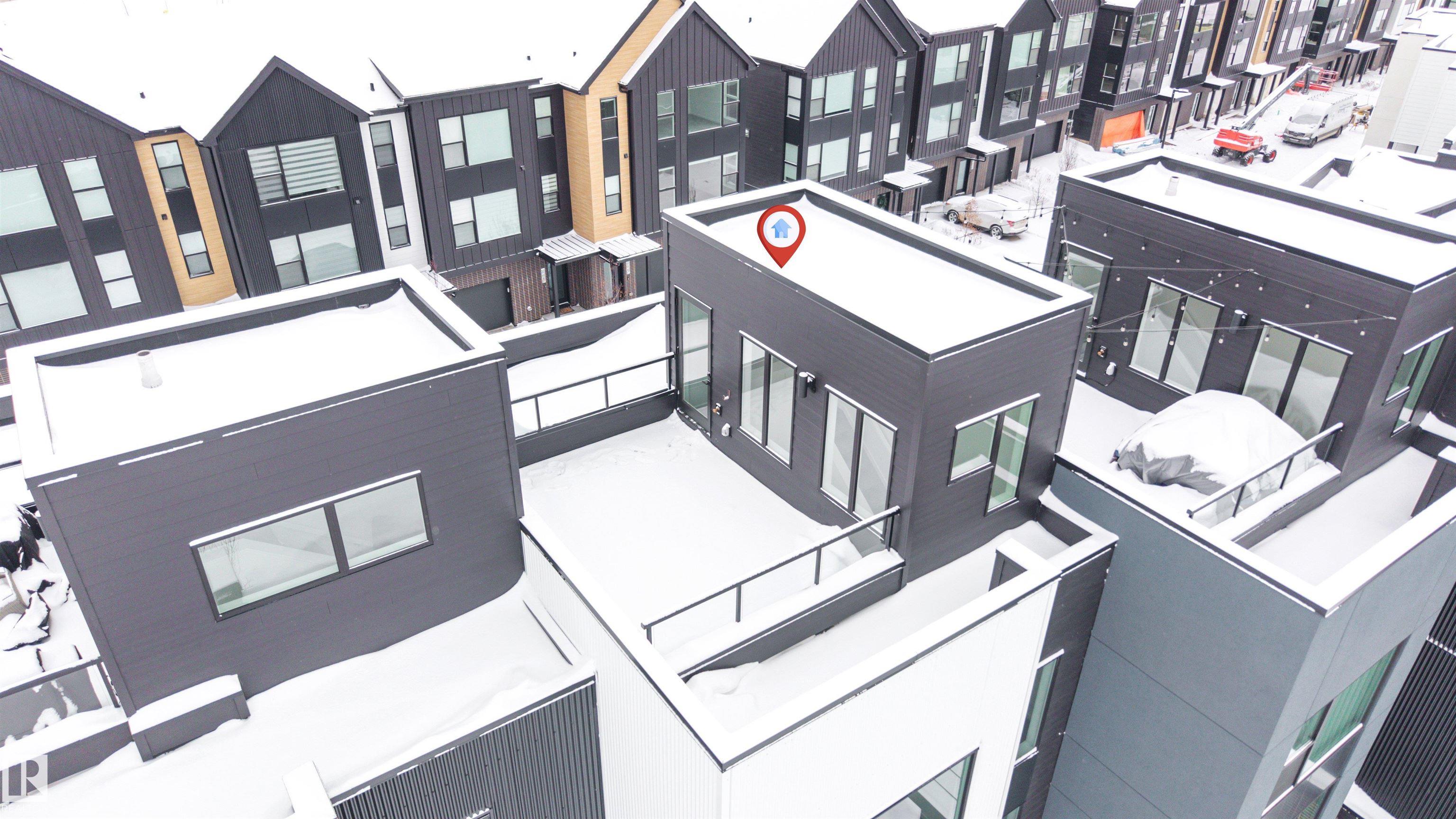 FLAT ROOF PATIO!! This stunning COURTYARD -facing townhouse W/ DOUBLE ATTACHED GARAGE and A/C in the heart of Midtown, just a 1-minute walk to the Enjoy Centre. With some of the best views in all of Midtown, this home combines modern design, high-end finishes, and a perfect location. Inside, bold grey, rich wood tones set the stage for a warm, contemporary feel. The upgraded kitchen features quartz countertops, full-height backsplash, matte black faucet and hardware, floating shelves, chimney hood fan, and bar fridge extension--ideal for cooking and entertaining. Vinyl tile flows through the powder room, kitchen, dining area, great room, and sopra, while carpet adds comfort in bedrooms, stairwells, and walk-in closets. Both bedrooms feature private ensuites, offering ultimate comfort and privacy. Step outside to your flat roof patio -- perfect for relaxing or entertaining, with potential for solar panels. James Hardie(TM) siding, Upgraded matte black plumbing fixtures, and UPGRADED blinds are included.